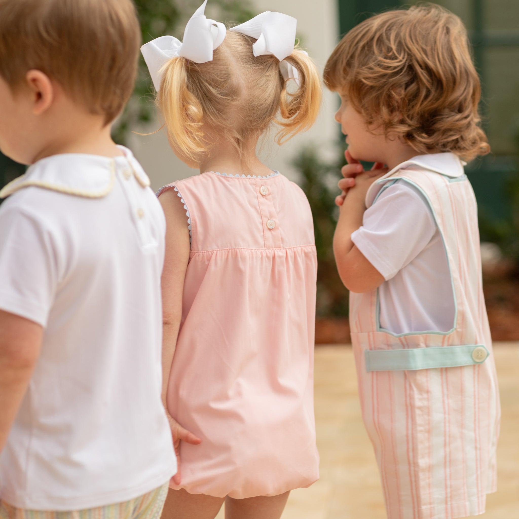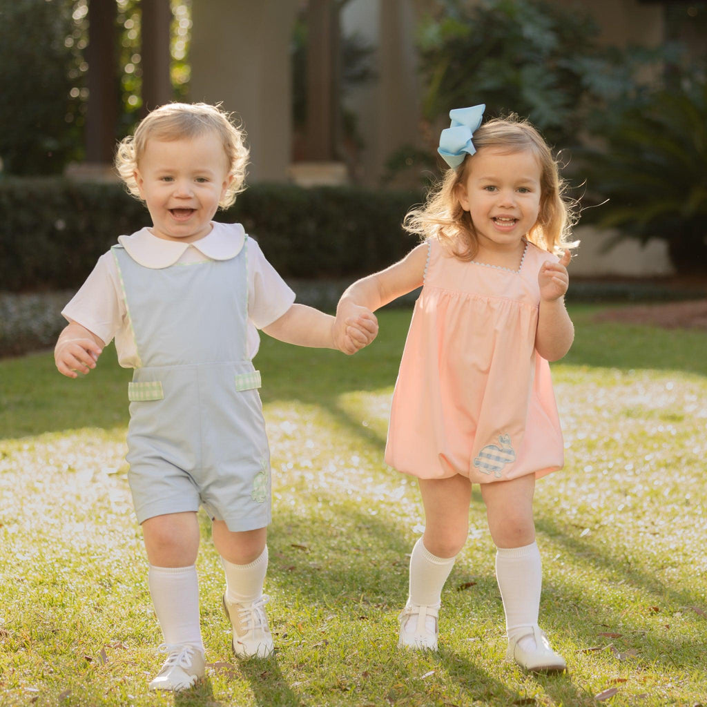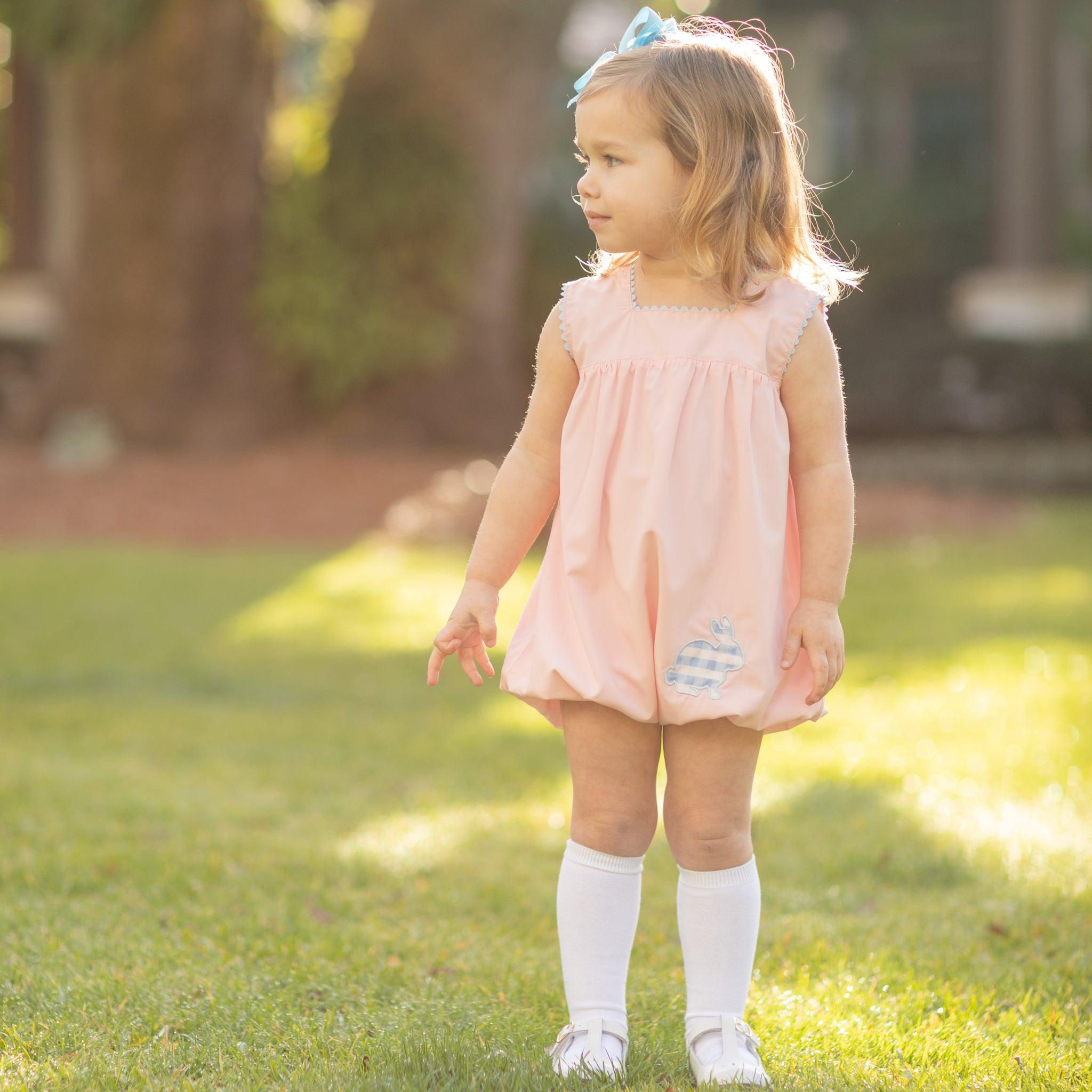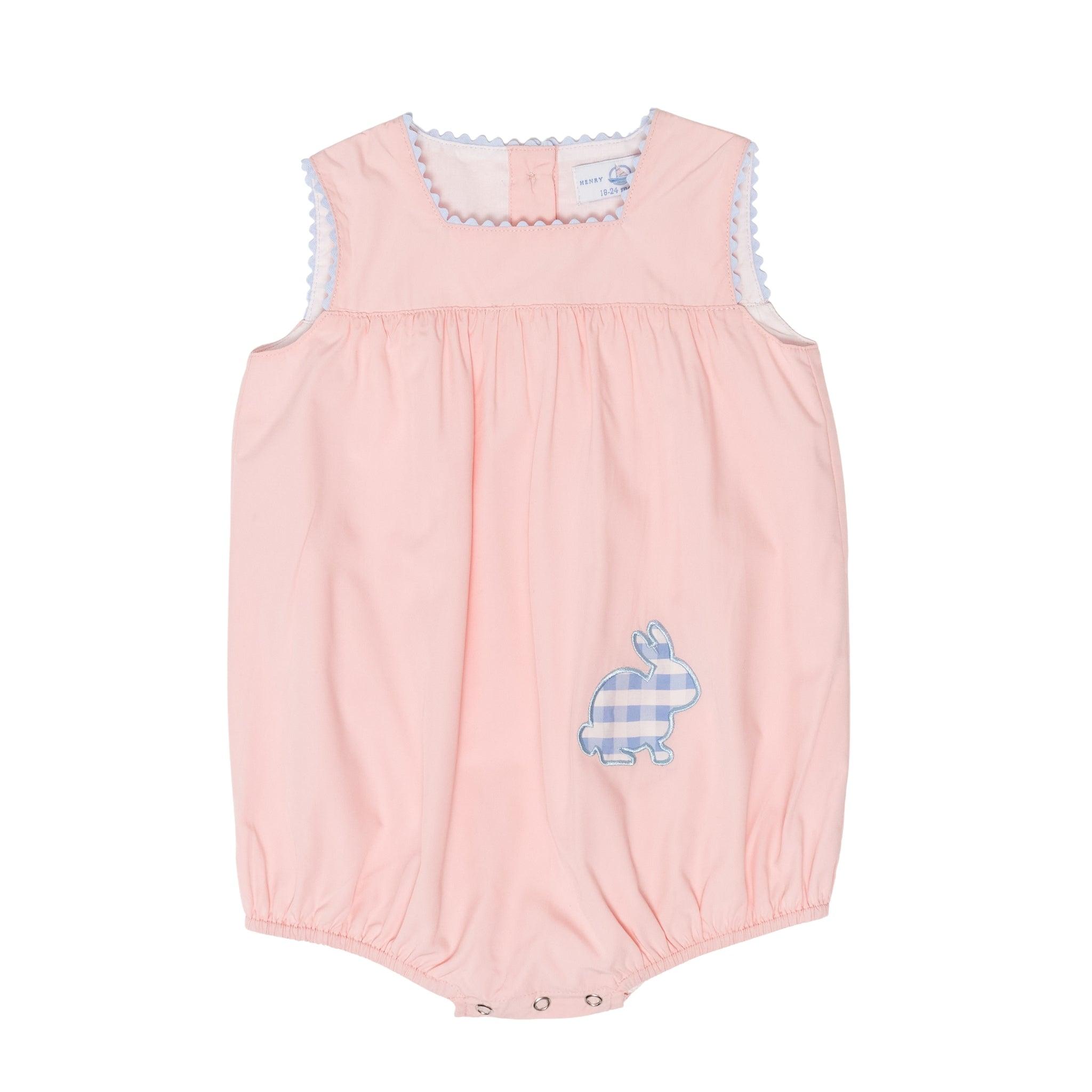 Our Palmer Bubble is as sweet as she is. In the softest shade of pink, it features our gingham bunny to coordinate with our entire Easter line for easy sibling coordination. Made of soft, non-wrinkle bamboo blend, it's easy to wear and easy to wash.
