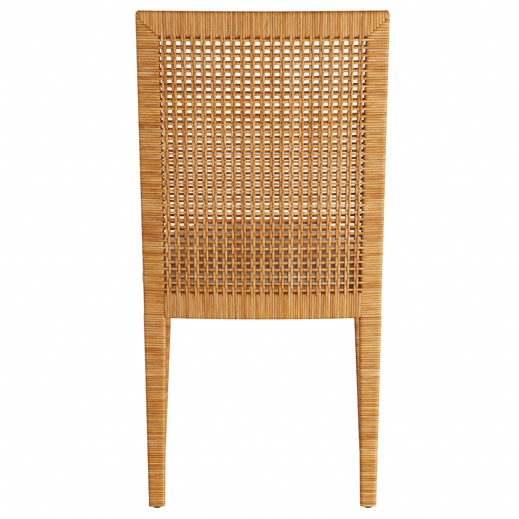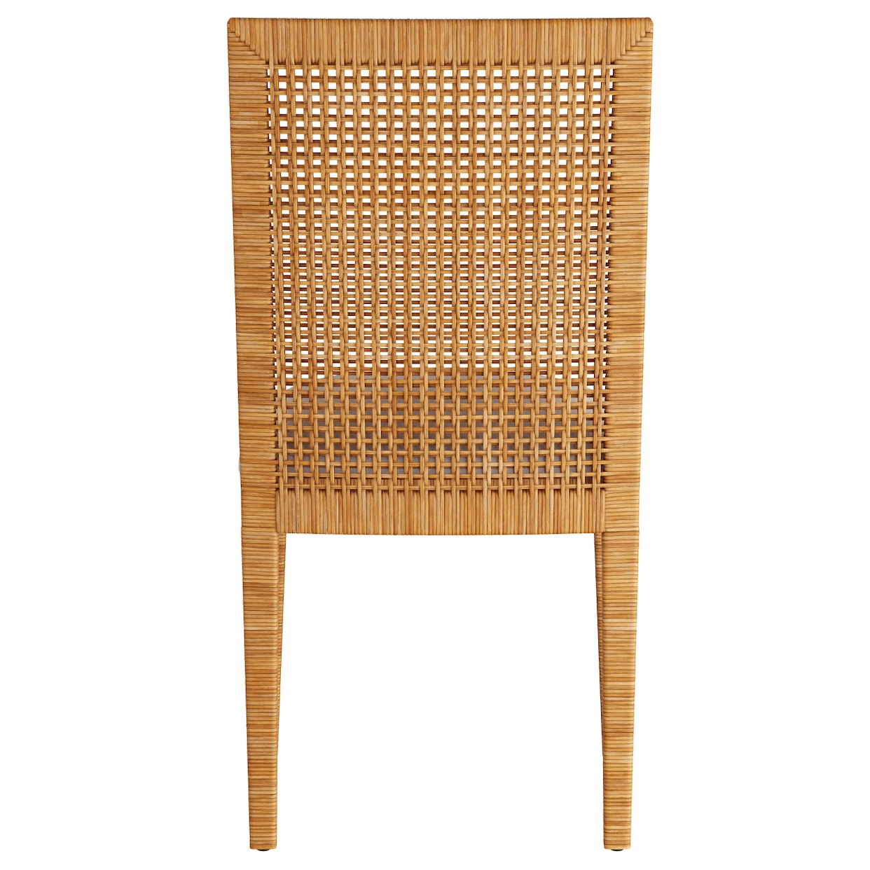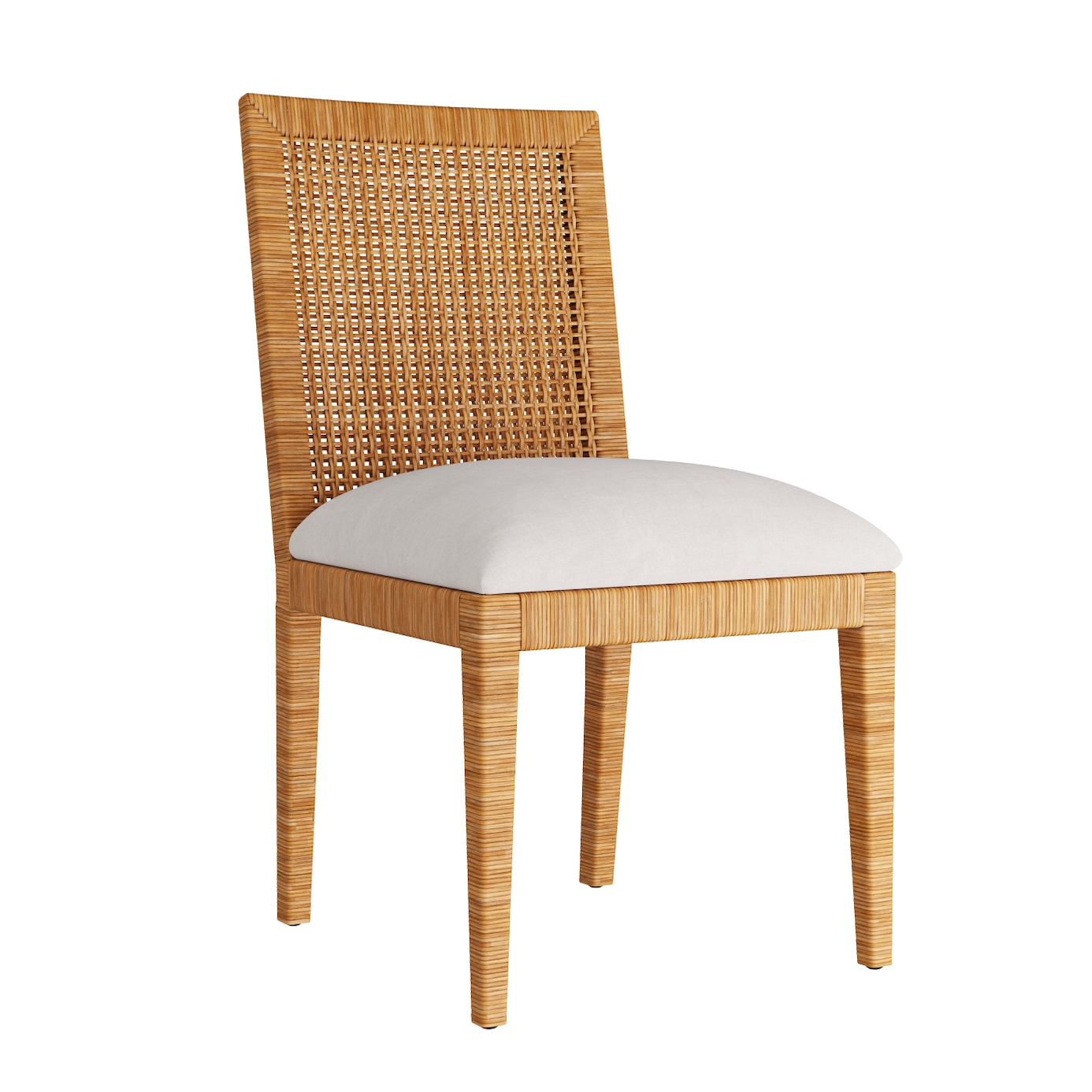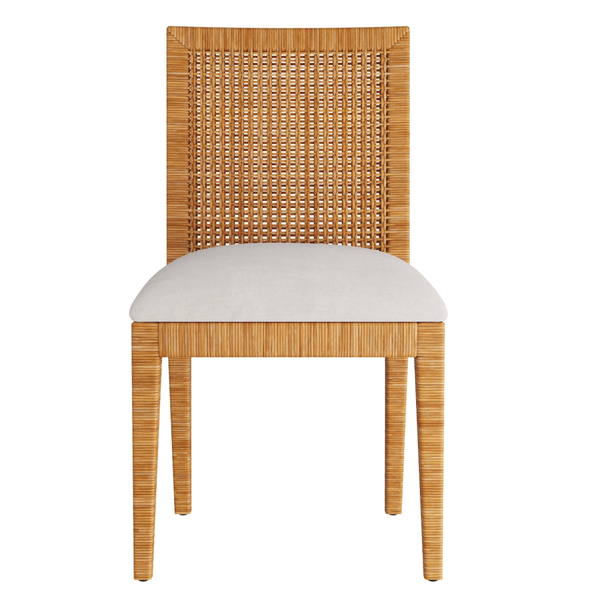 The palmer expresses a relaxed yet refined aesthetic that marries modern lines with the rich appeal of rattan. The striking side chair is designed with natural rattan that wraps the chair’s mahogany frame and forms the caning on the arm panels and back rest. The seat is upholstered in breezy, bright white muslin for recovering. Finishes will vary.