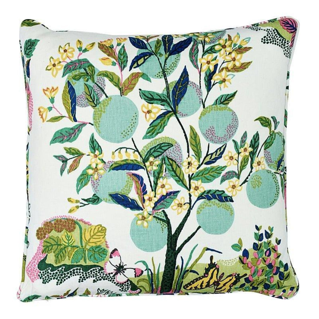 This Schumacher pillow features Citrus Garden with a Self-Welt finish. This archival Josef Frank print, created in 1947, bears the signature whimsy, color and personality for which the designer is known. The hand-drawn pattern has inimitable charm.
