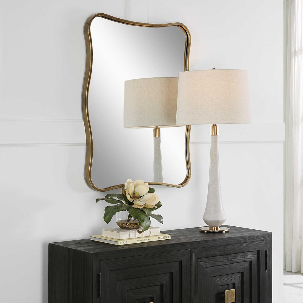 This curvy vanity mirror features a shaped iron frame finished in heavily antiqued gold. May be hung horizontally or vertically.