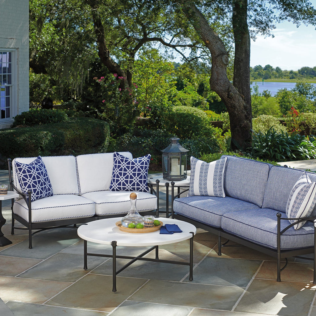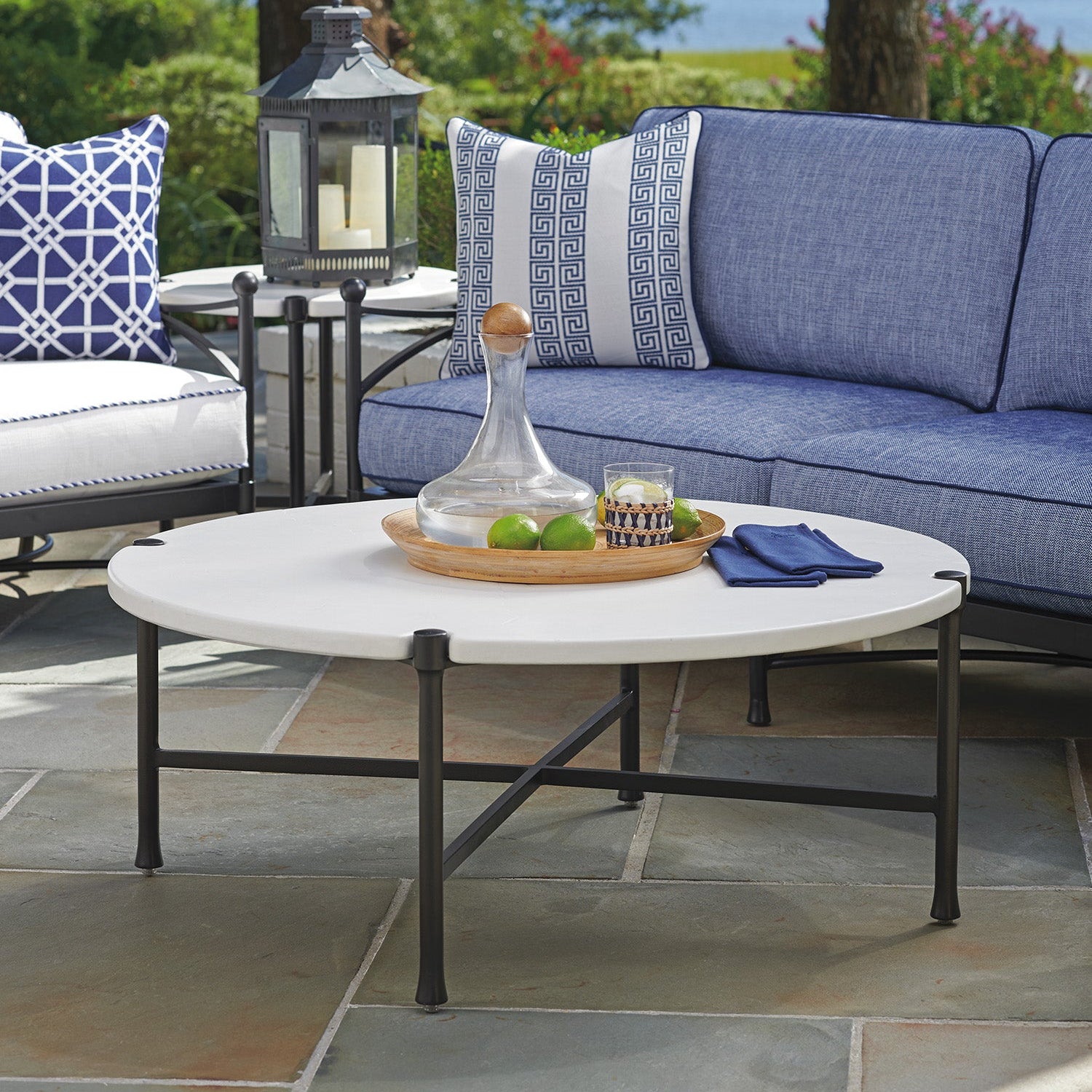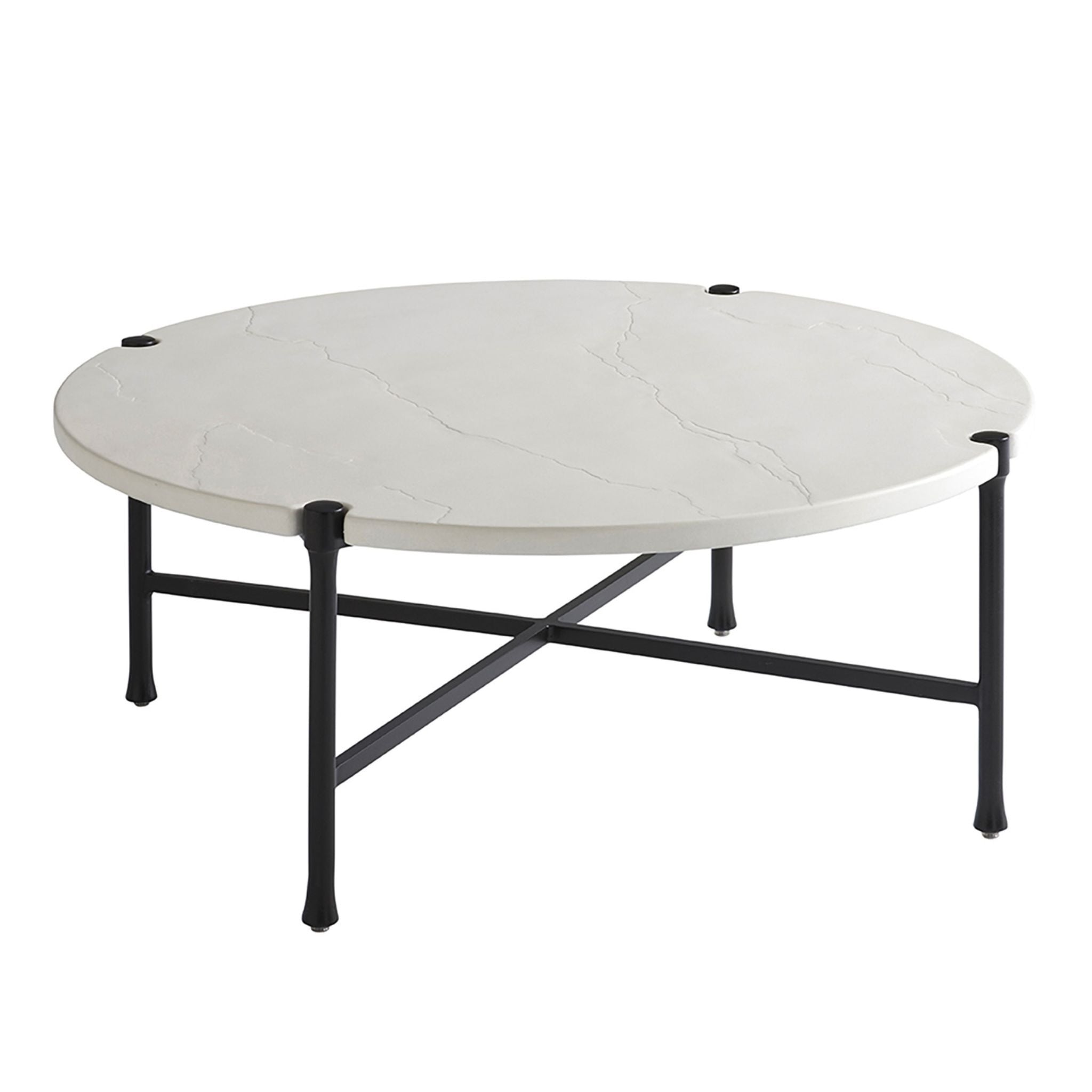 Elevate your outdoor living space with the Tommy Bahama Outdoor Pavlova Round Cocktail Table. Crafted with a powder-coated aluminum frame in a lightly textured graphite finish, this 44-inch outdoor cocktail table features clean architectural lines, flared legs, and a cross-stretcher base for added style and stability. The all-weather tabletop beautifully mimics the elegance of honed natural limestone in a soft ivory tone.