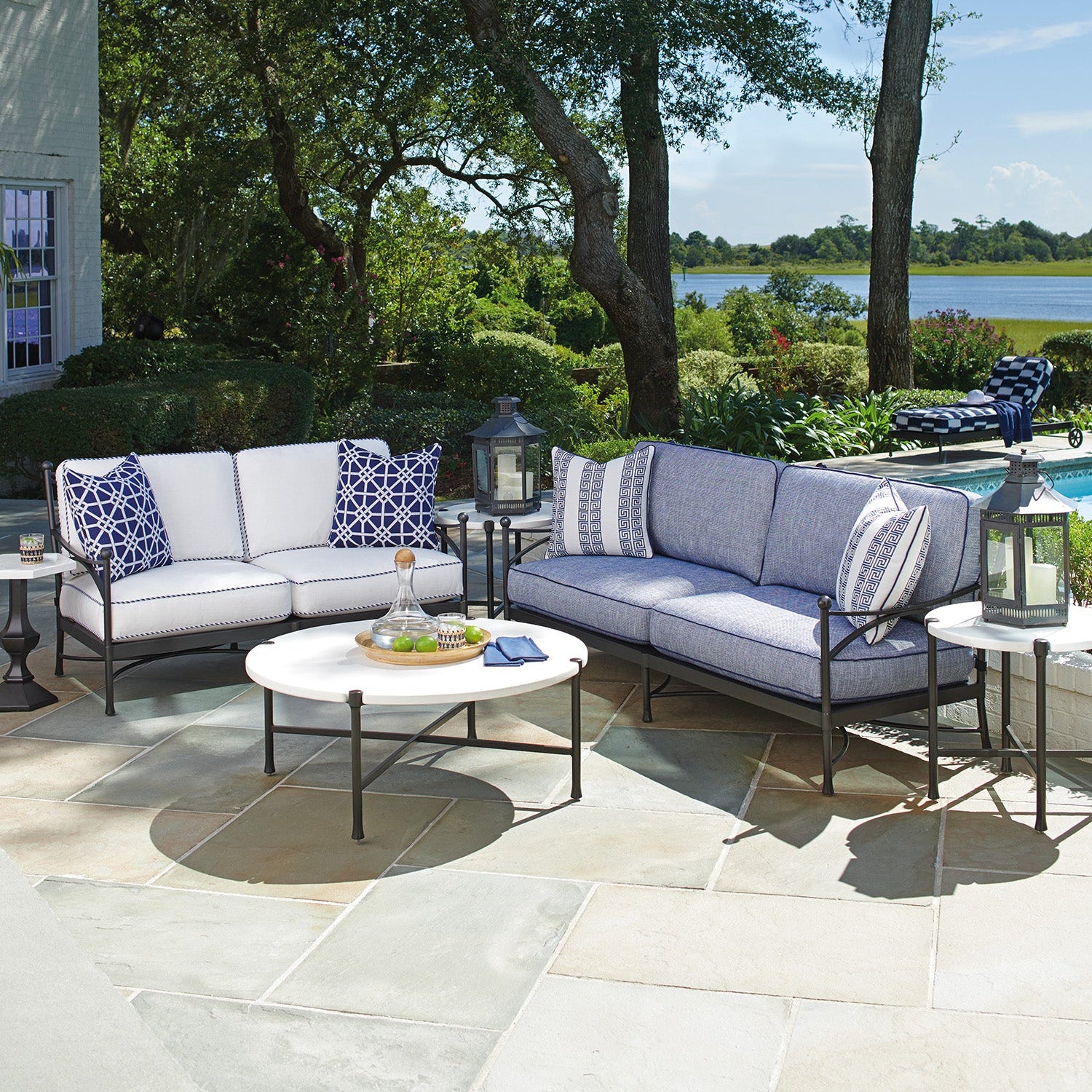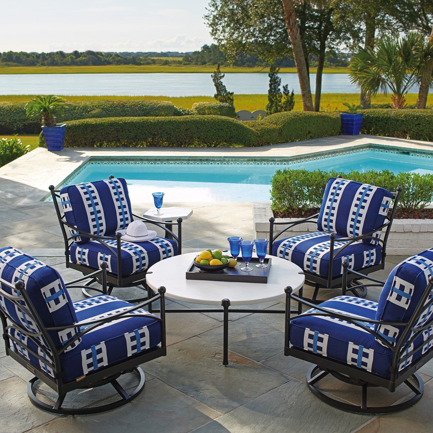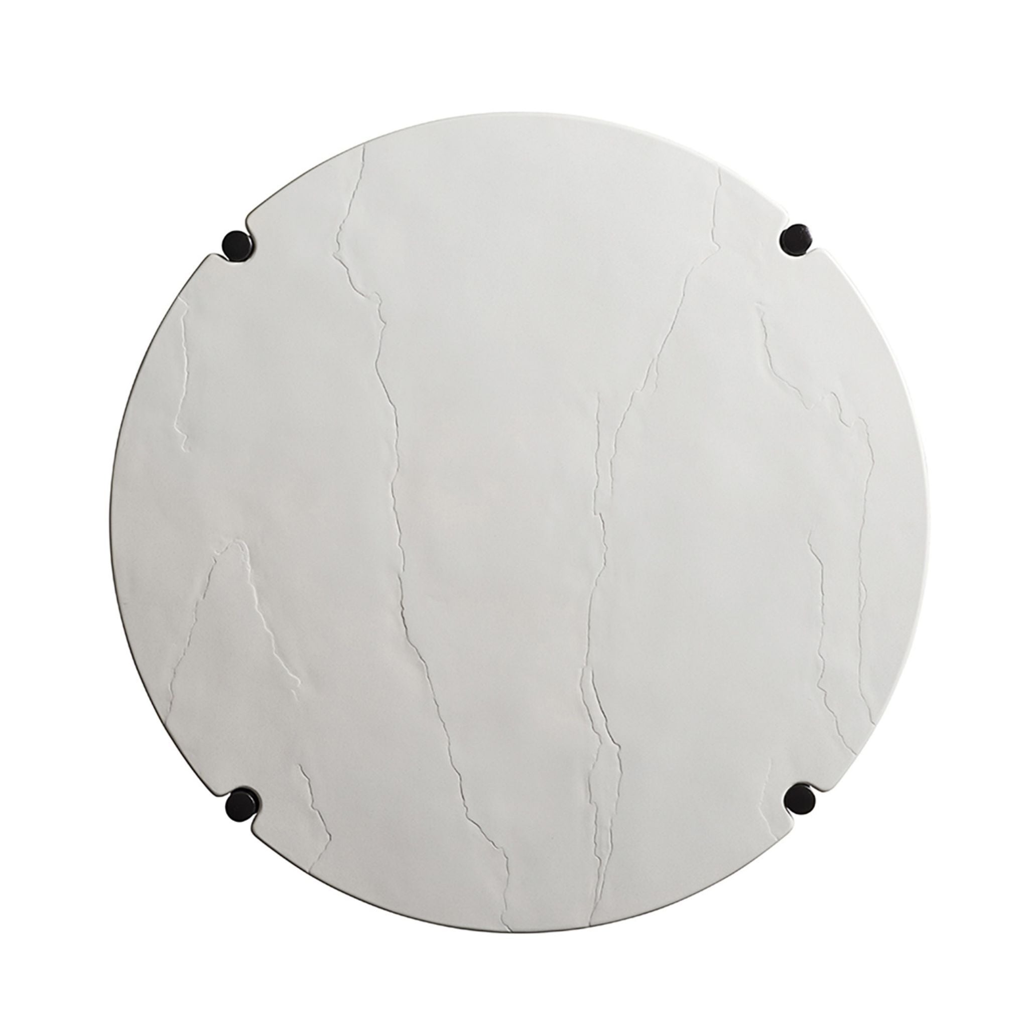 Elevate your outdoor living space with the Tommy Bahama Outdoor Pavlova Round Cocktail Table. Crafted with a powder-coated aluminum frame in a lightly textured graphite finish, this 44-inch outdoor cocktail table features clean architectural lines, flared legs, and a cross-stretcher base for added style and stability. The all-weather tabletop beautifully mimics the elegance of honed natural limestone in a soft ivory tone.