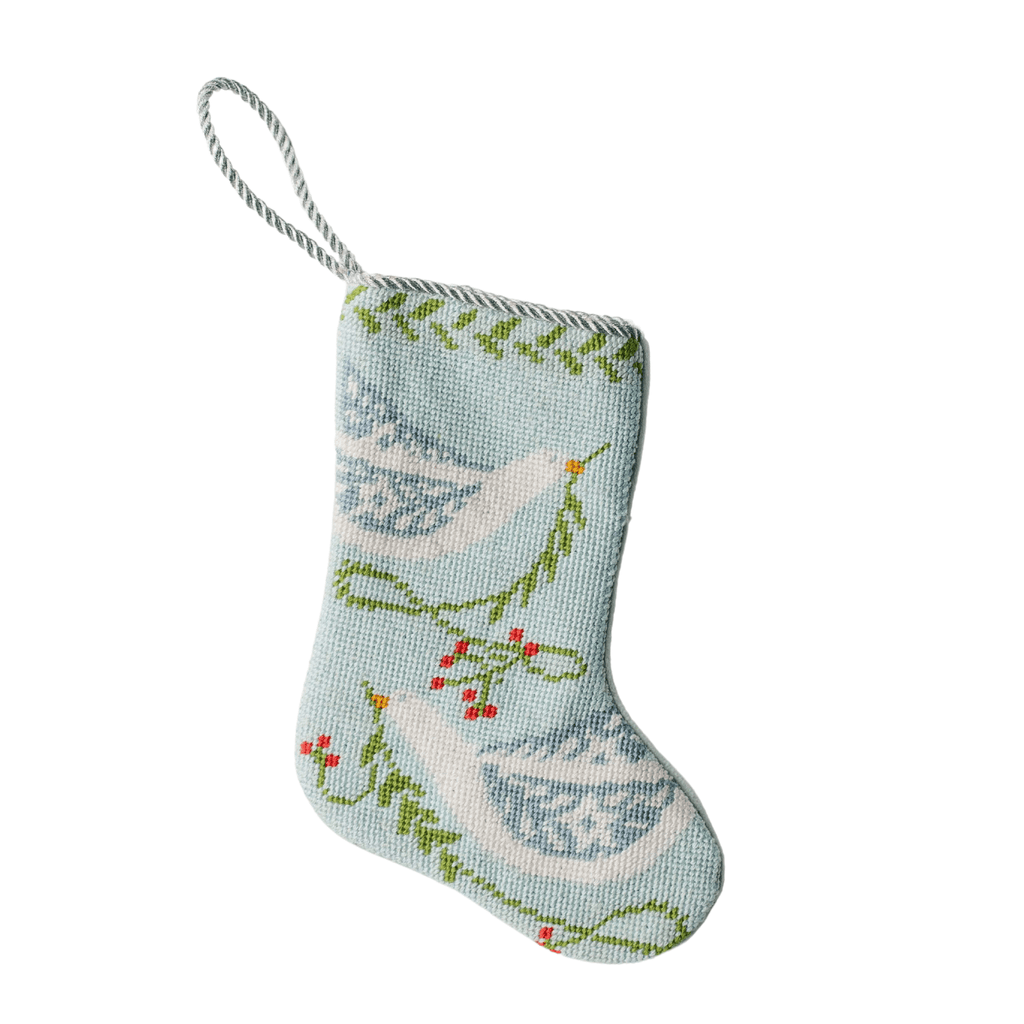 - Hand-stitched needlepoint heirloom stockings with cotton threads and velvet backing.