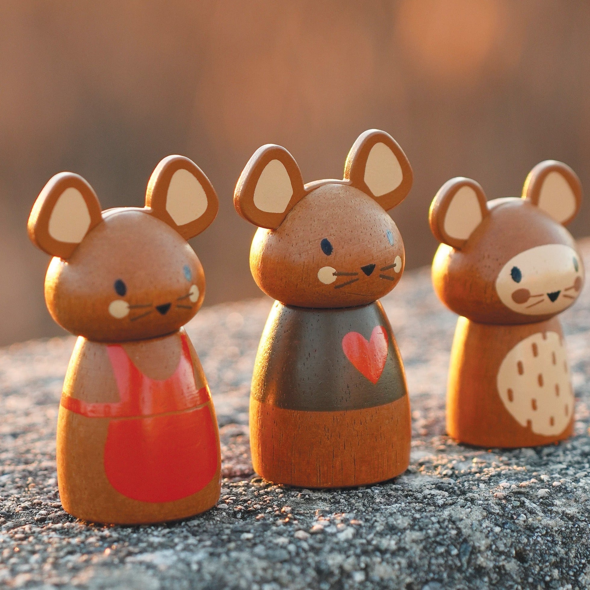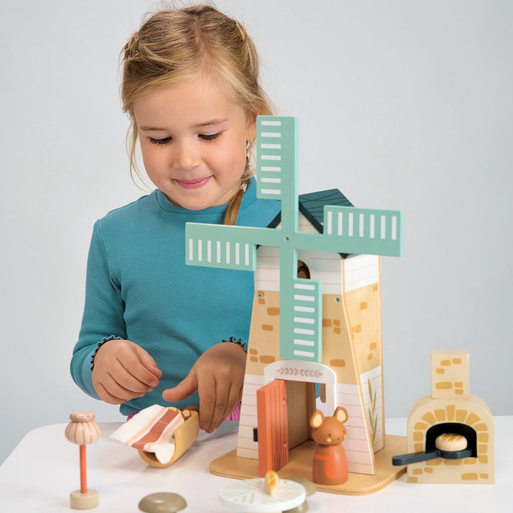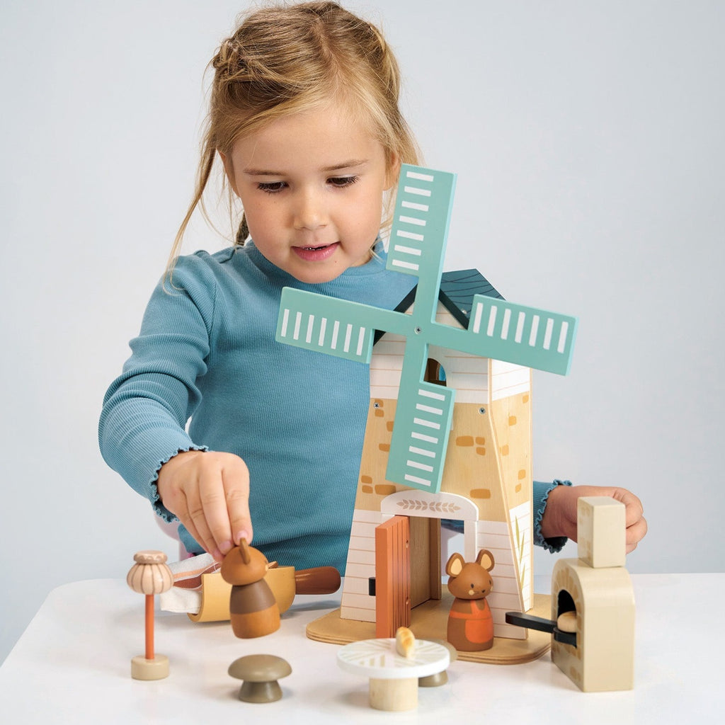 Part of our Merrywood tales range, these three little wooden toy field mice have made a perfect home in a wheat field. The windmill is 2 stories tall and has a revolving windmill which when it turns, raises a small bag up to the second story. Accessories include: a bread oven, 2 loaves of bread, a bread shovel, table and 2 stools, a grain sack, a fabric armchair, a lamp, and a flour scoop that doubles up as a bed for the baby mouse. A wonderful toy for story telling and imaginative play with children.