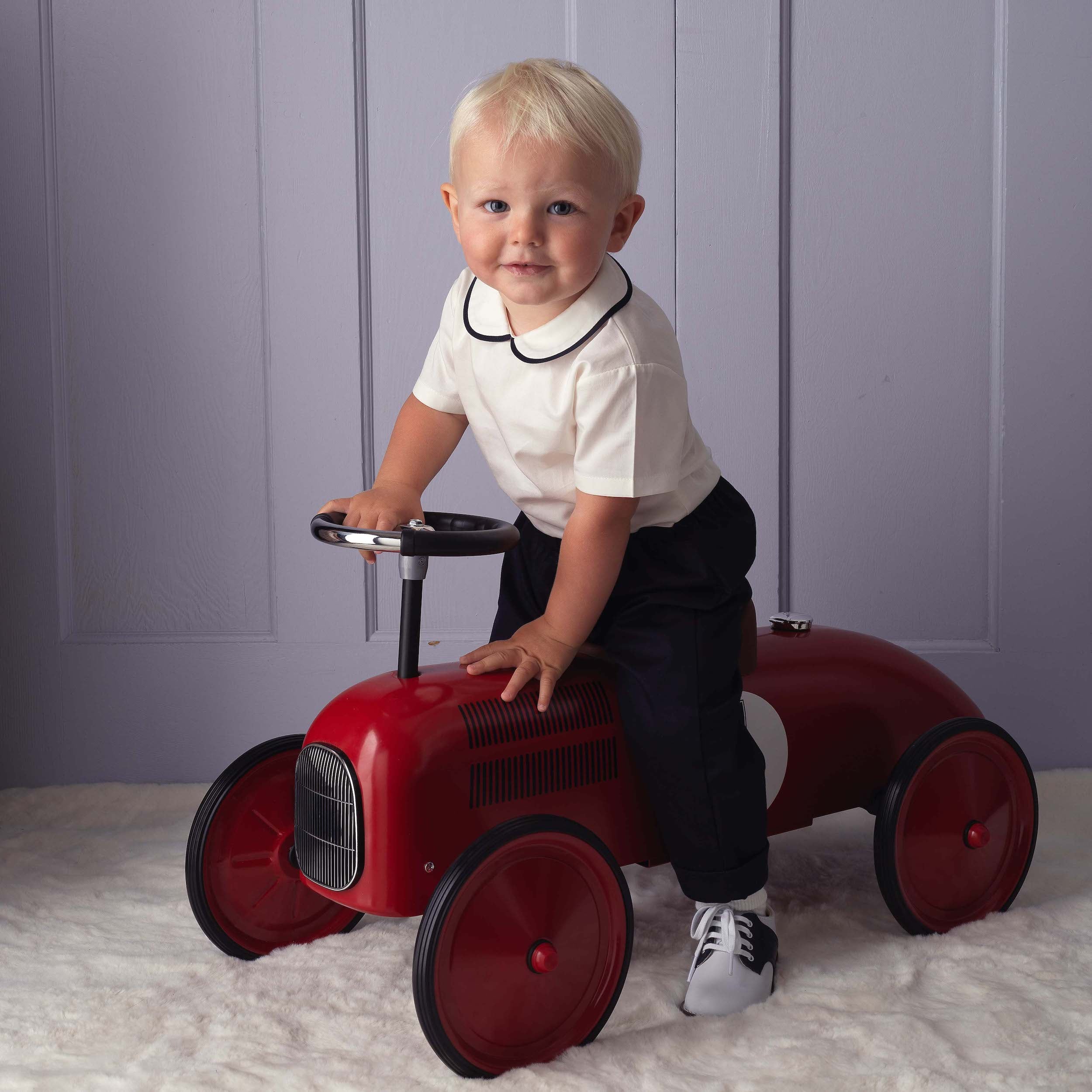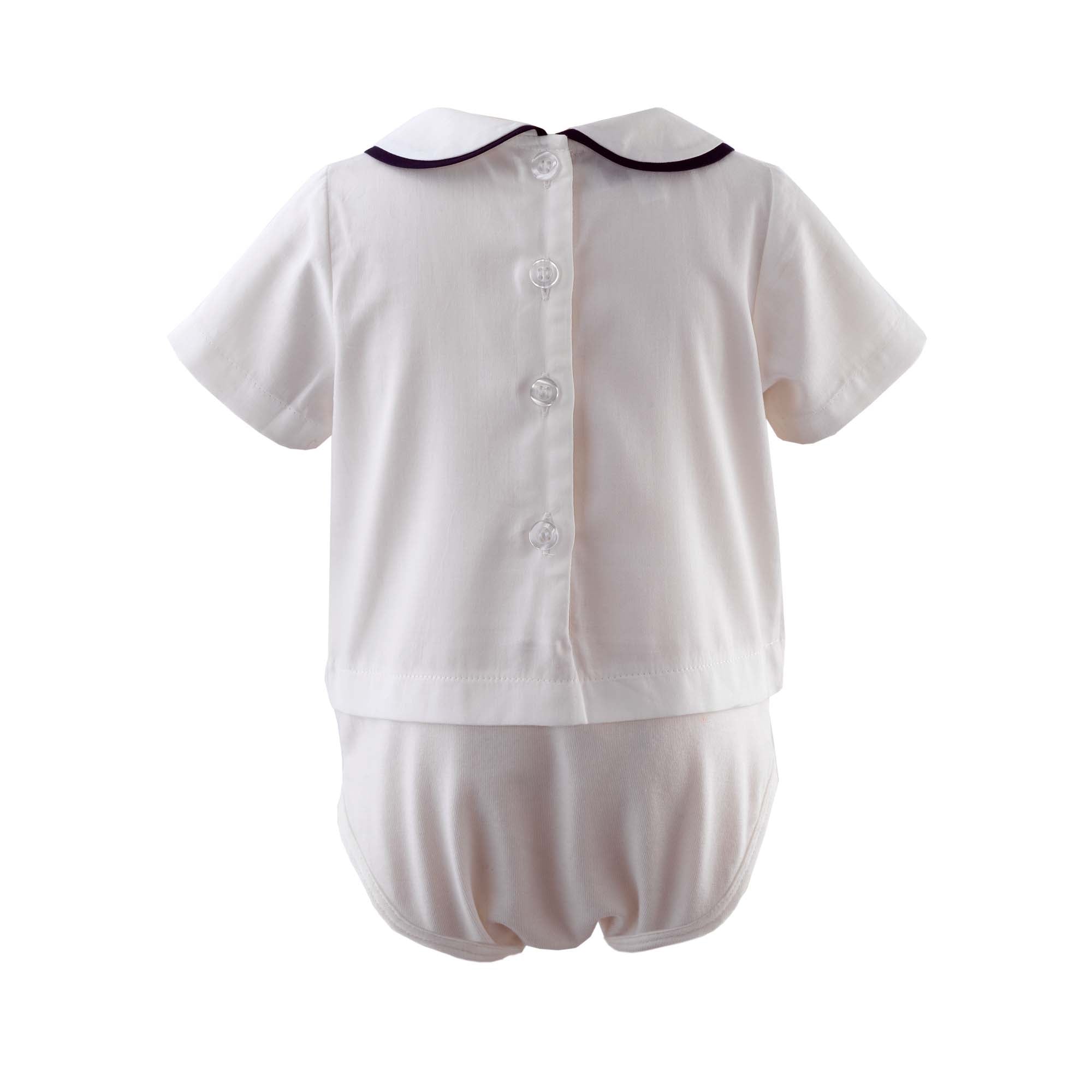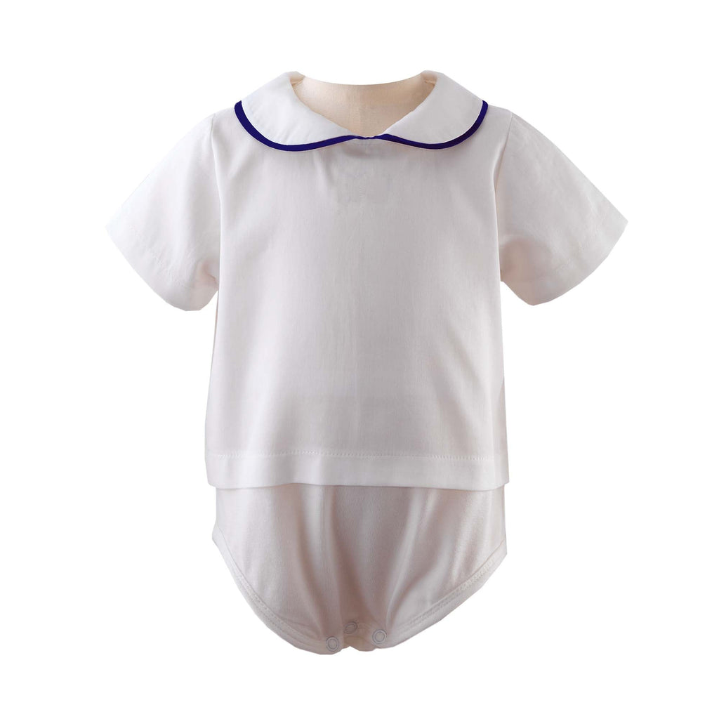 A great layering piece with the appearance of a shirt combined with the function of a body, makes outfitting easy. Peter pan collar woven cotton shirt with jersey body beneath, trimmed in navy. Button opening at the back and snaps at the inner leg for easy changing.