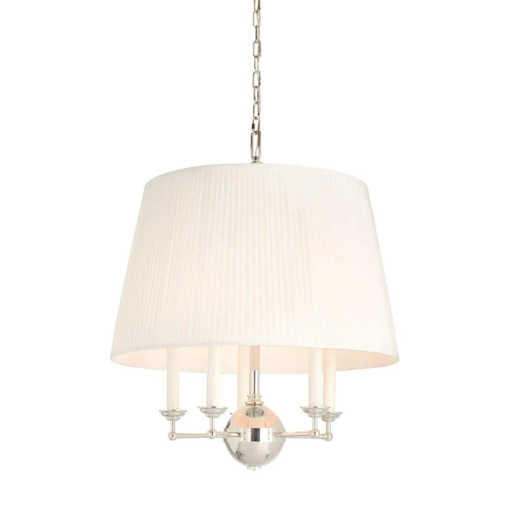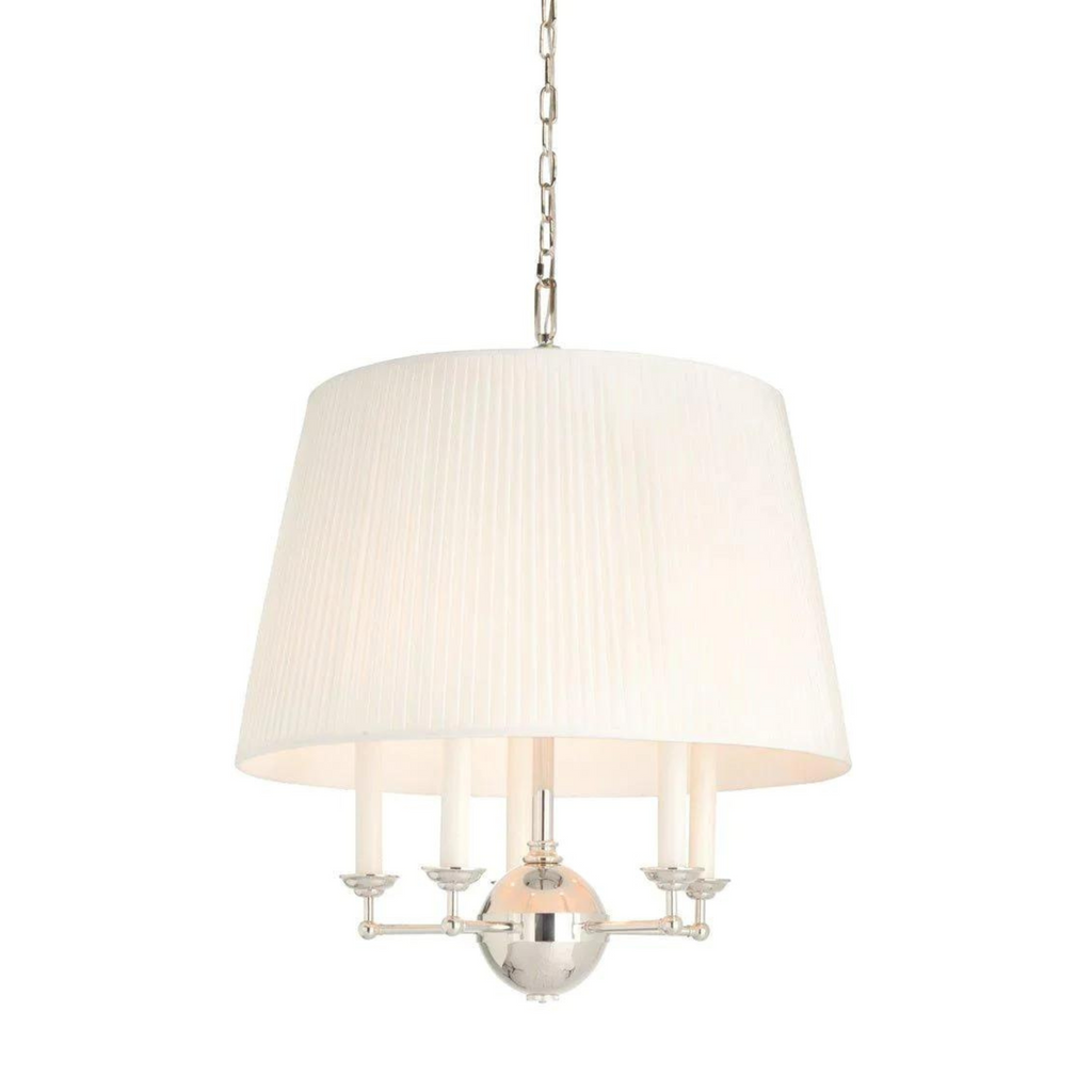 This beautiful shaded chandelier is the perfect addition to make a small space stylish. This chandelier features a geometrically balanced light assembly with a polished nickel finish. The off-white silkette shade is perfectly sized and balanced. This pendant light measures 33h x 28w x 28d and comes with 6 ft of chain. Each of the 5 bulbs has a maximum wattage of 25w. Click images for greater detail.