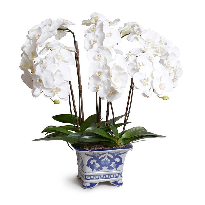 Phalaenopsis Orchid in White and Blue Square Ceramic Vase