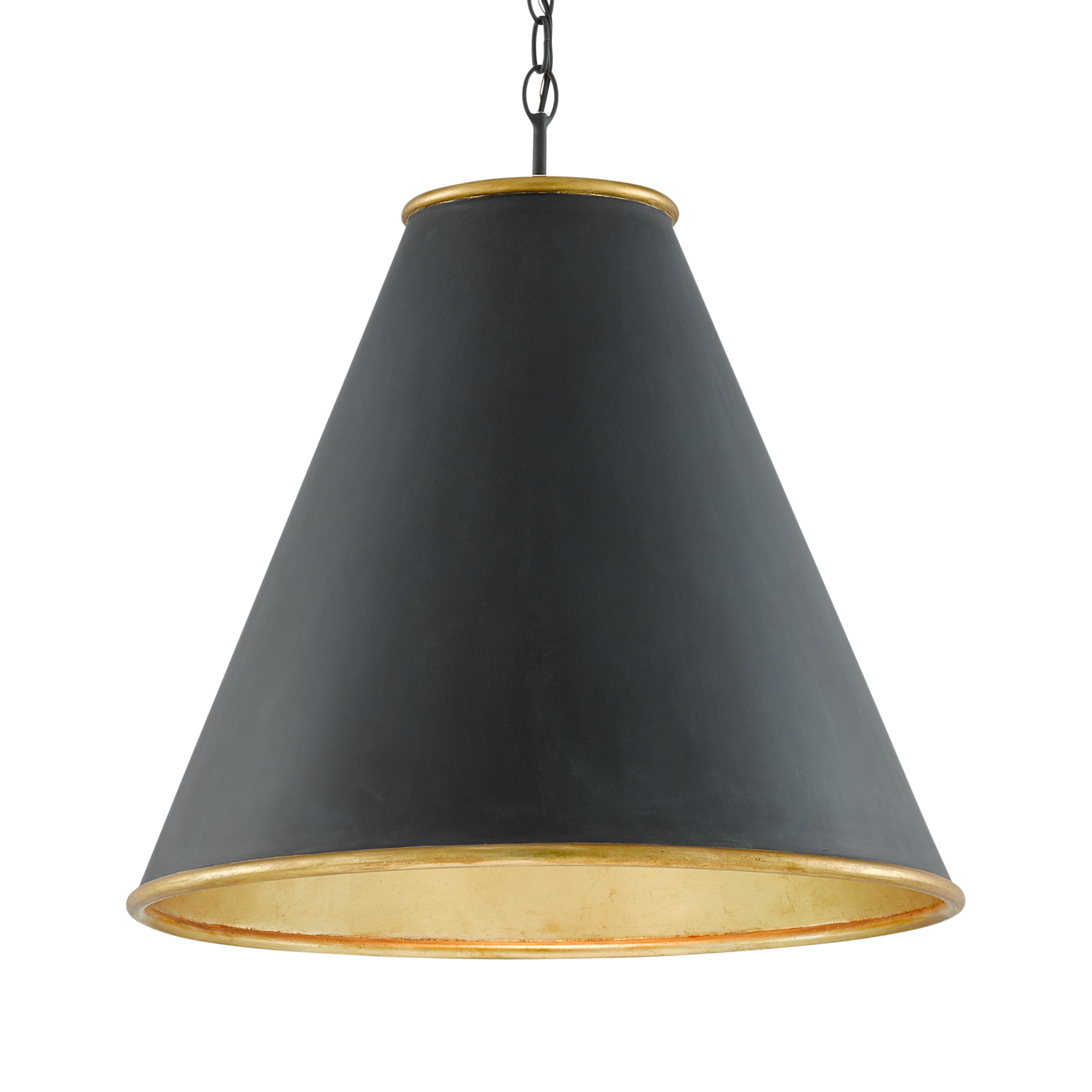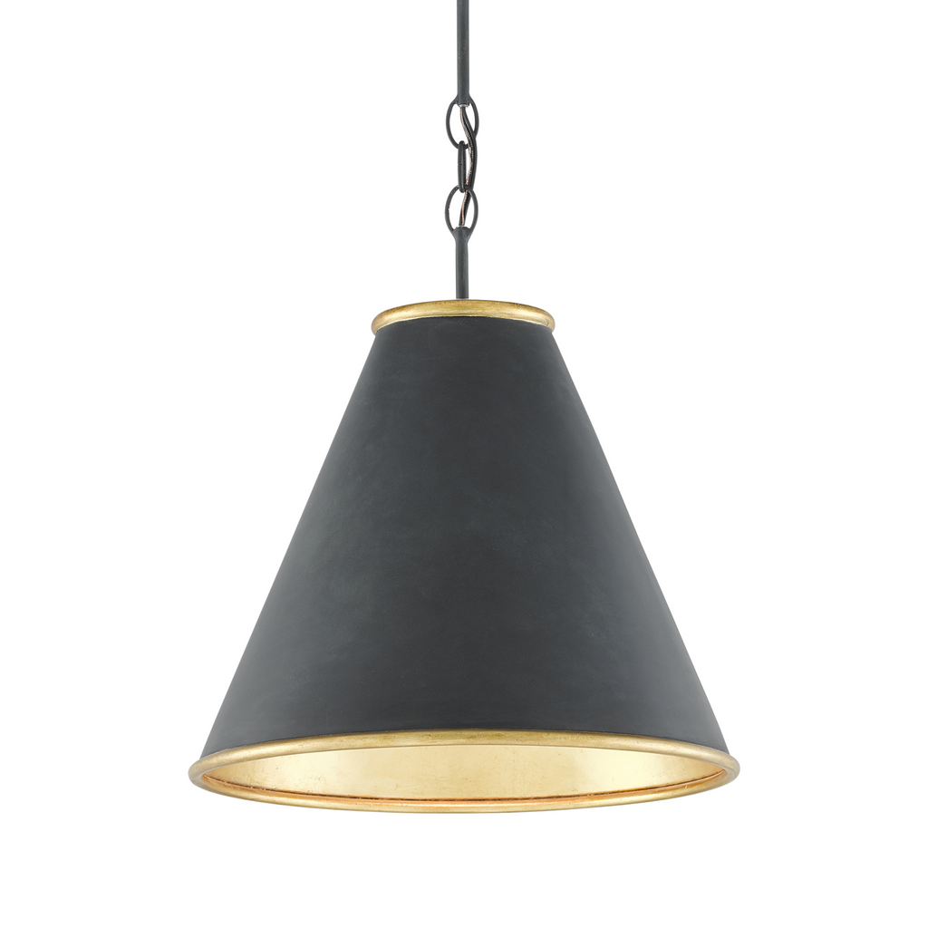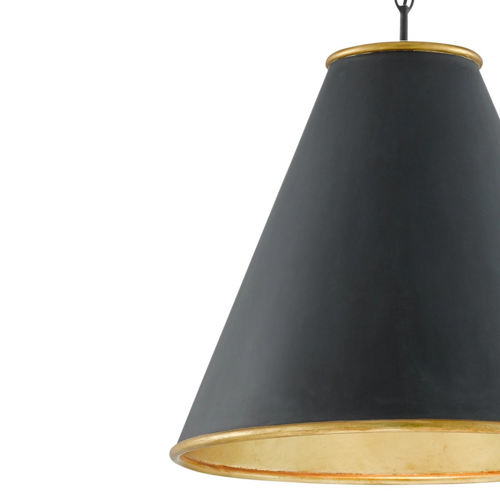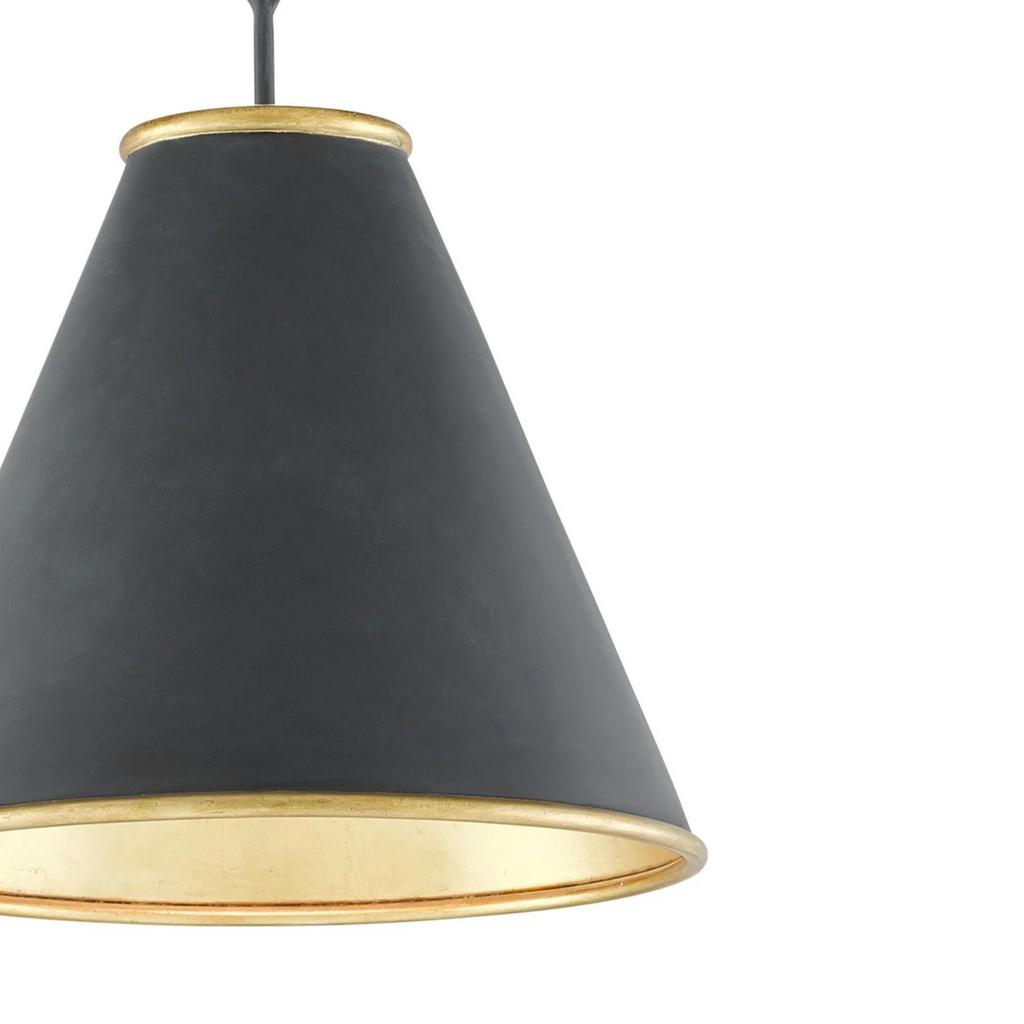 The Pierrepont Black Pendant is made of wrought iron with an antique black finish on its exterior and a contemporary gold leaf finish on the interiors of the shades. The rings connecting them gleam in a painted gold finish.