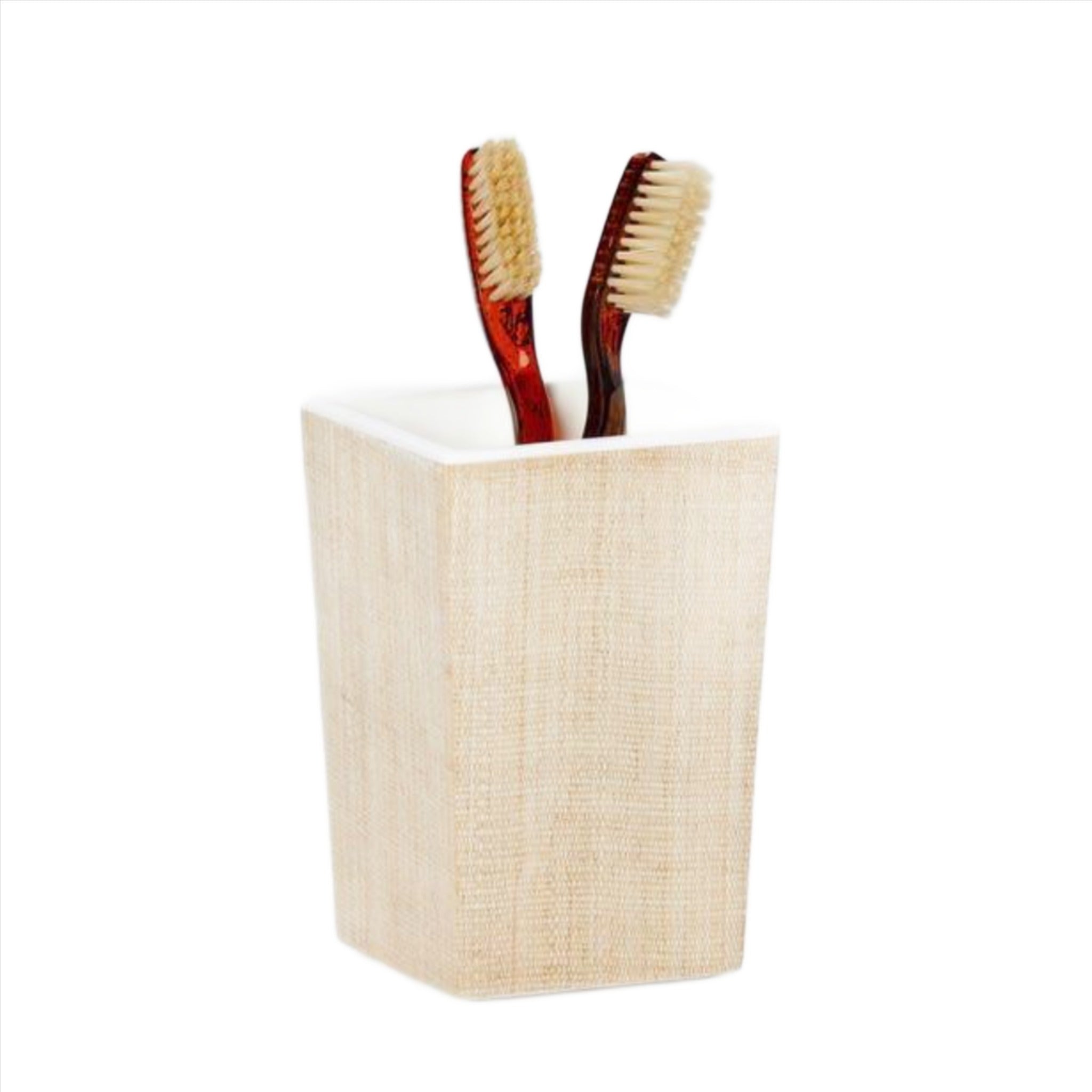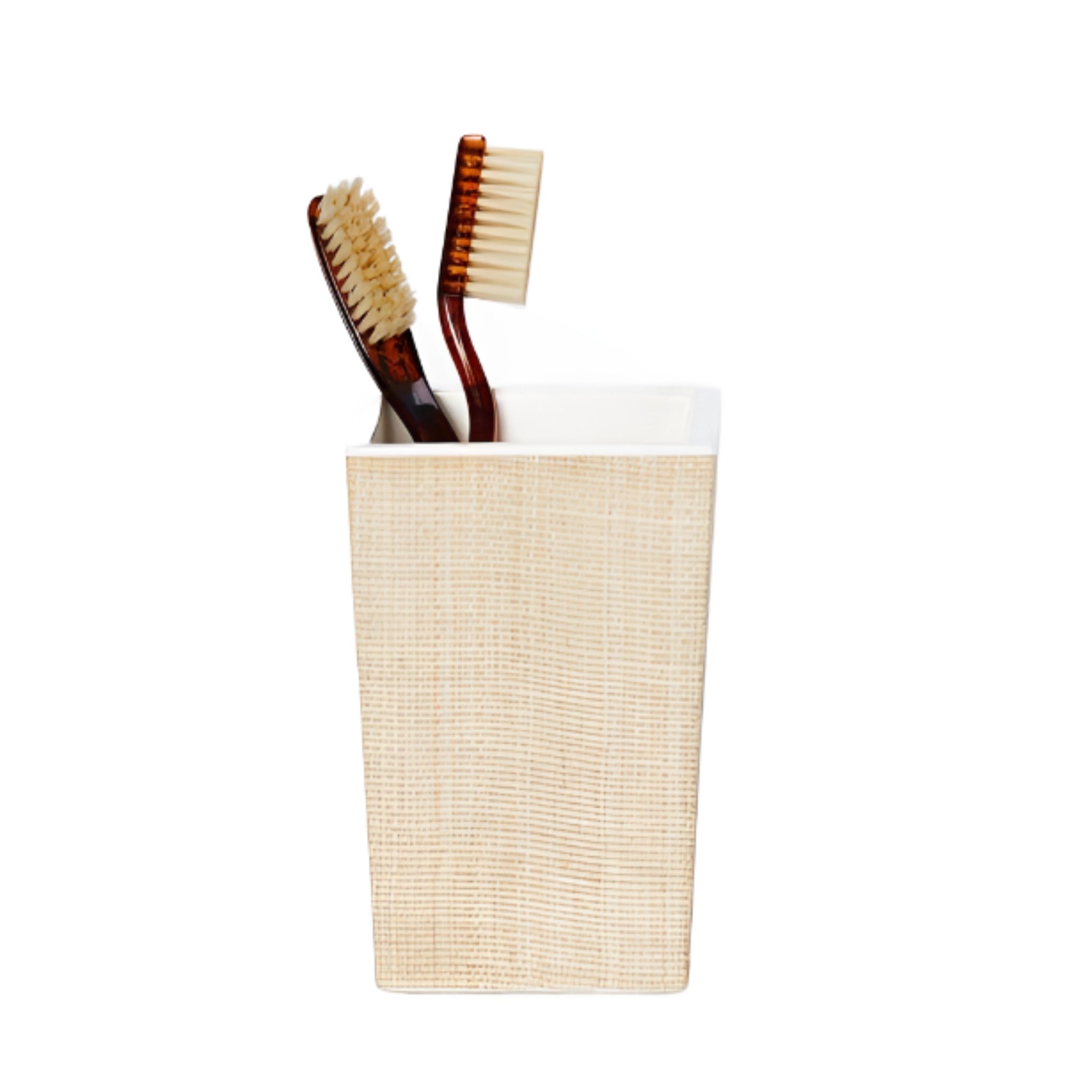 Abaca bath collection evokes serenity. Resin-coated and lined with painted wood. Measures: 3"L x 3"W x 4.5"H. Click on images for more details.