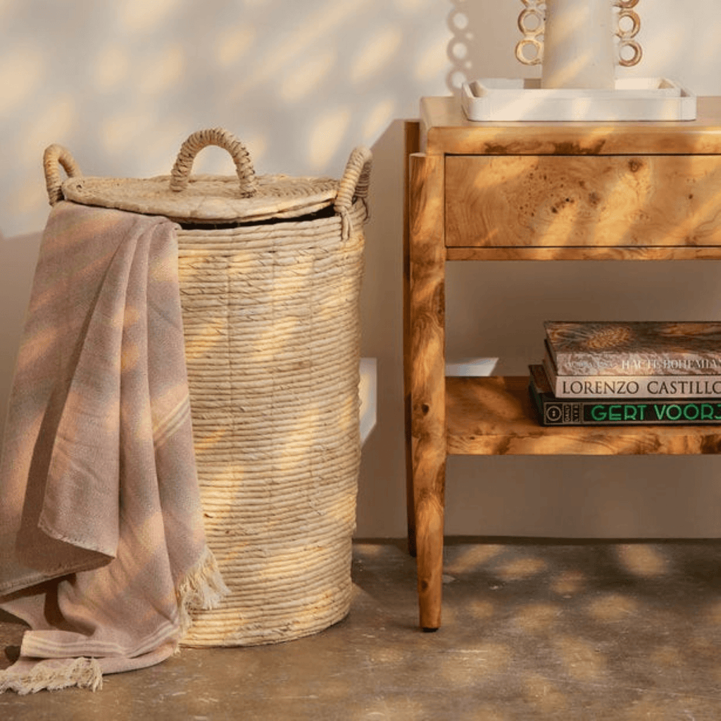 An earthy take on the drum-style hamper, Zaria is handmade from coils of natural abaca. Rounded natural abaca handles and a coiled natural abaca lid completes this stylishly practical, neutral piece.