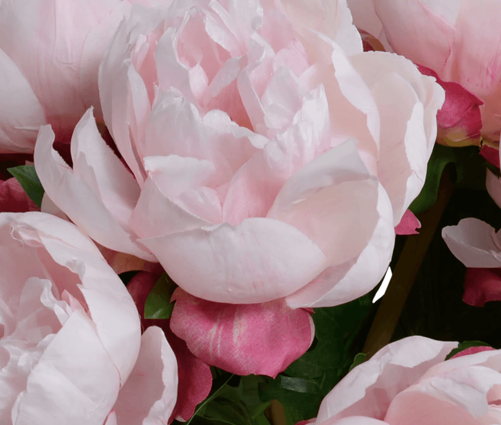 This lifelike arrangement of faux peonies makes a wonderful centerpiece or perhaps a housewarming gift. The bountiful bouquet of frilly silk flowers with natural-looking stems is arranged by hand in North Carolina and permanently set in place in the 6" glass cylinder vase with clear acrylic "water" solution.