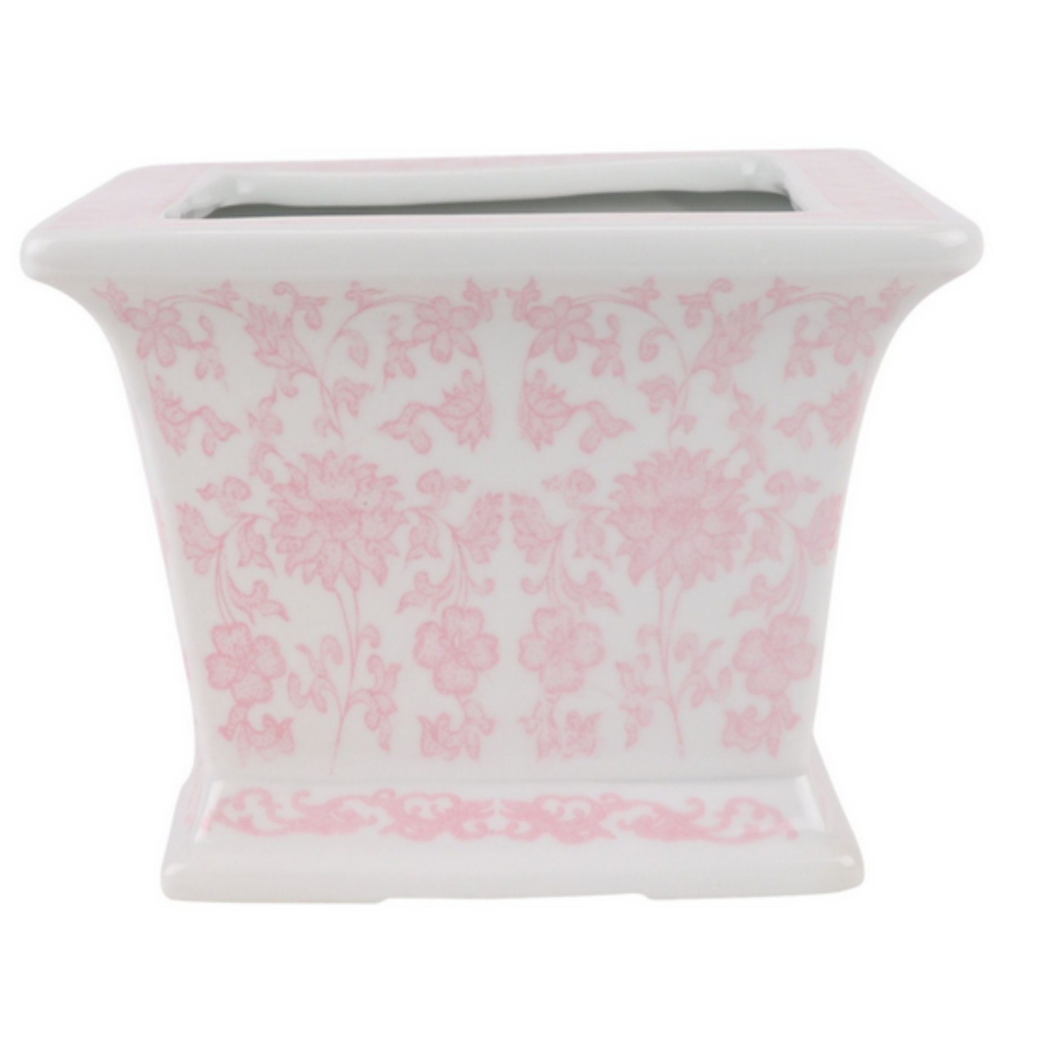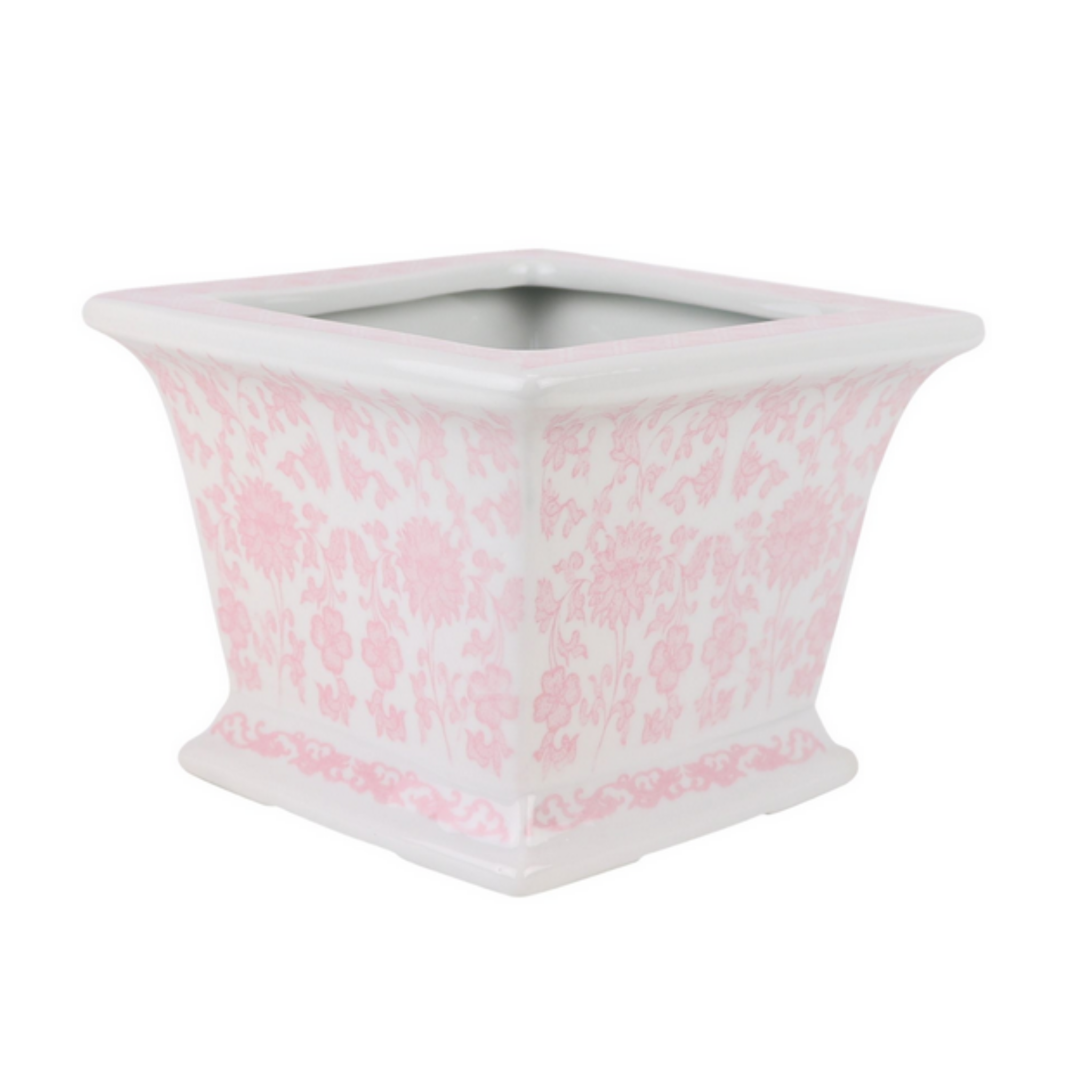Pink Square Floral Planter adorned with a stunning floral pattern in soft pink, it's a captivating addition to any space. Perfectly sized for fresh flowers, a boxwood ball, or topiary. Explore our matching pink Ginger Jar for a complete and harmonious look!