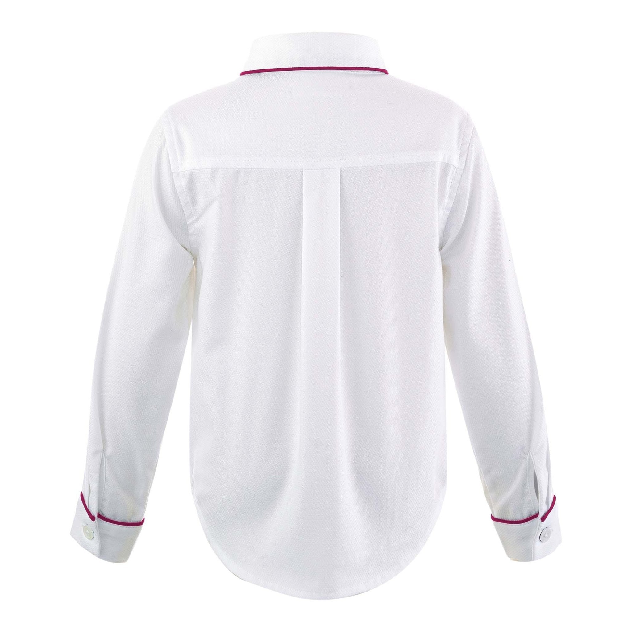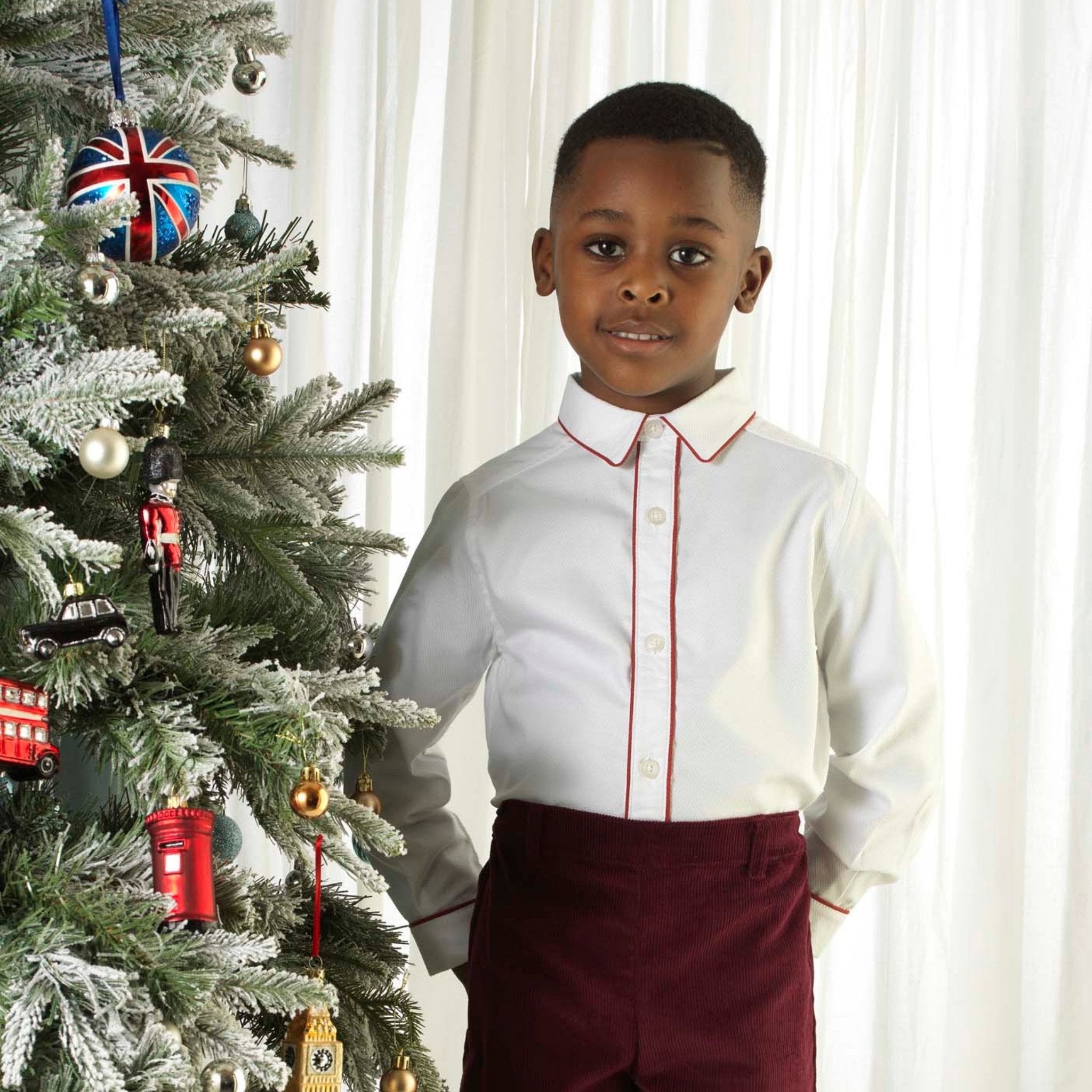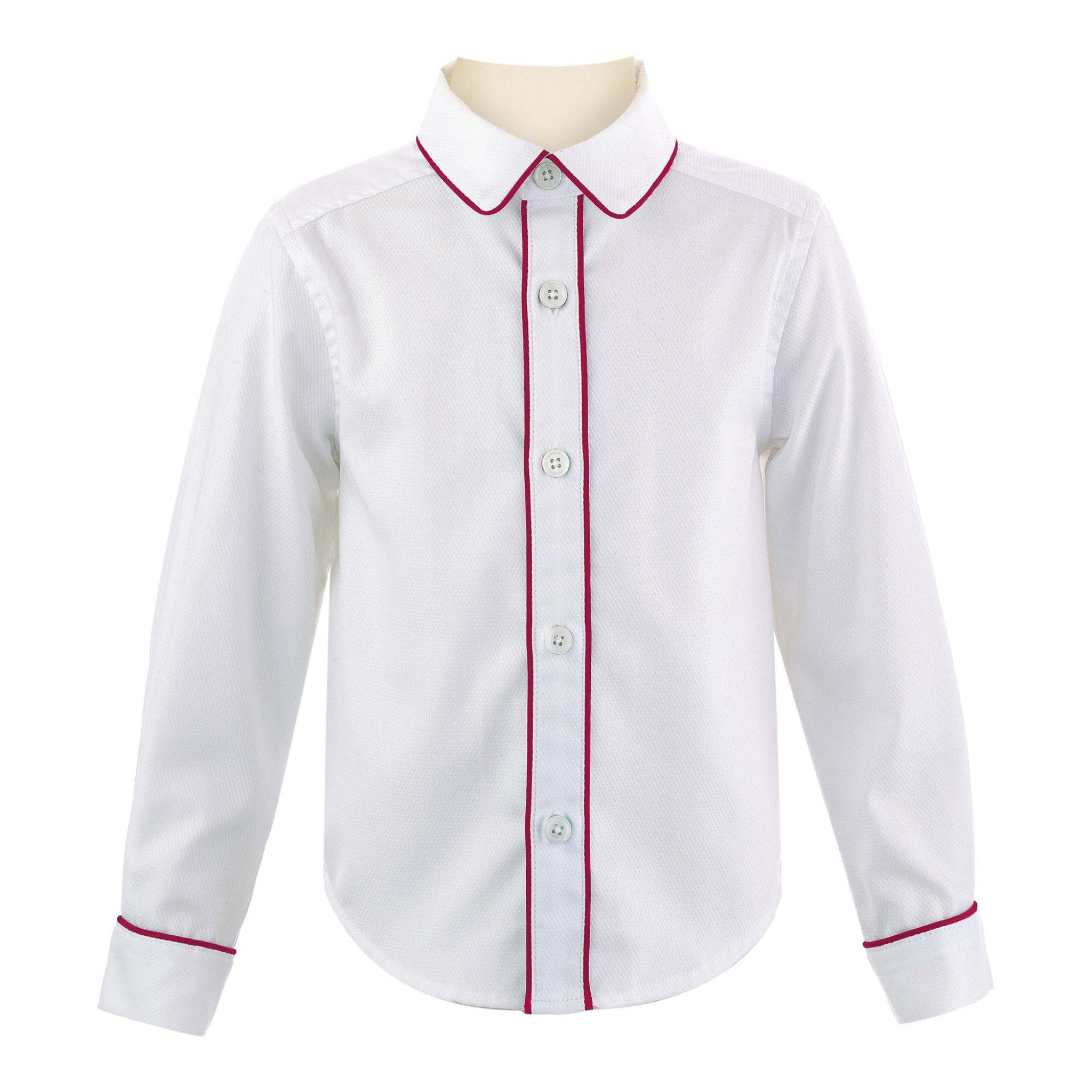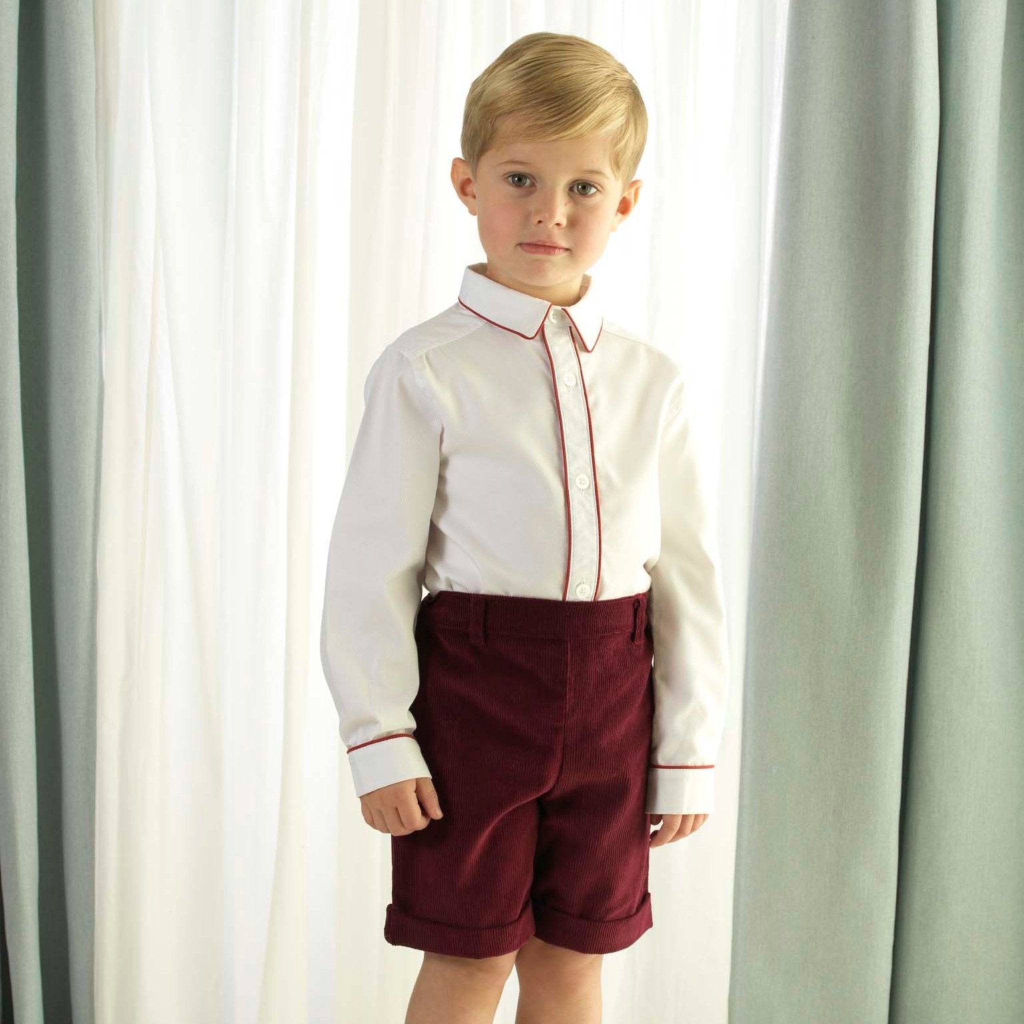 Formal shirt in premium ivory pique cotton trimmed with a contrasting piping at the collar edge, cuffs and button placket. Team with a pair of shorts or corduroy trousers from our collection for the perfect outfit, or layer up with one of our cosy knitwear pieces. Also available with a navy or red trim. Coordinating item available for baby boys.