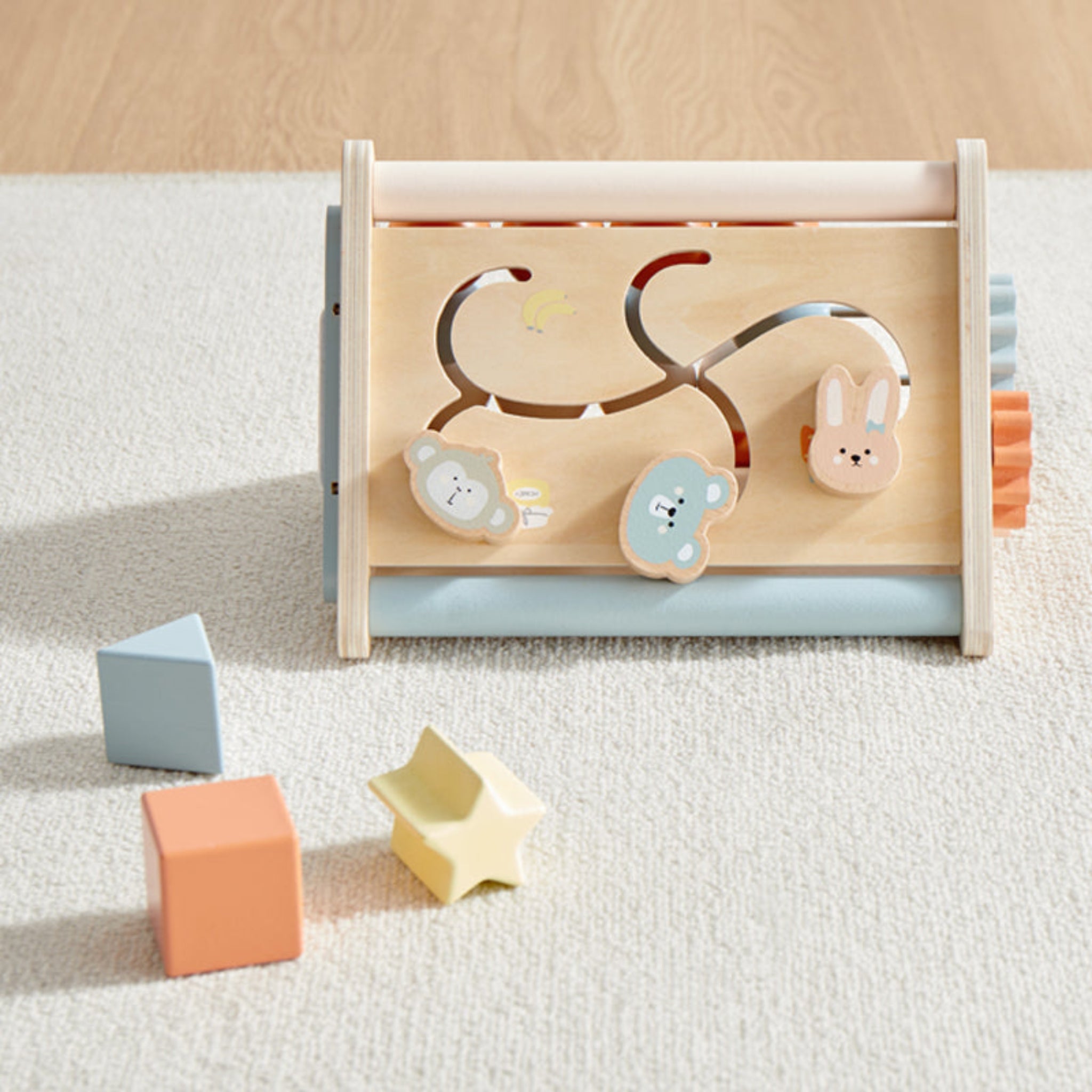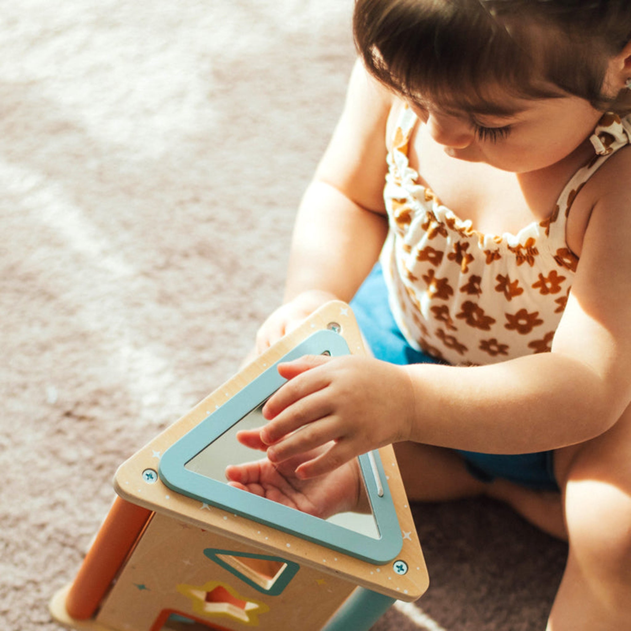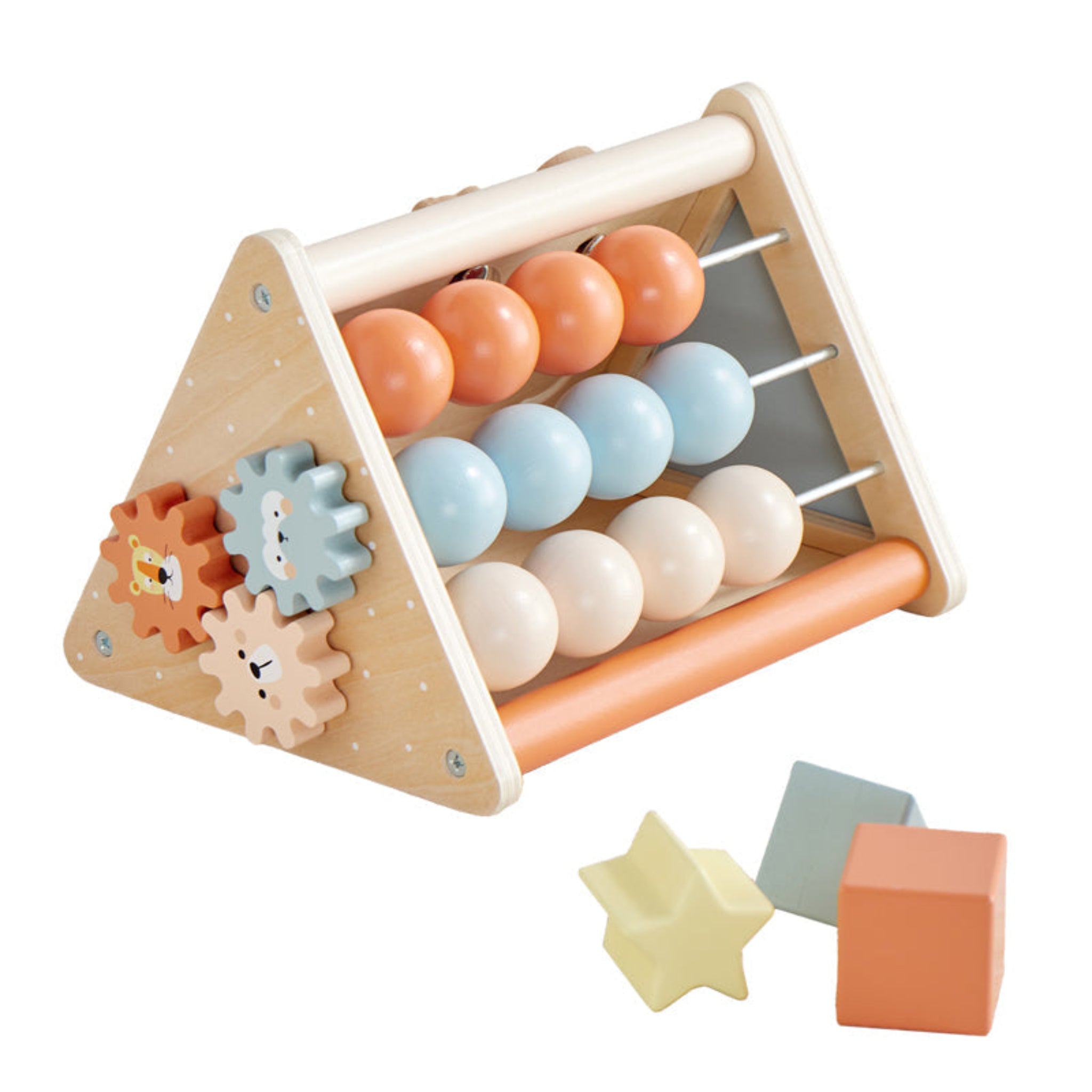 - Three-sided activity hub with abacus, shape sorter, character maze, gears & a mirror-door