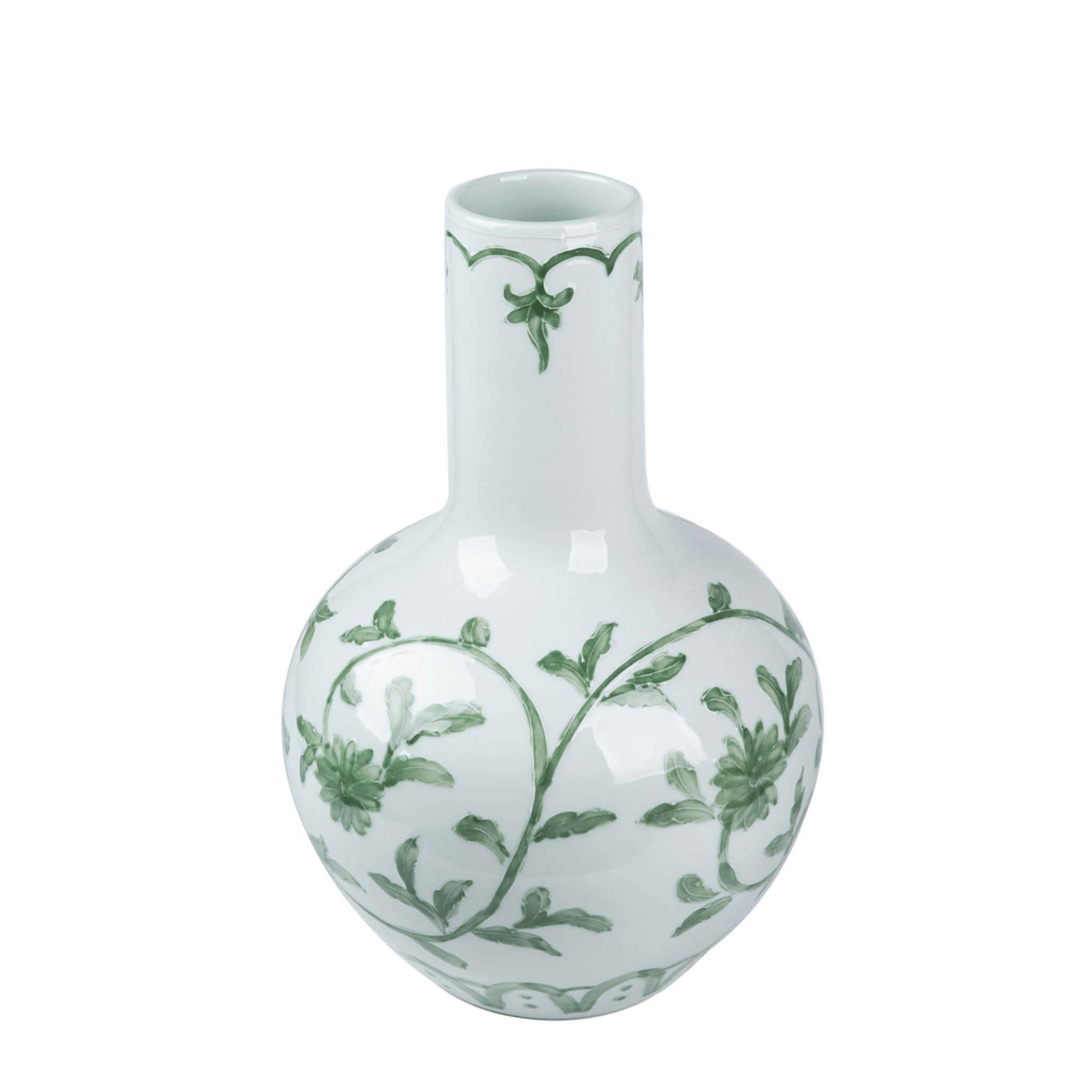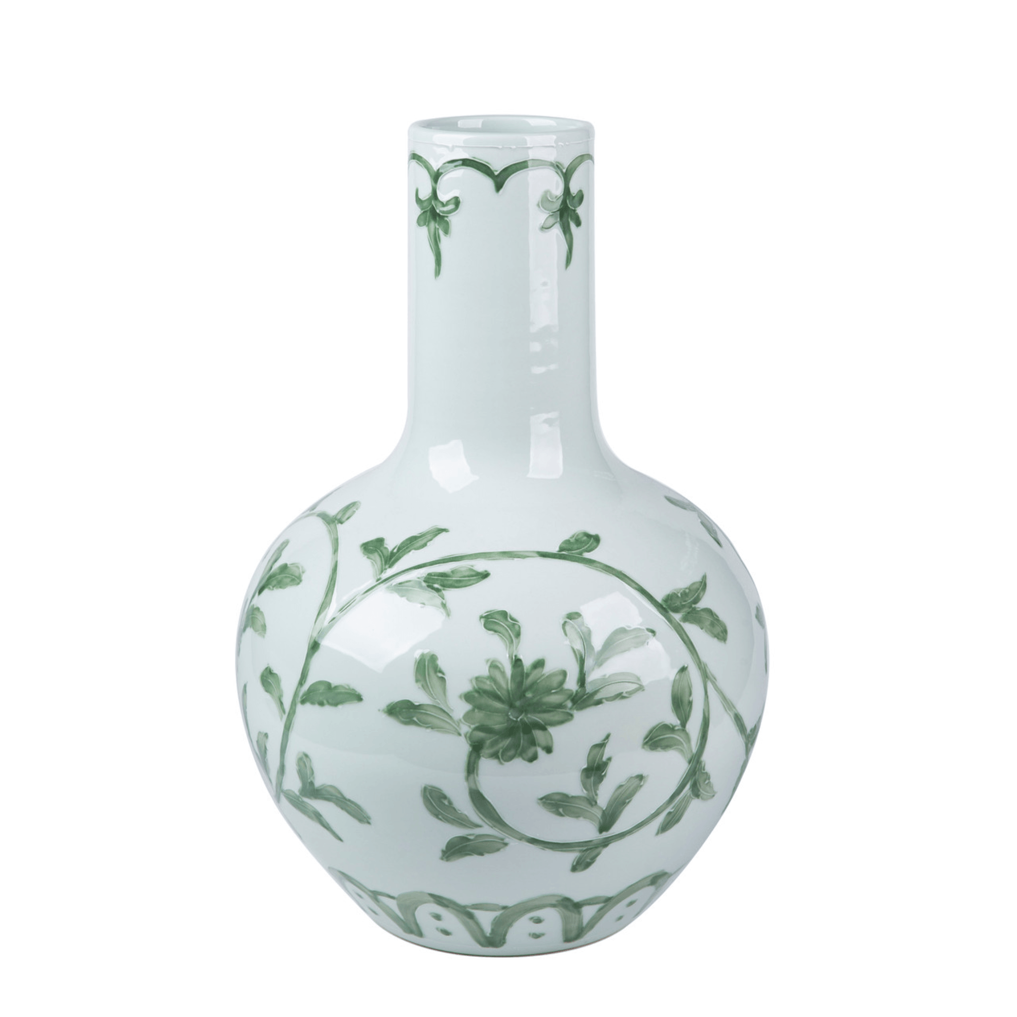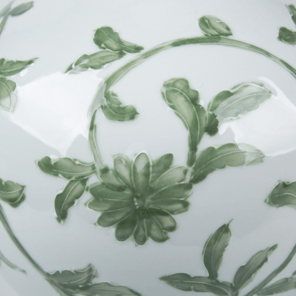 This lovely porcelain globular vase features a celadon green vine design on a white background. Click images for greater detail.