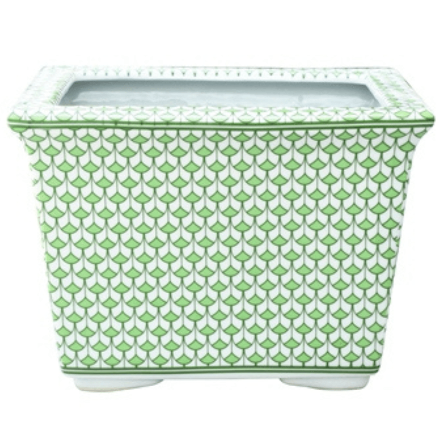This decorative porcelain rectangular cachepot features a beautiful green fish scale motif. Measures: 9"W x 7"D x 7"H. Shade and color variations are intrinsic to the beauty of handmade items and are not a product defect. Each product is unique, and the product photo shown represents one, but colors can vary. Click image for greater detail.