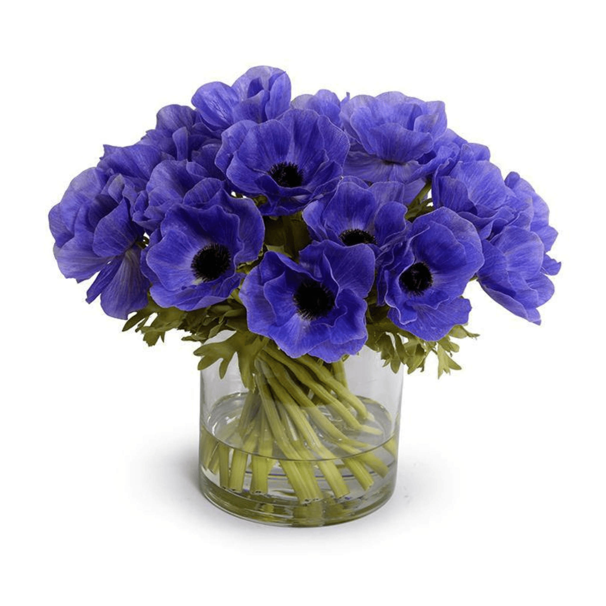 This bright, bountiful bouquet features 24 striking purple flowers with black center arranged in a handmade glass vase. Our lifelike Anemone reproductions are made from real-touch material with carefully painted petals and realistic stems that look fresh-cut. The 6.75" clear glass tapered vase is filled with a small amount of clear acrylic liquid that looks like water and acts like glue.