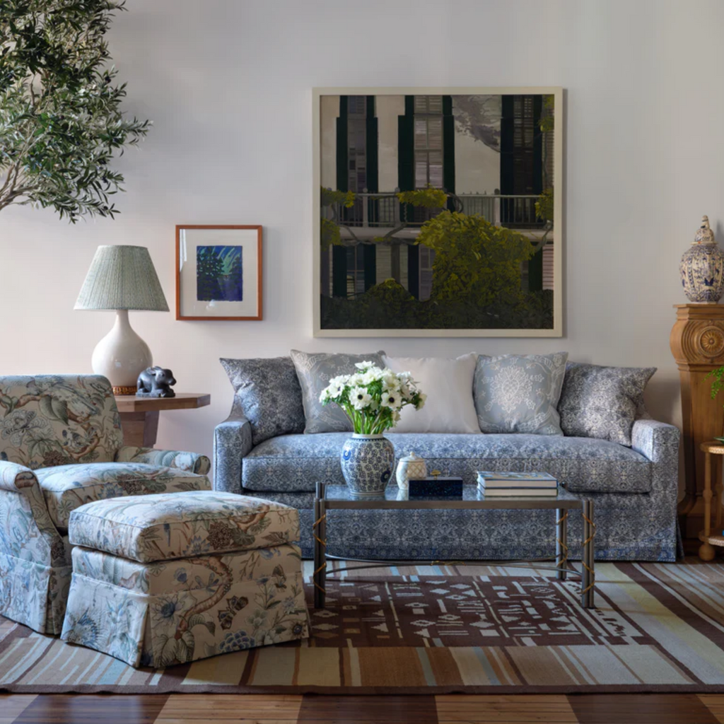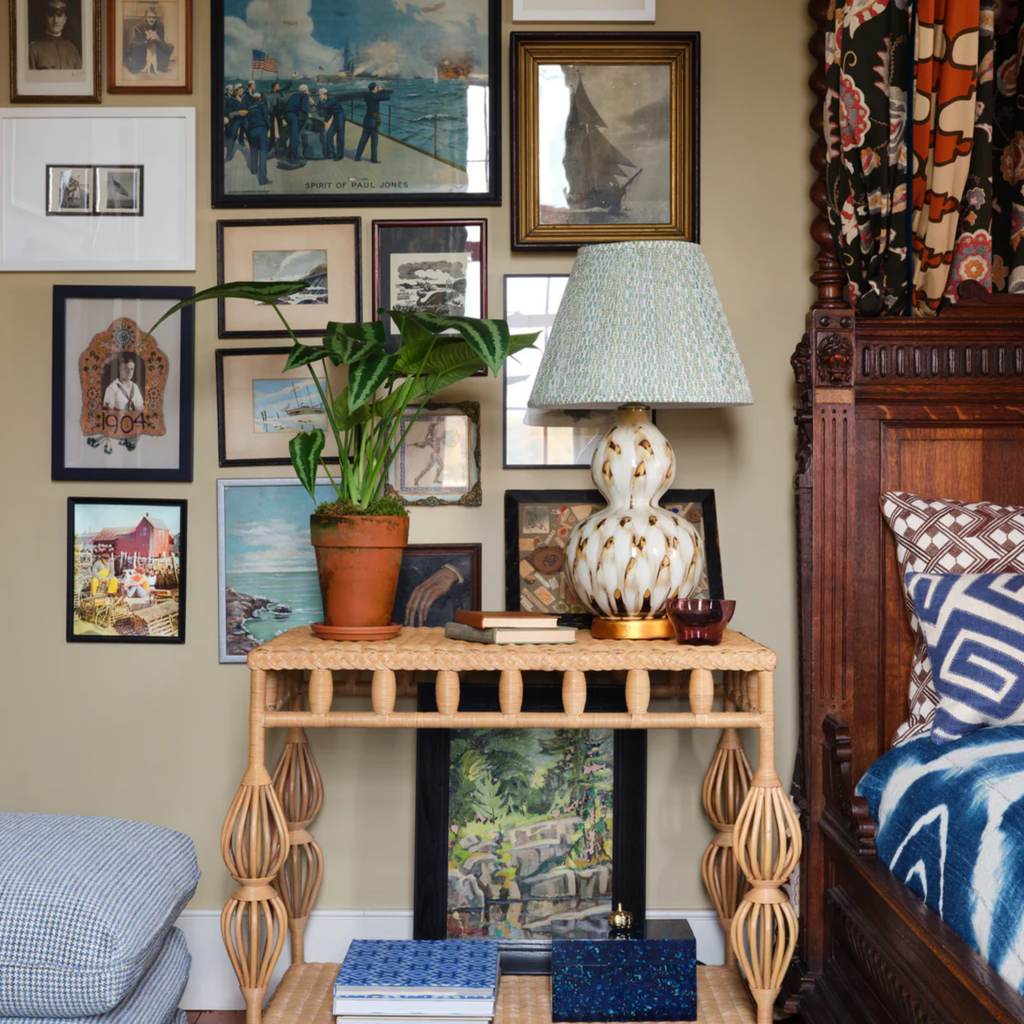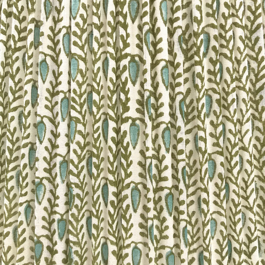 The Putnam spring lampshade features a ruched, stylized vine repeat with pale-blue floral buds. Click images for greater detail.