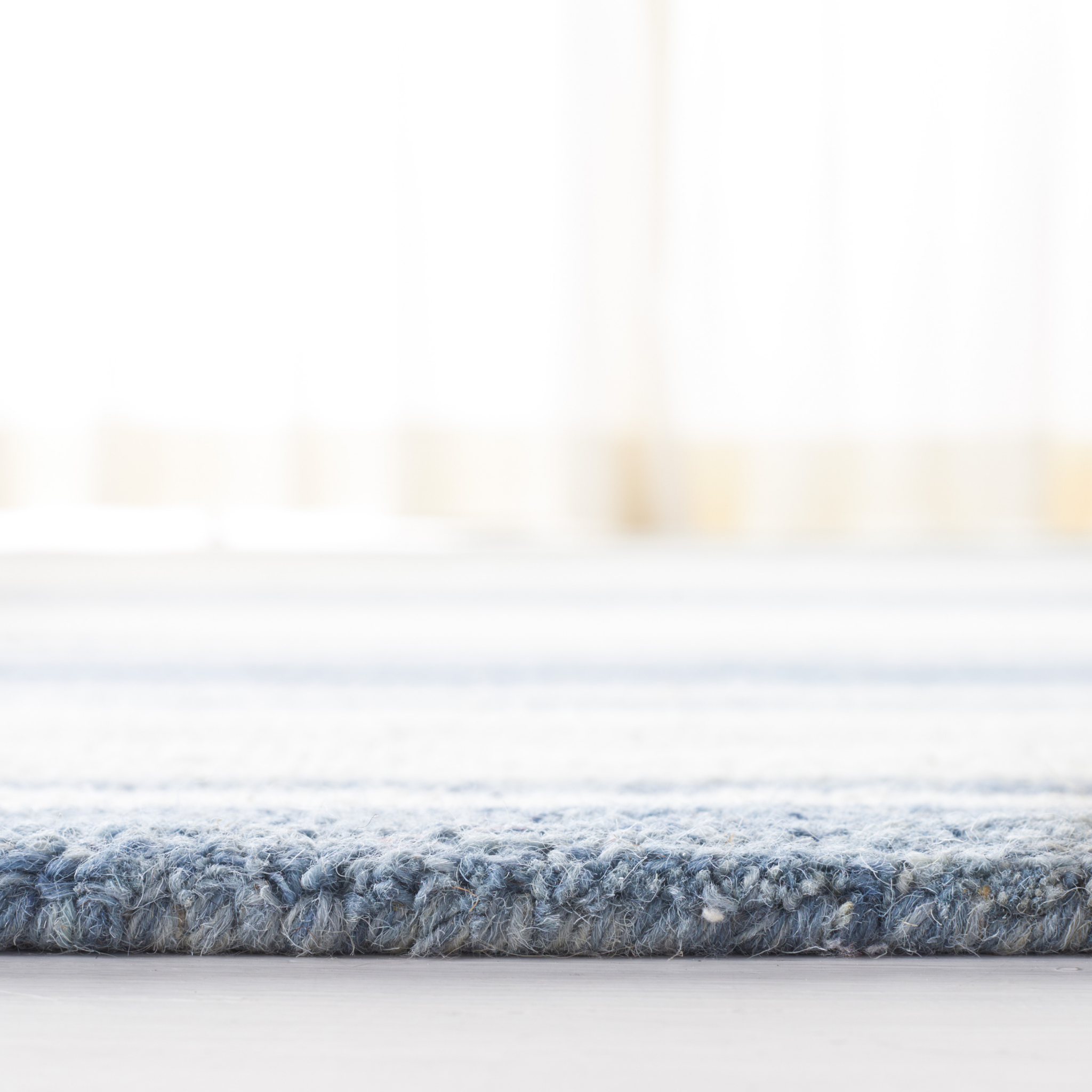 This contemporary Ralph Lauren rug features blue and ivory stripes. The hand tufted texture of this rug  will be welcome in any space. Click images for greater detail.