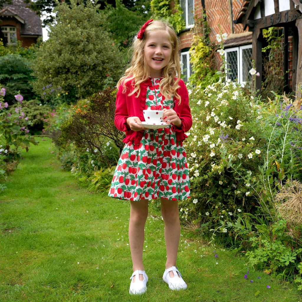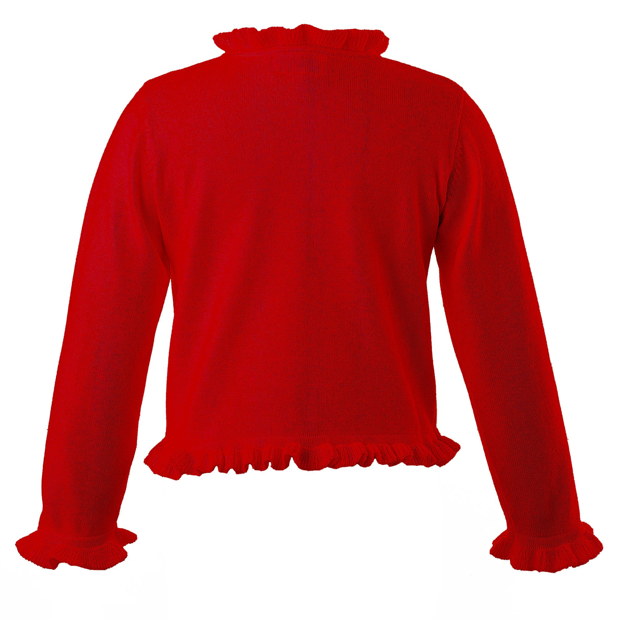 An essential layering piece! A soft cotton cardigan with stretch, in red. Trimmed with frills at the front, neck, hem and cuffs and finished with twinkly faceted jewel effect buttons.