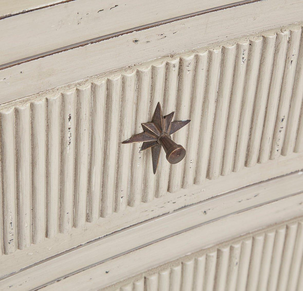 Perched on tapered legs, this charming mahogany chest is made even more lovely by the addition of raised fluting on the drawer fronts. While generously scaled, this beauty is slightly concave and has a delicate appearance, making it a perfect choice when a pair of chests is called for. A touch of bling is supplied by the unique star pulls.