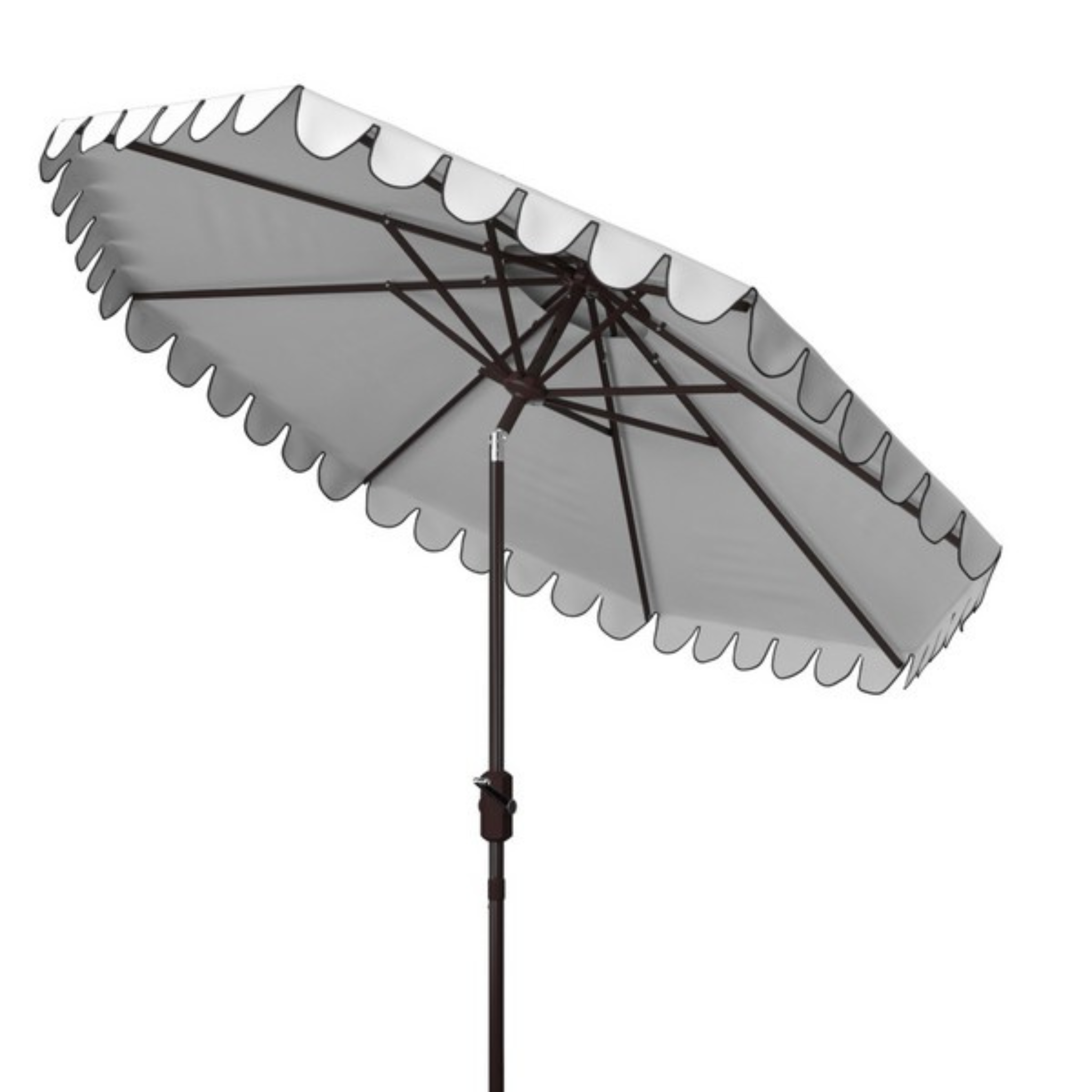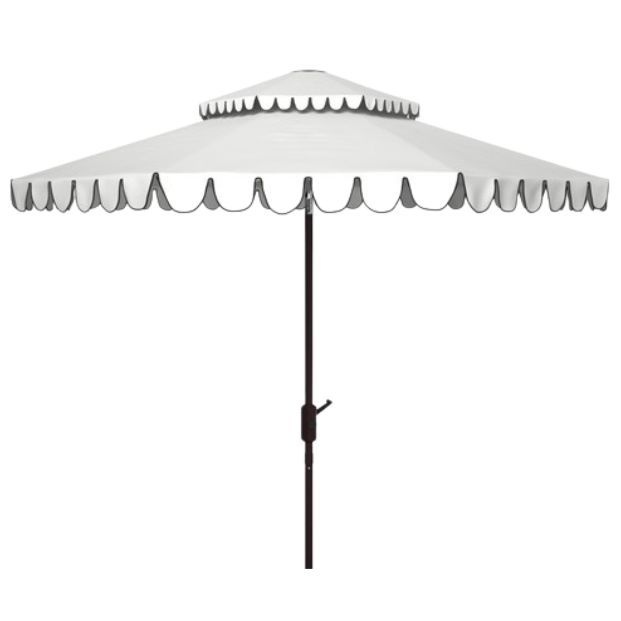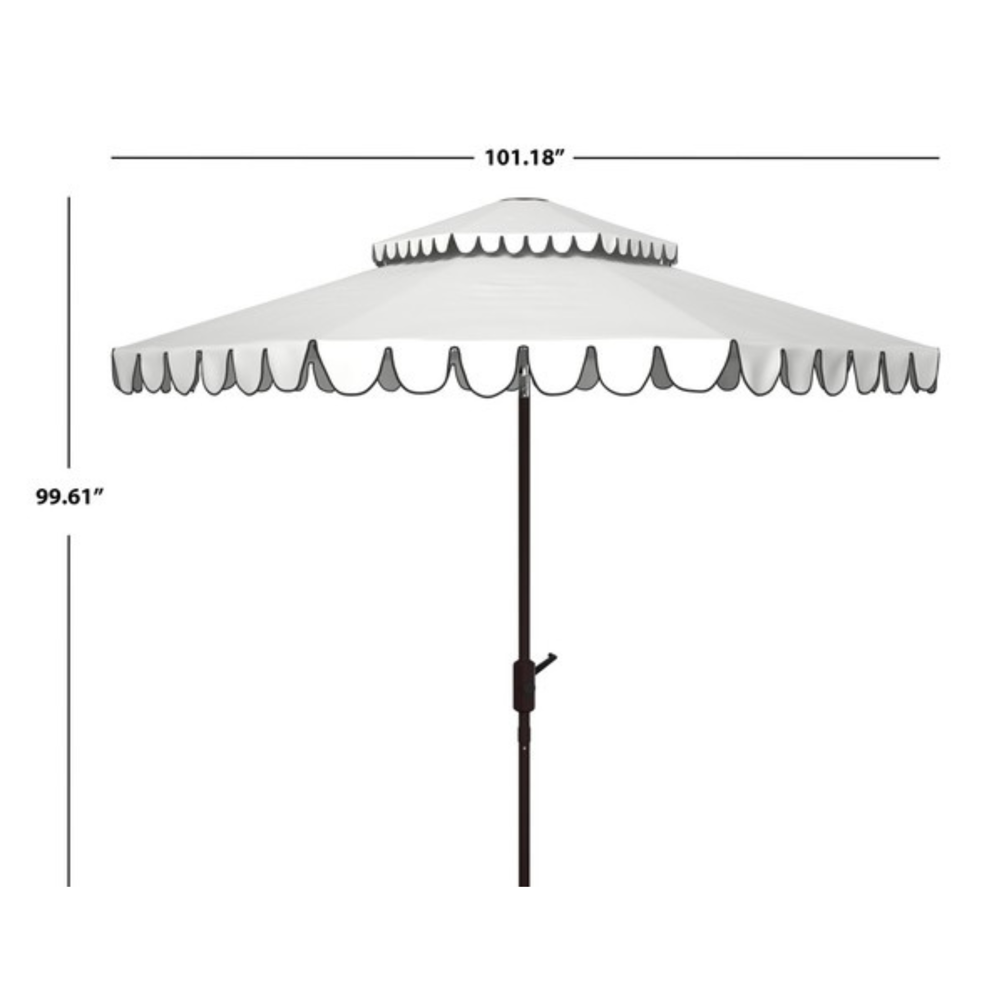 The signature backdrop of Santorini’s lush legendary resort inspired this nine-foot double top umbrella. Its chic white hue features a matching scalloped trim to create an outdoor retreat for the modern tastemaker. When open, this umbrella measures 101.18"x 101.18"x 99.61". When closed, it measures 6.69"W X 6.69"D X 99.61"H. Please note some assembly is required for this item. Click images for greater detail.