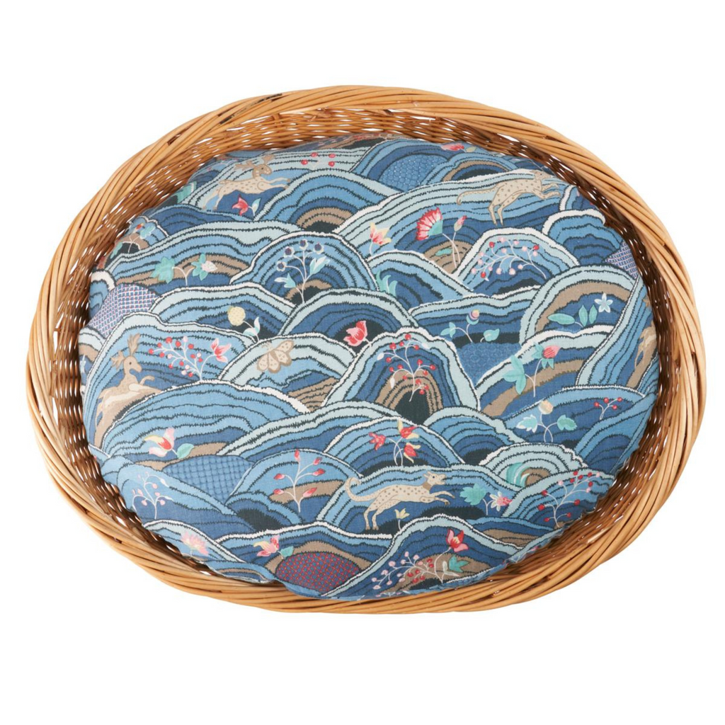 House your dog in high style and keep tails wagging with our Rolling Hills Dog Bed. It combines the classic look of a pecan-colored wicker basket with our Rolling Hills fabric, a whimsical print from the 1960s featuring charming animals gamboling across a naïve landscape. The removable cushion is tailored with hidden zippers and filled with a premium fiber that has the look and feel of down, and it’s treated with Alta, a stain-resistant finish that’s environmentally friendly and ensures easy cleaning.