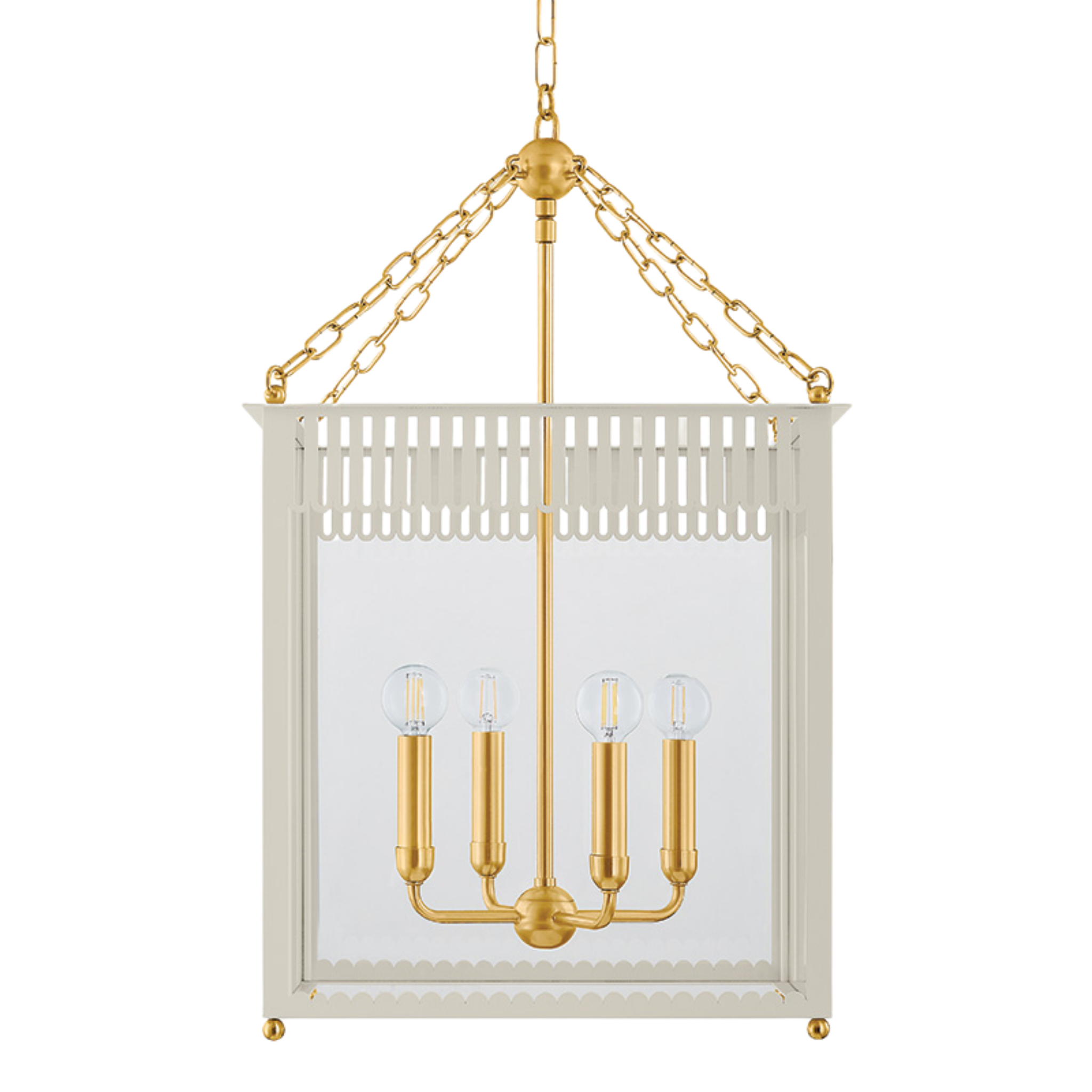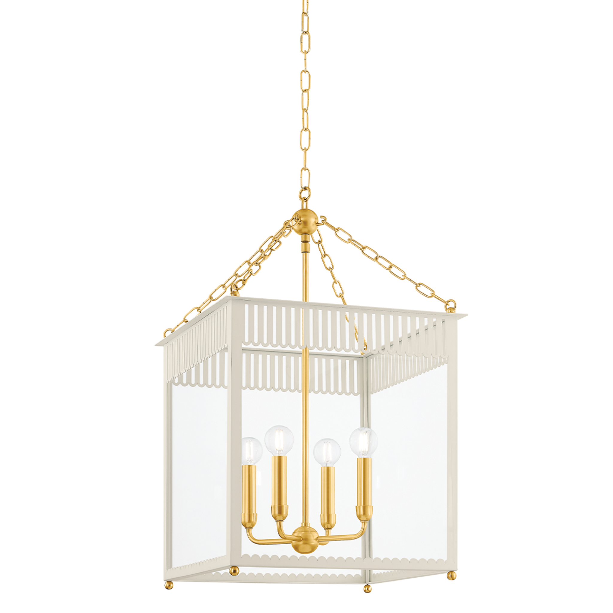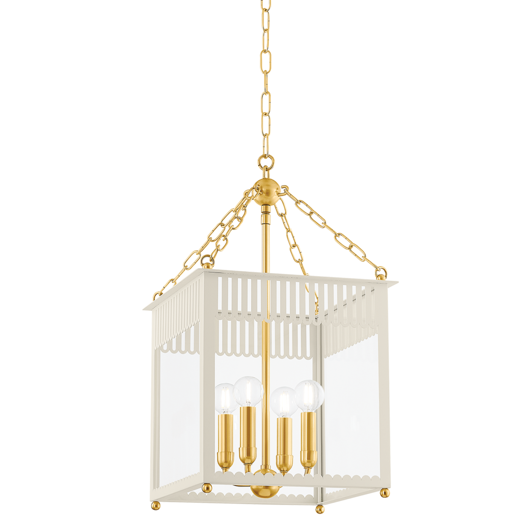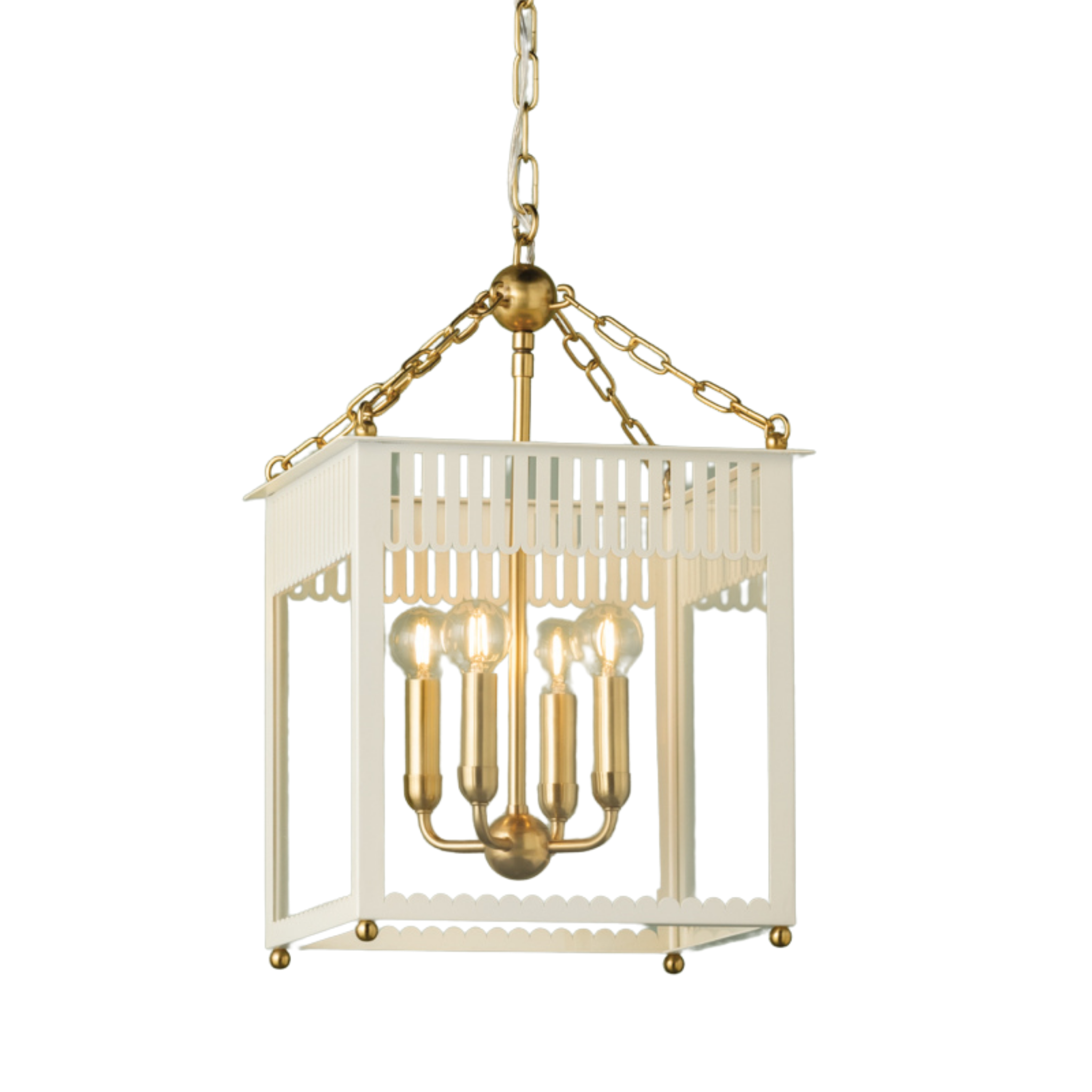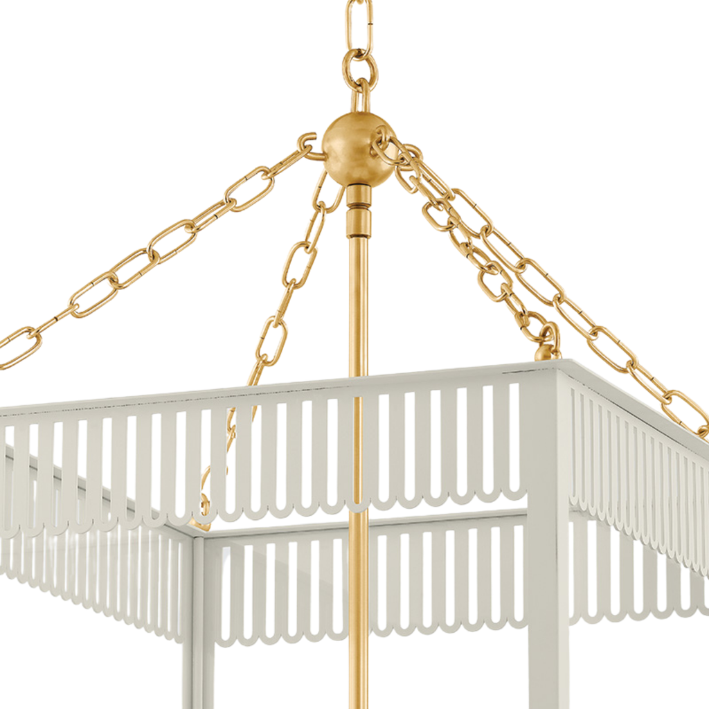 Embracing the grand millennial trend, Rosalie presents a fresh take on a traditional box lantern. Scalloped and slatted details elevate the clean lines of this 4-light fixture. Additional decorative elements, like the Aged Brass sphere and delicate chainwork, add to the playful composition.