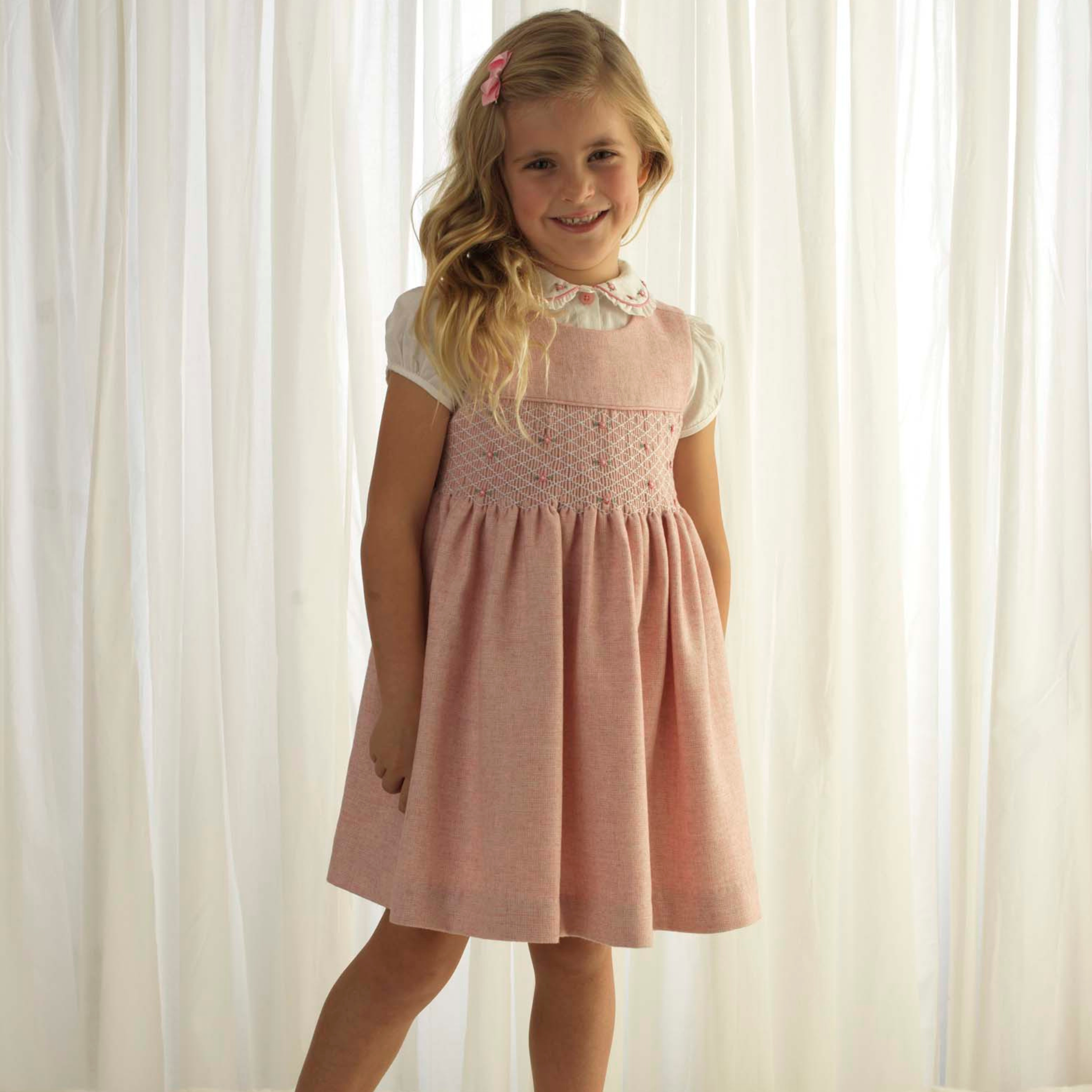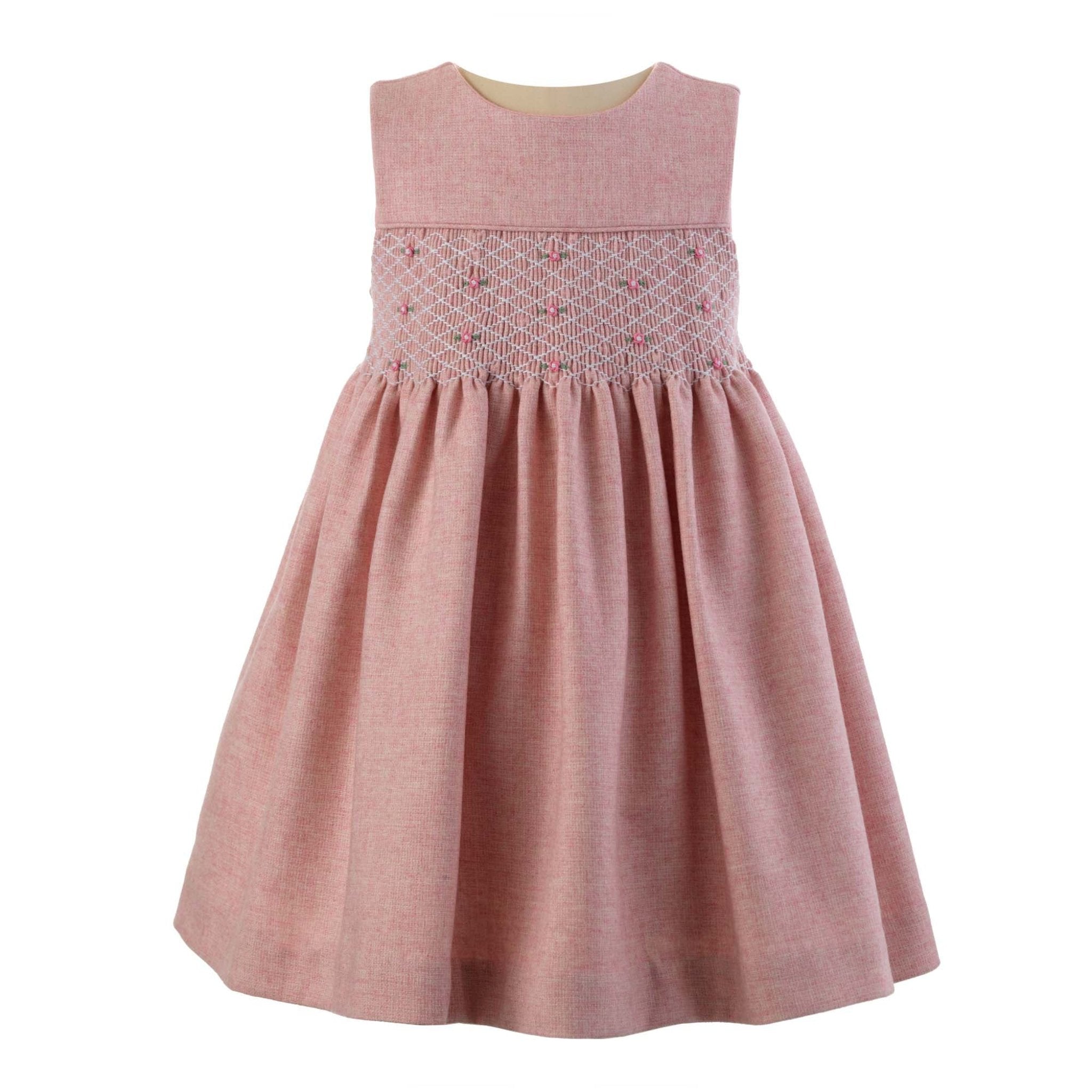 Sweet hand-smocked pinafore, with rosebud designed across the chest in a pink tweed effect wool mix fabric. Team with our rose embroidered blouse and tweed hair bow for the perfect outfit!
