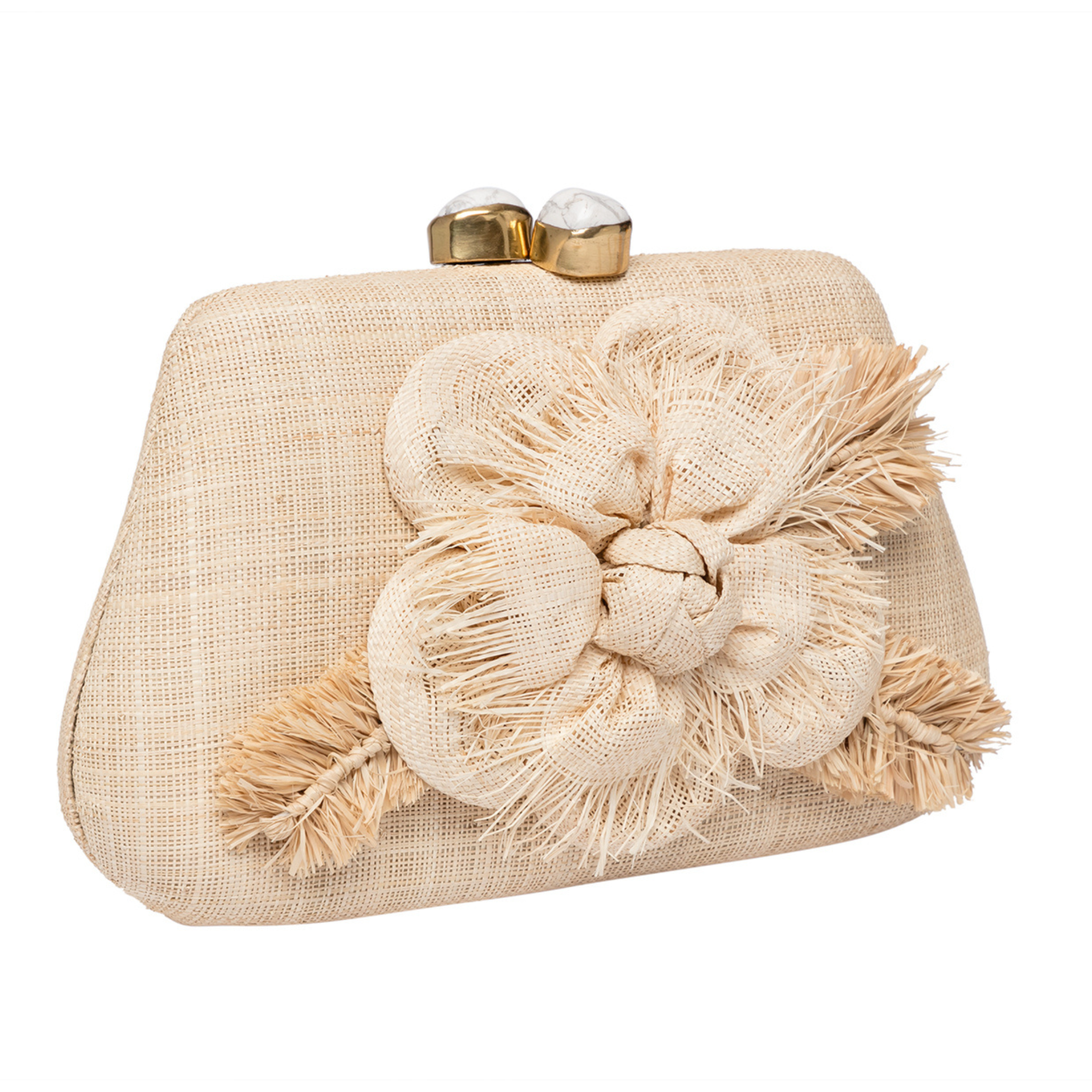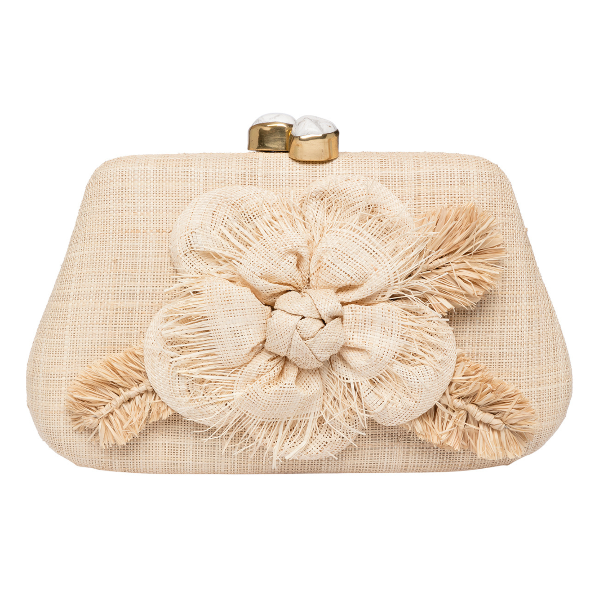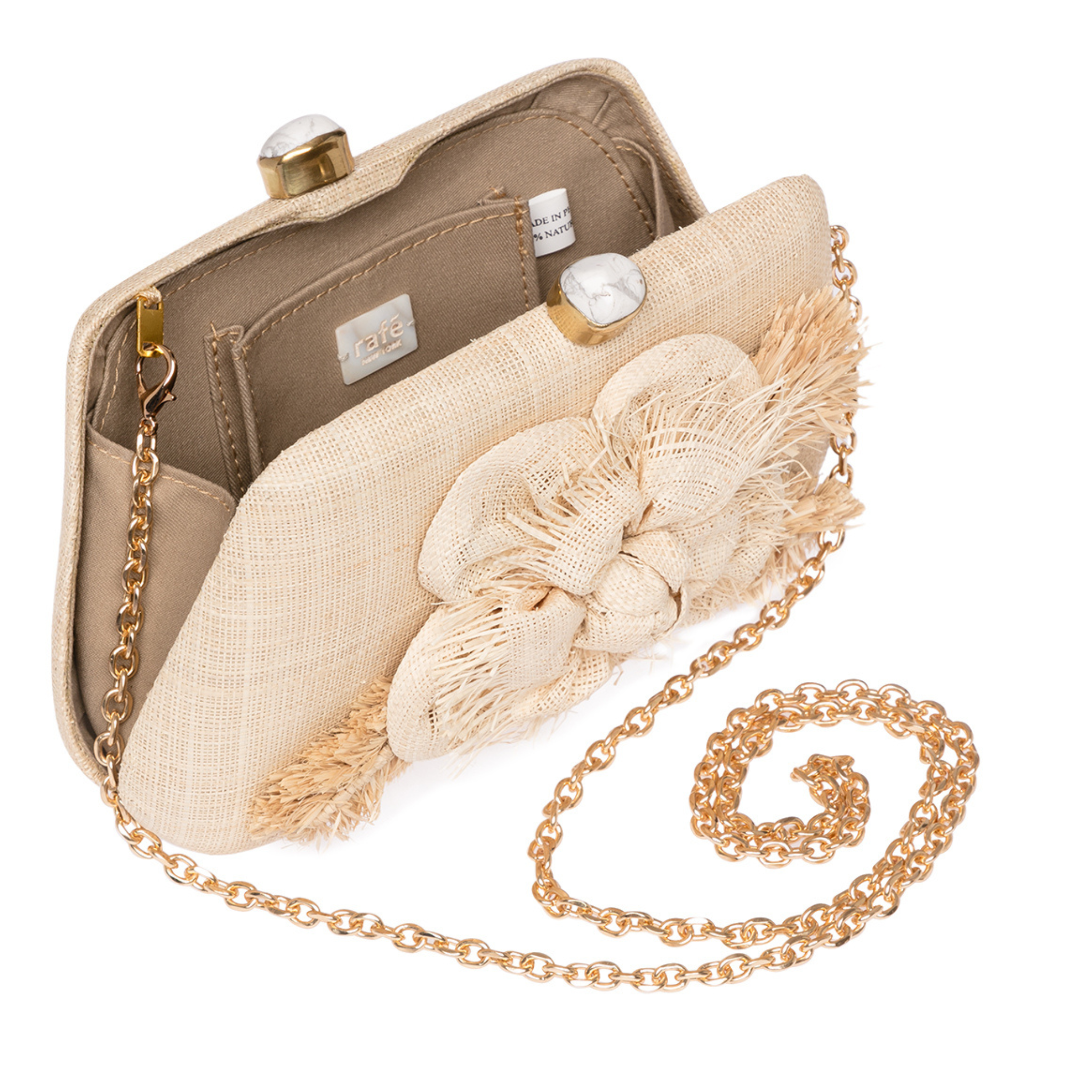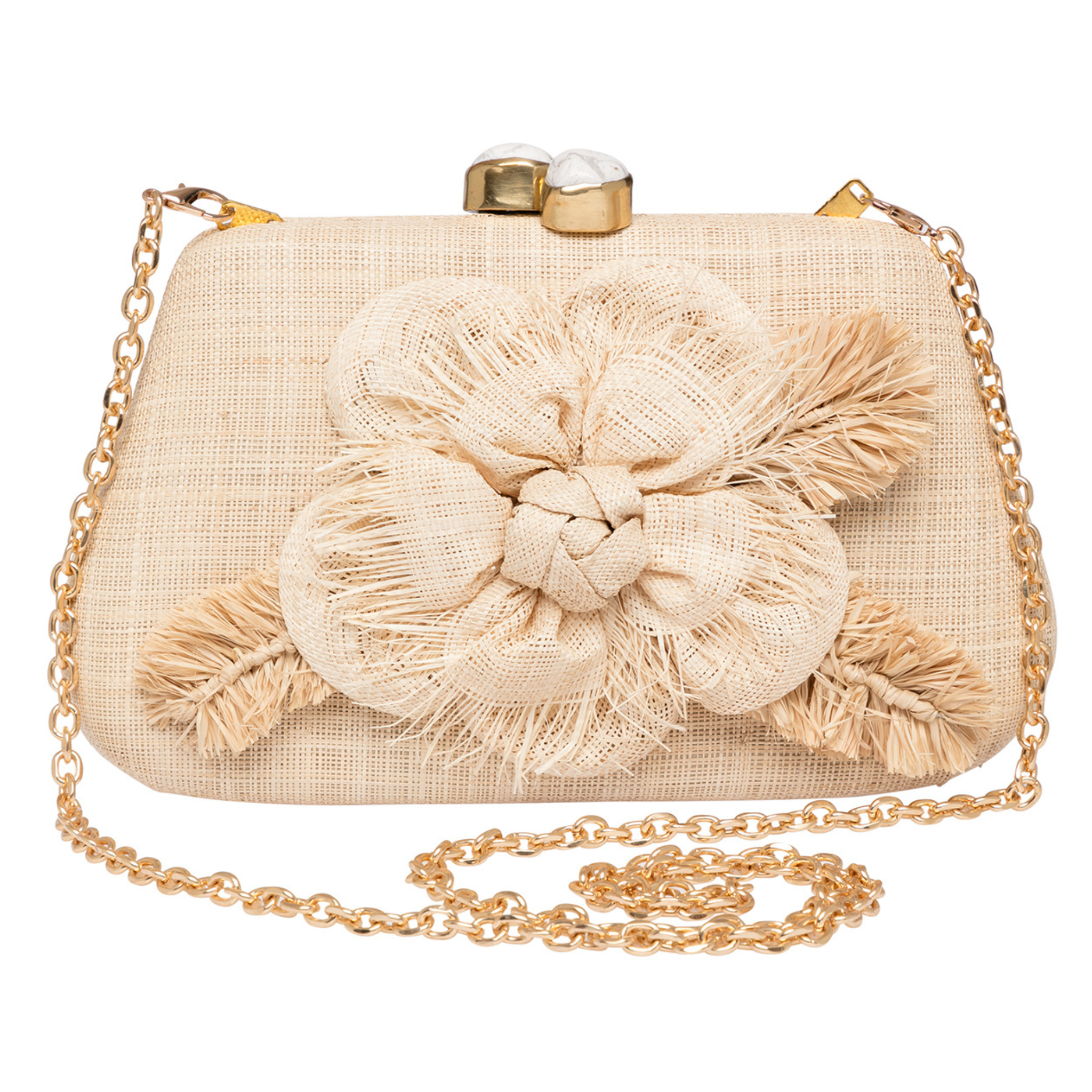 Clutch in natural raffia with fringed flower detail and ivory stone clasps. Fully lined with drop in gold chain strap.