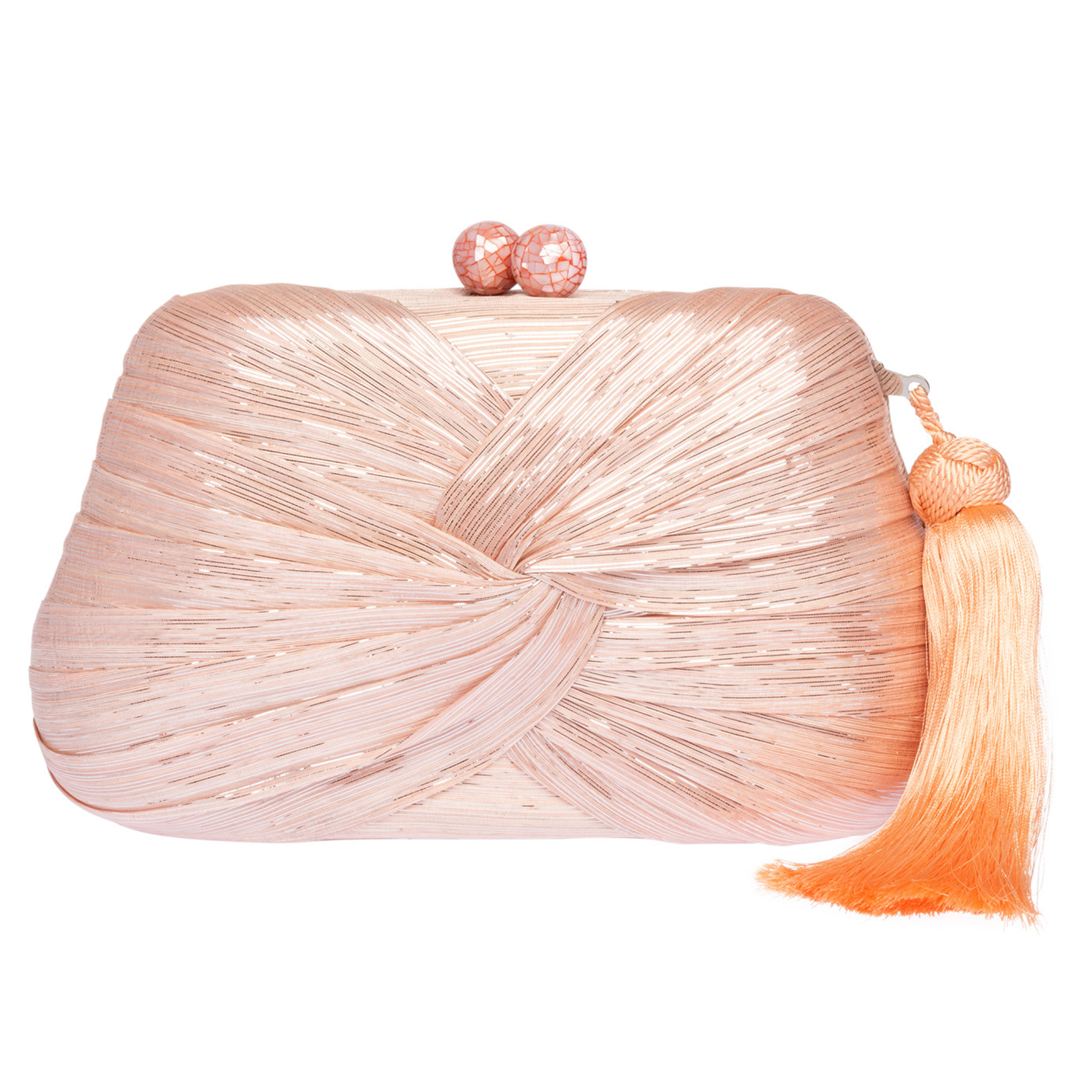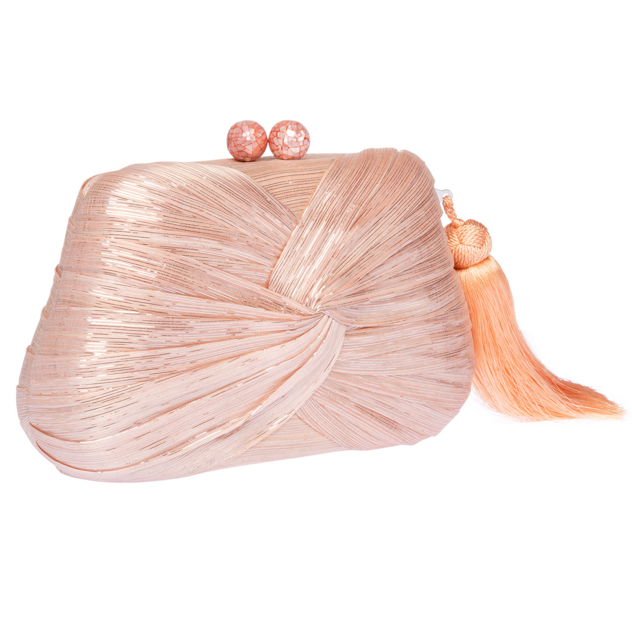 Clutch in peach abaca / silver lurex with draped front and silk tassel. Shell inlay closure, fully lined with drop in chain shoulder strap.