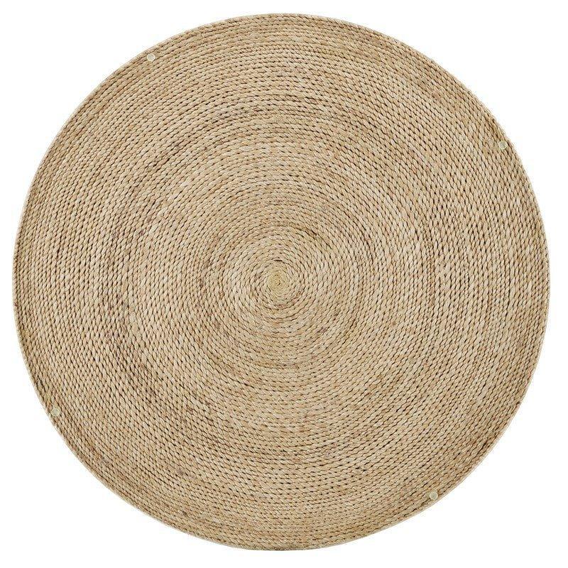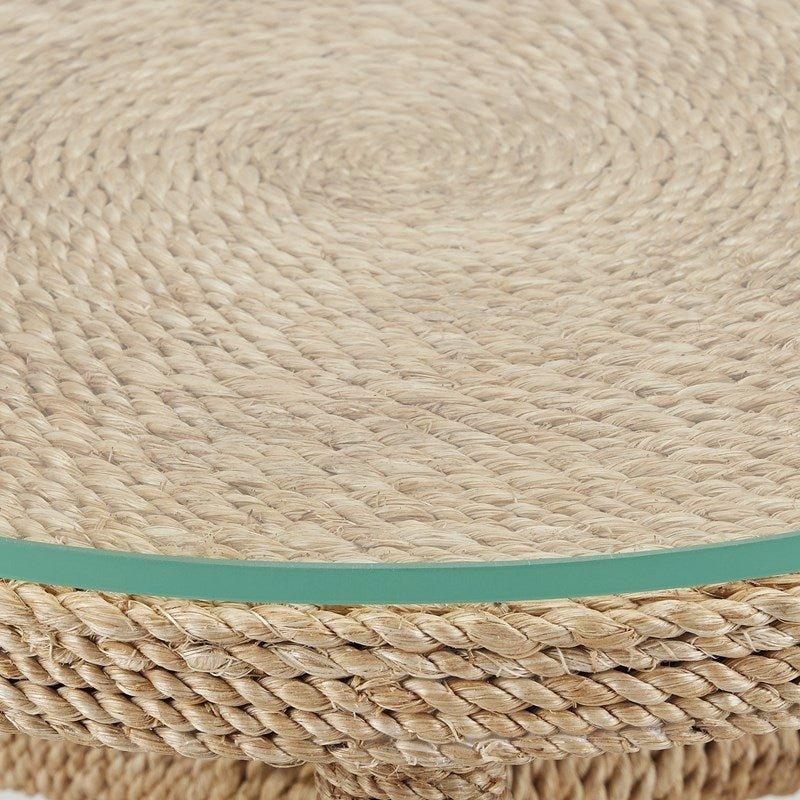 The wrought iron and wood frame of this accent table is wrapped in natural abaca rope. The precision with which artisans cover the vertical and horizontal lines and the disk elements on the rope accent table is accomplished with a painstaking focus that is a hallmark of refined handicrafts. The table is topped with a clear piece of glass to keep the top free from stains.