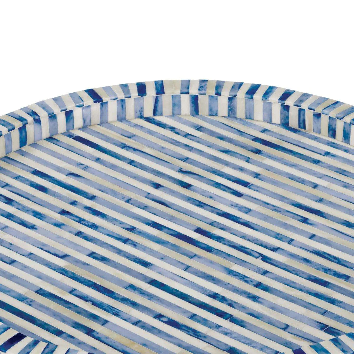 Individual pieces of natural and indigo-colored bone form this round tray, which is pretty enough to stand as an independent display in your living room or kitchen. Its color palette screams coastal, but this tray would also sing in a modern farmhouse interior. The tray measures 16" in diameter X 1.25"H. Click on images for greater detail.