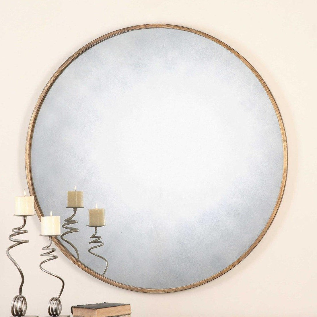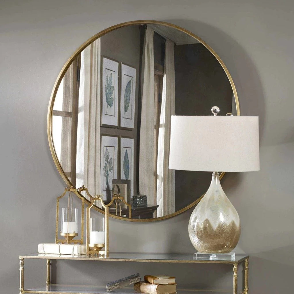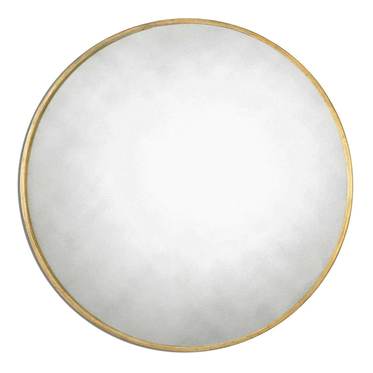 Narrow metal frame with a heavily antiqued gold leaf finish surrounds the antique style mirror.