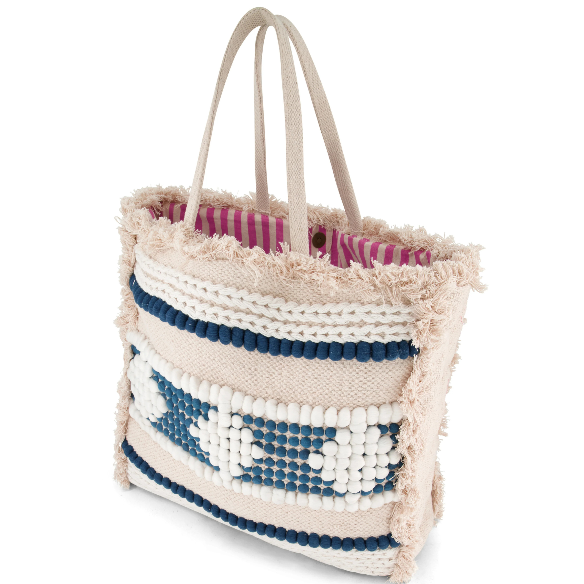 Enhance your beach style with the Saline Beach Tote. Handcrafted from hand-knotted cotton jute with boho-chic fringe, this oversized tote radiates luxury and class. The striped lining and interior pocket combine both functionality and elegance. Treat yourself to the ultimate beach accessory.