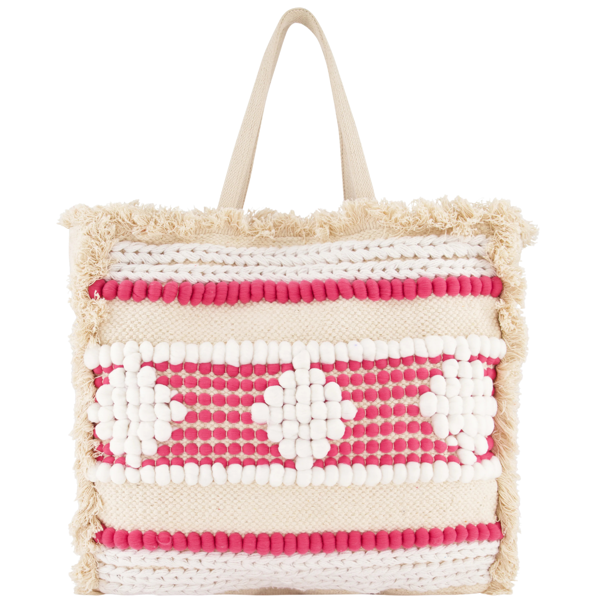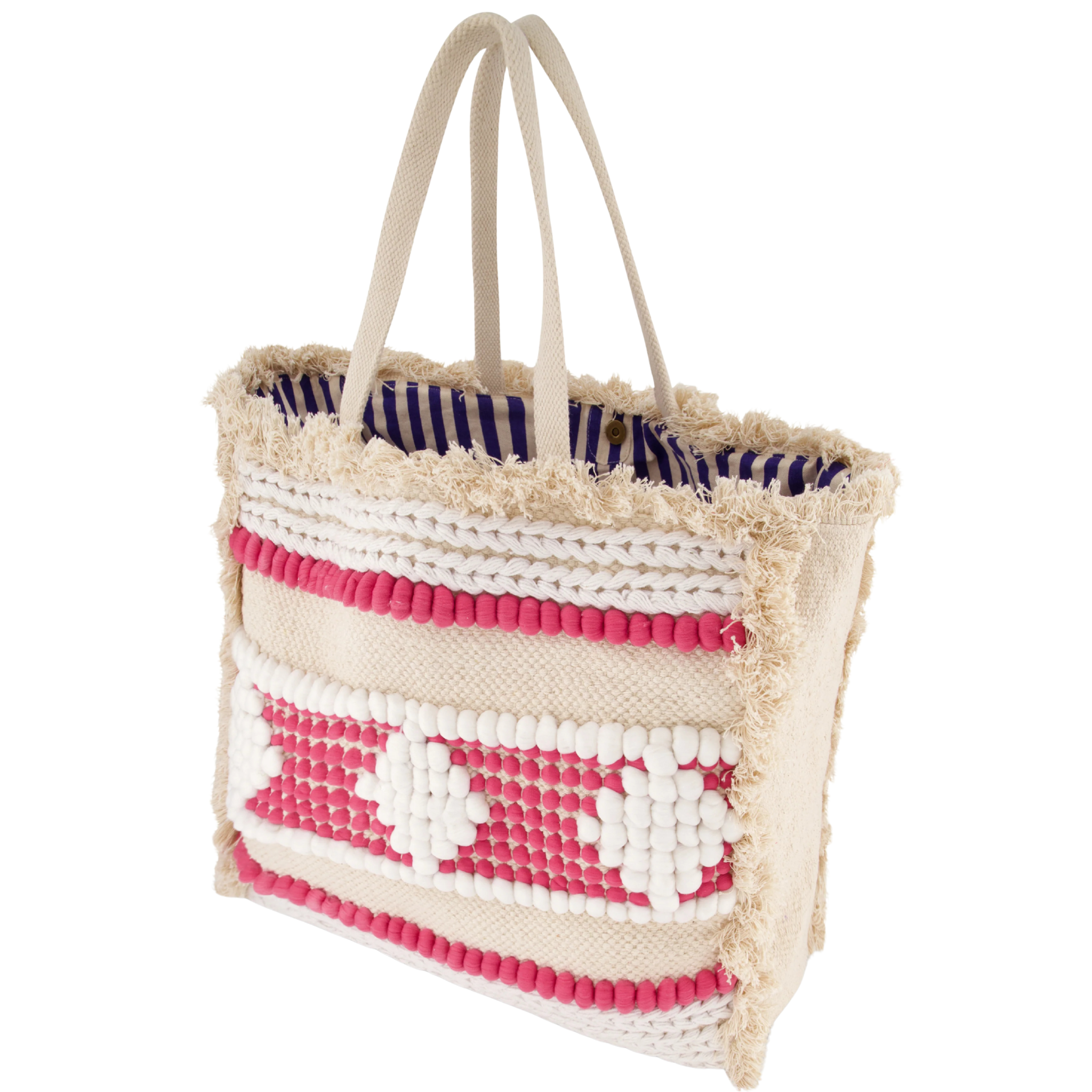 Take your beach style to the next level with the Saline Beach Tote. Handcrafted from hand-knotted cotton jute and adorned with boho-chic fringe, this oversized tote radiates both luxury and sophistication. With its striped lining and interior pocket, it blends practicality with elegance—making it the ultimate beach accessory. Click on images for greater detail.