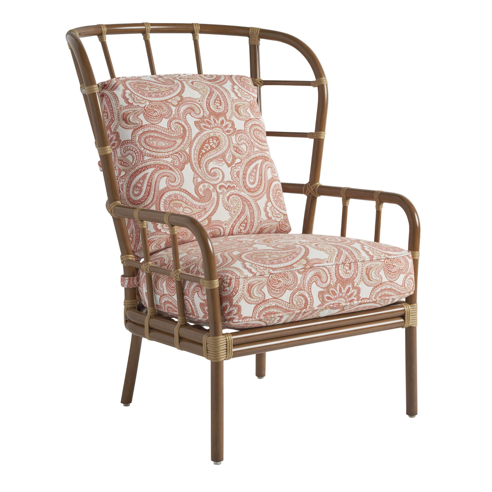 - Shown in an upholstered performance fabric with red paisley print