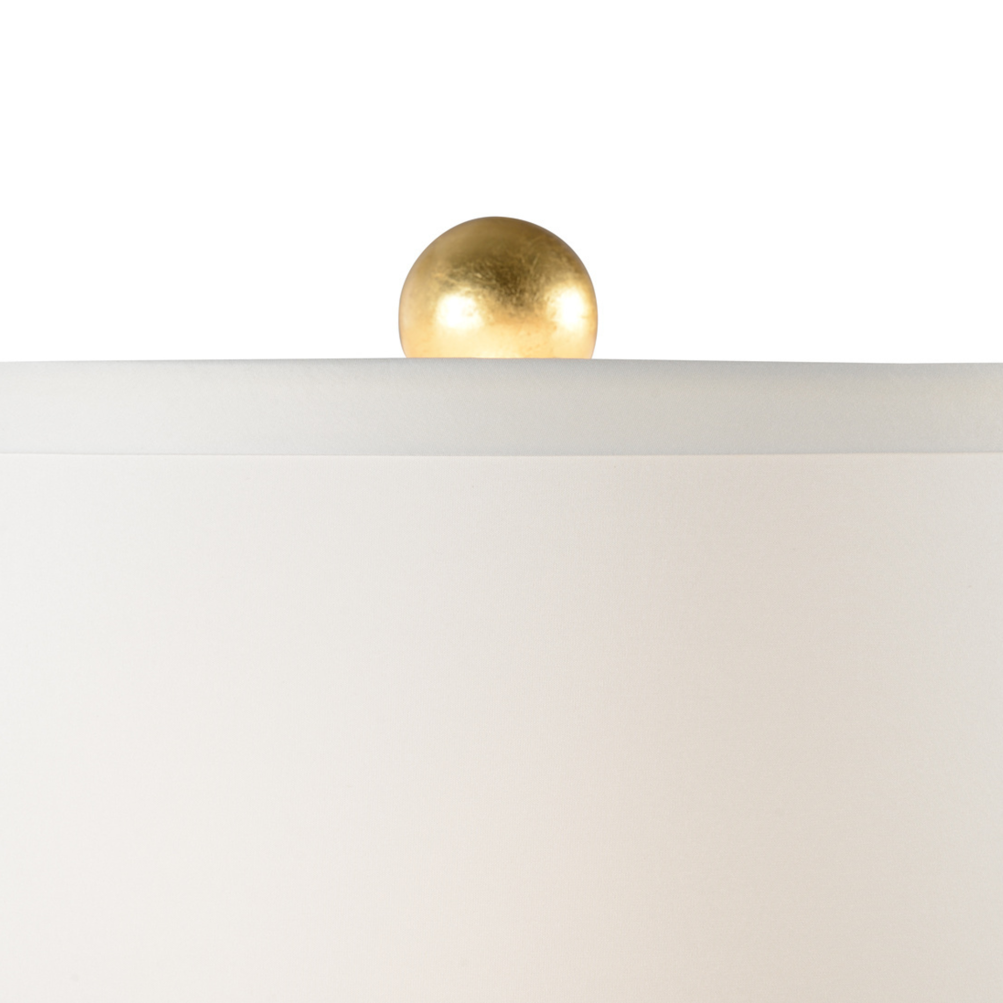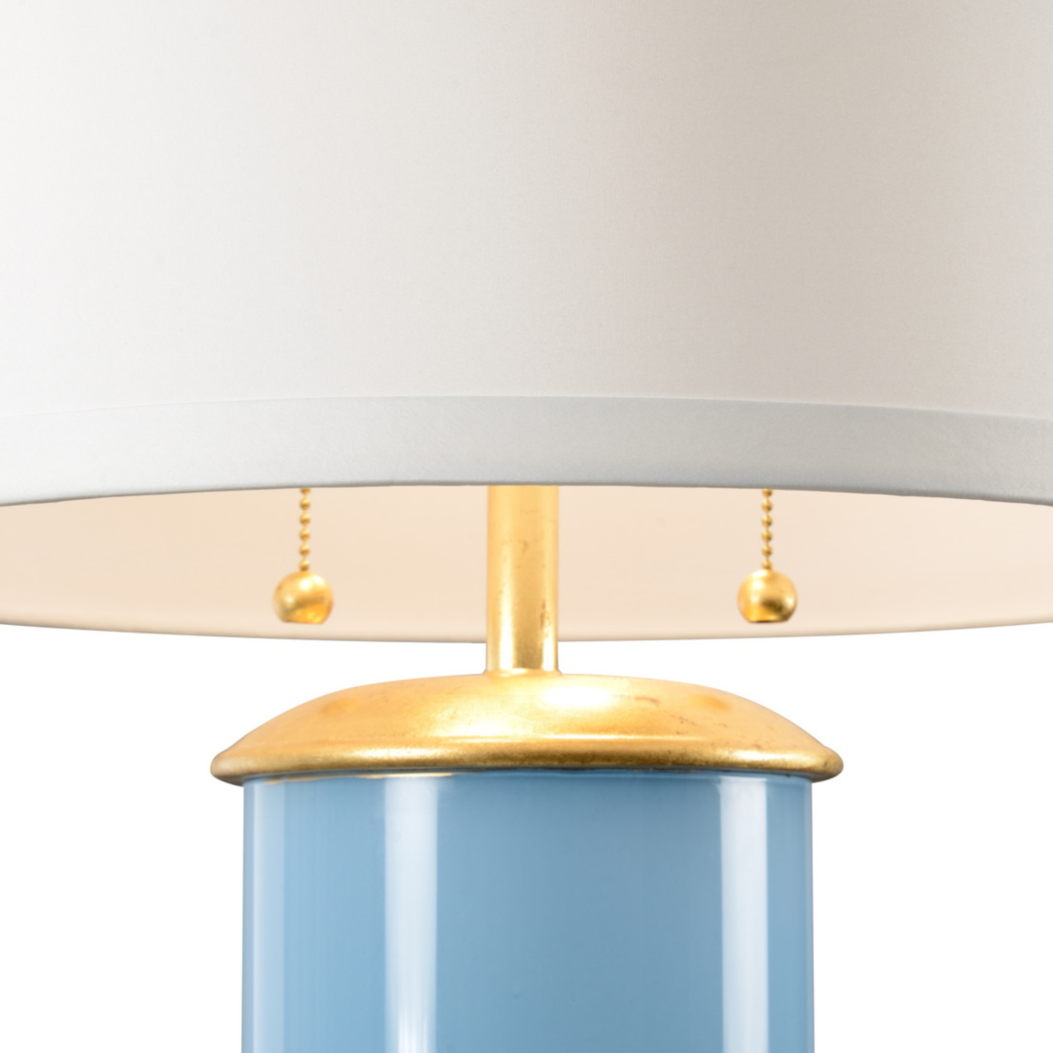 Brighten your home with this charming transitional table lamp. Savannah features a colorful glass cylinder with a dazzling gold leaf base and parts. A classic white silk drum shade completes the look creating a glamorous pop of color perfect for a bedroom, entryway or living room.