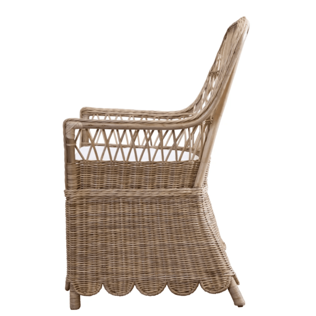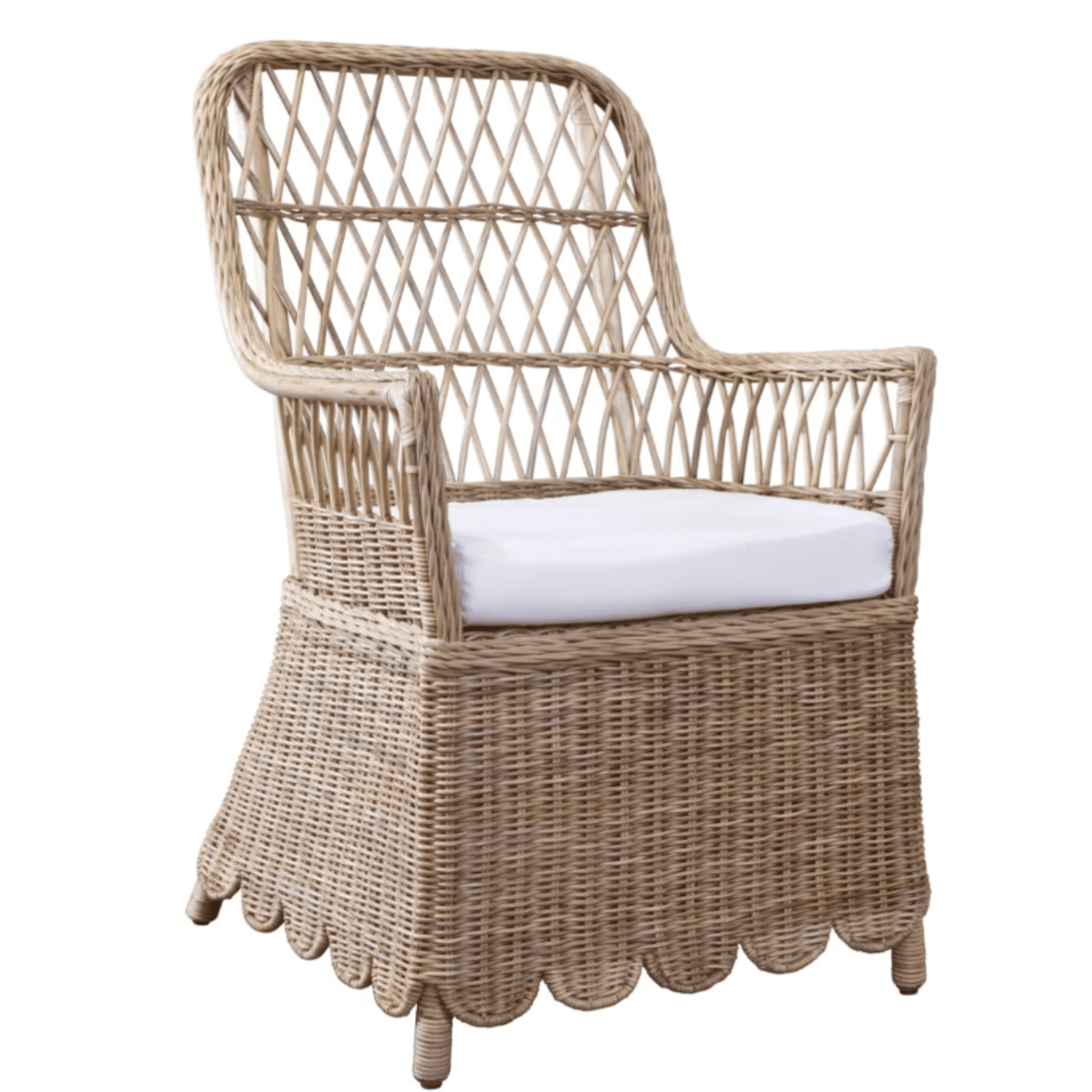 This chair features a scalloped edged skirt in handwoven wicker for chic & stylish seating in your kitchen, living area, covered porch & more!