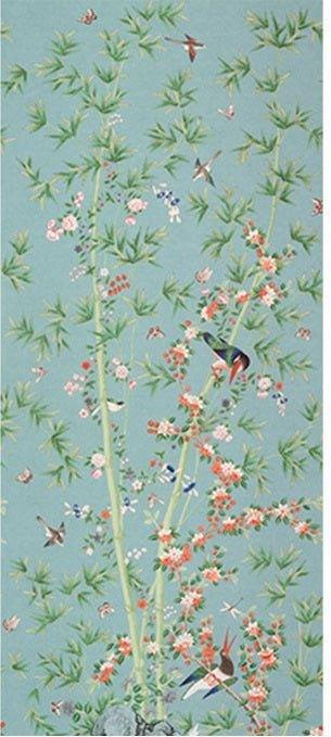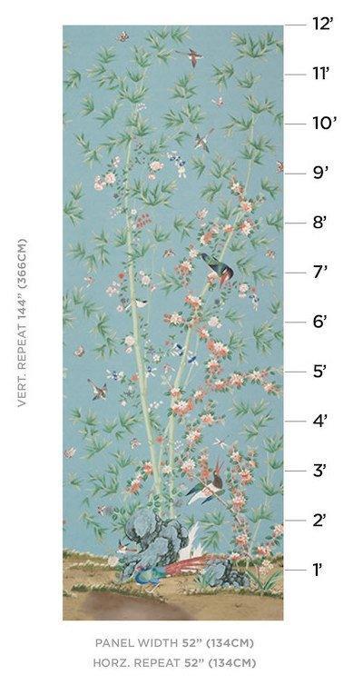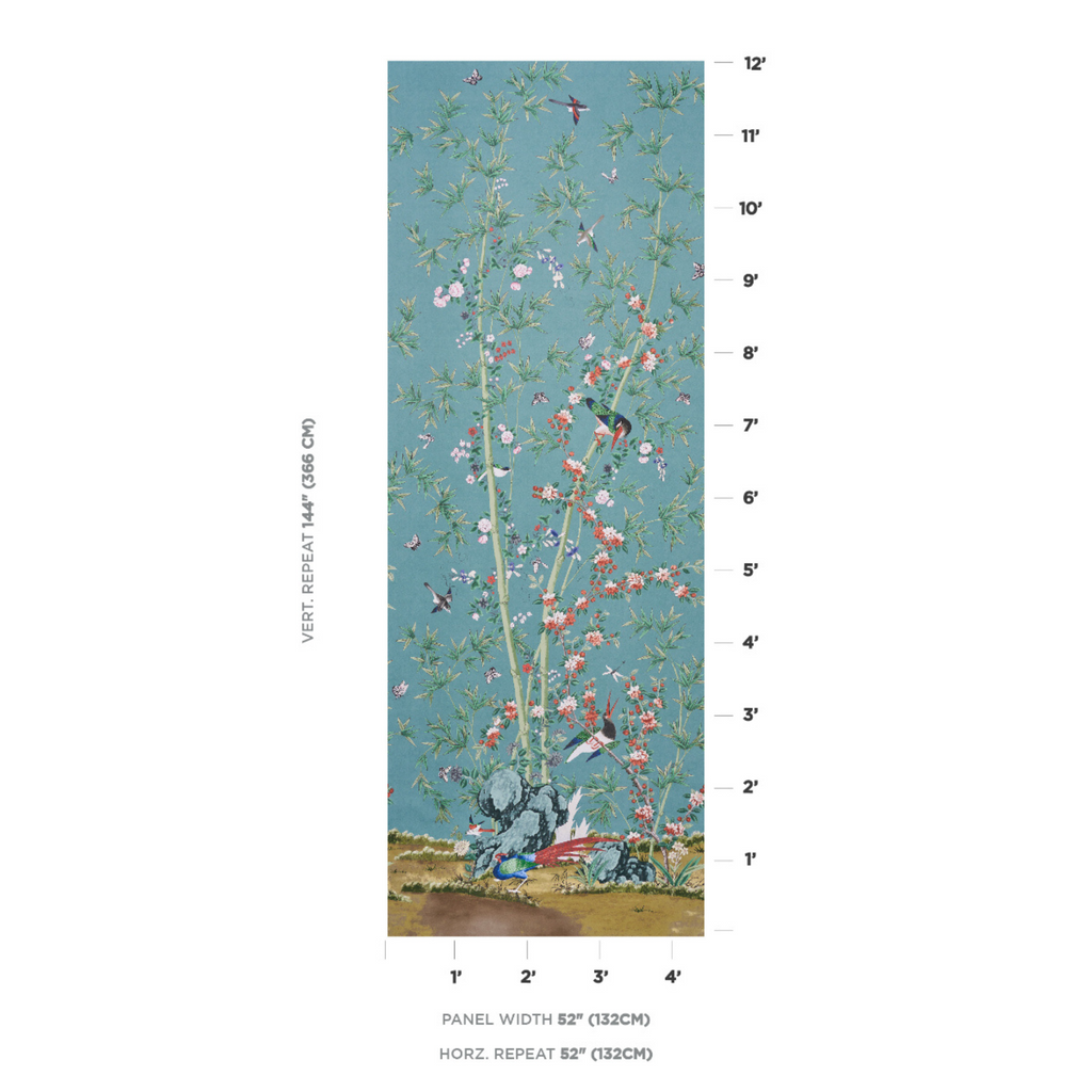 - The wallpaper panel measures 52 3/4"W with a horizontal repeart of 52 1/8" and a vertical repeat of 144".