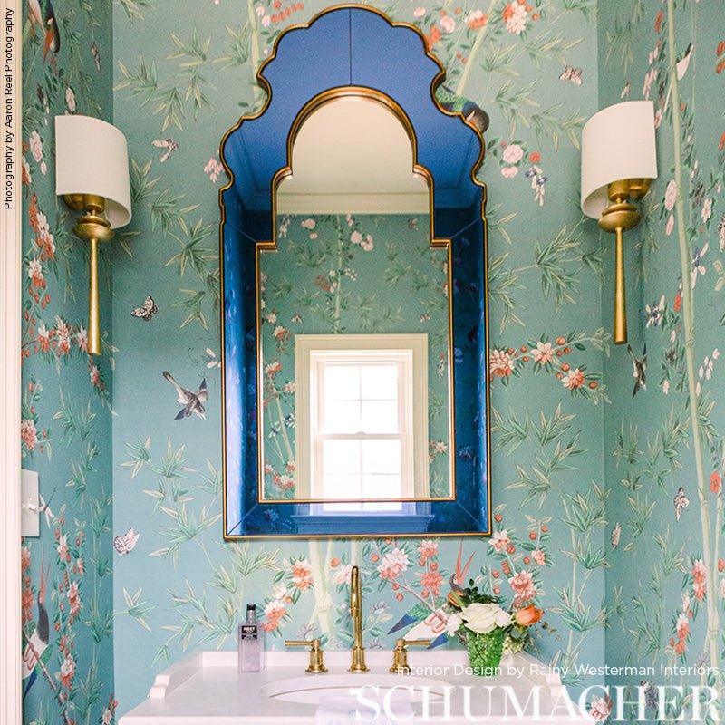 Based on a rare 18th-century document and created by one of Europe’s premier engravers, Brighton Pavilion in Multi Colors is a Miles Redd wallpaper with a 12-foot repeat that is available in coordinating panels of fabric.