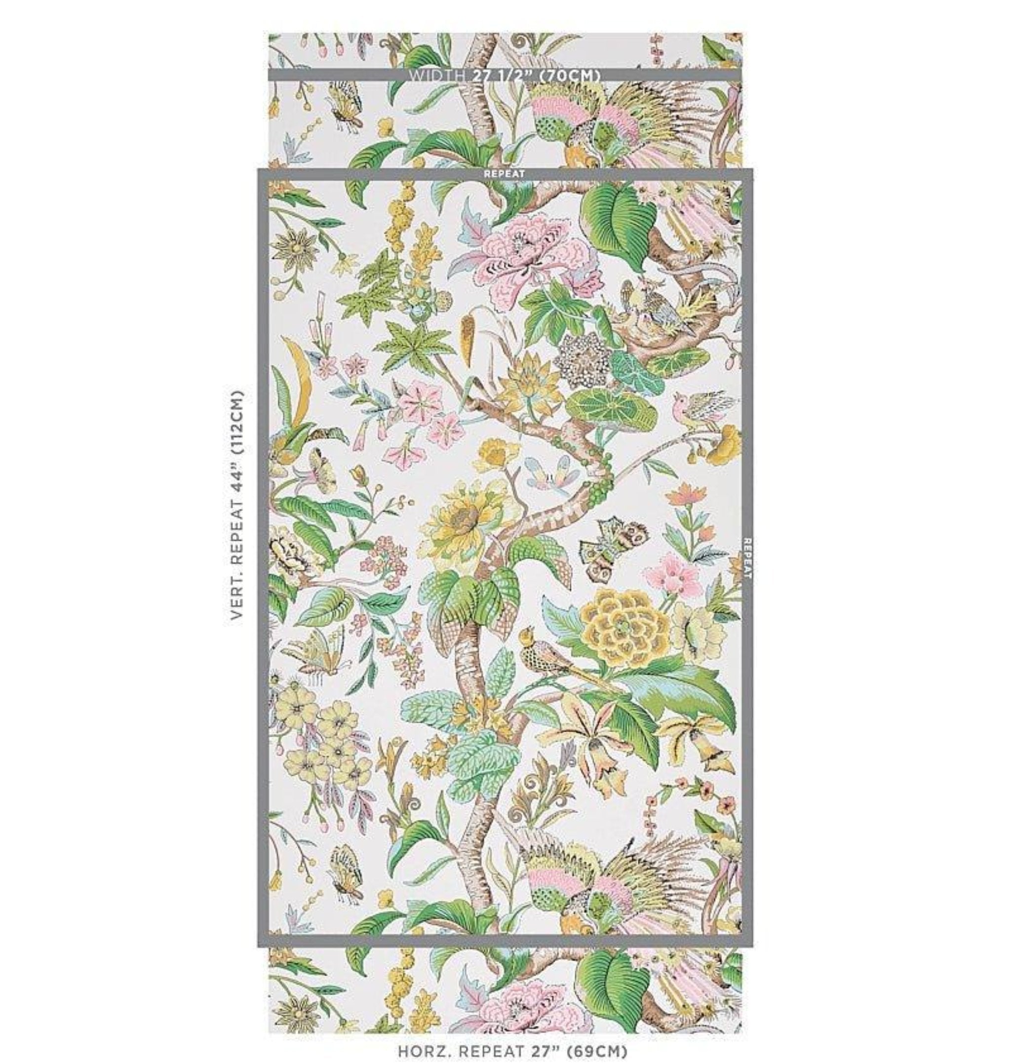 • The wallpaper measures 27 1/2" wide with a horizontal repeat of 27" and a vertical repeat of 44" with a half drop match.