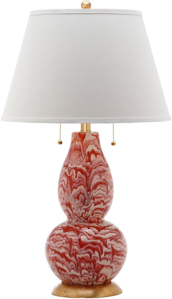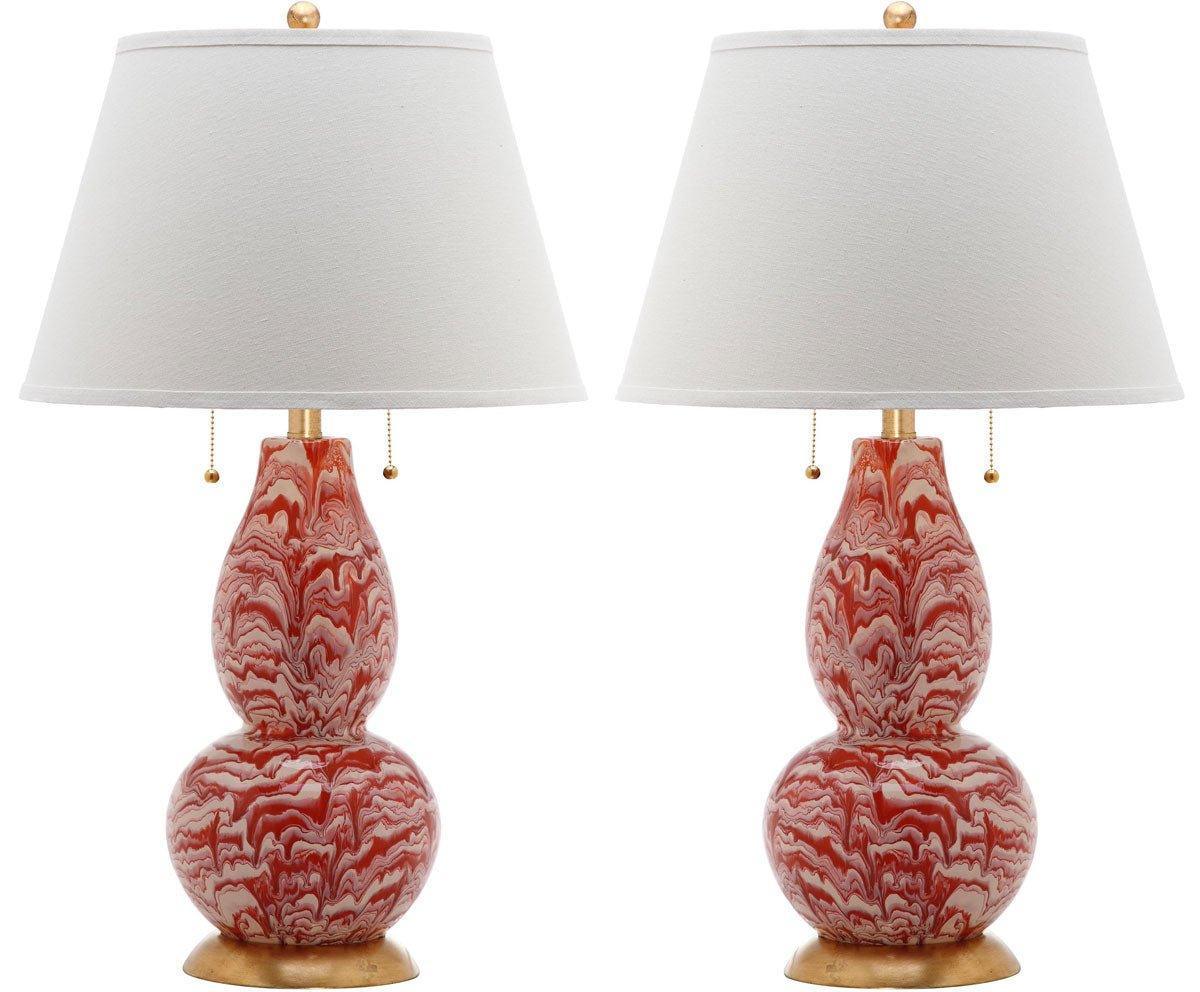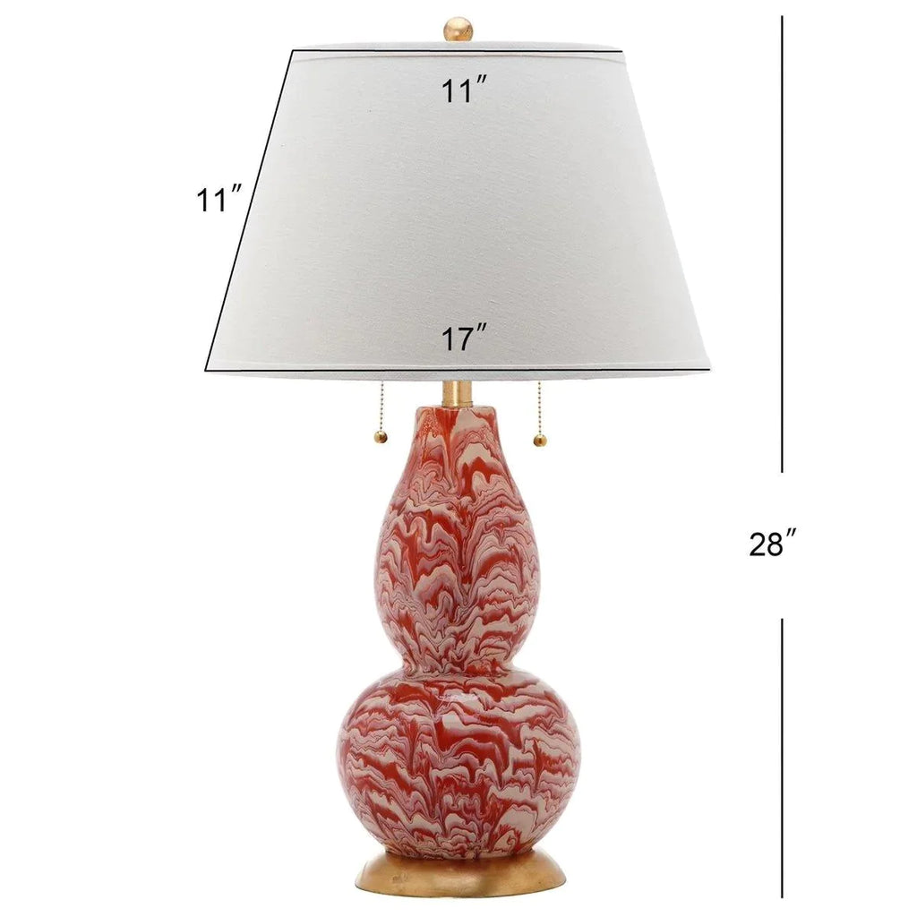 Dress up your home with the designer look of marble recreated in this elegant orange and white color swirls glass table lamp. Crafted of glass artfully painted in a marbleized effect, this set of lamps is accented with gold fittings and crisp cotton shade. Measures 17" x 17" x 28.5". Bottom base measures 7" X 7" X 1", lamp body measures 8" X 8" X 15", without shade measures 8" X 8" X 16". Switch type is on/off 100w. Click image for greater detail.