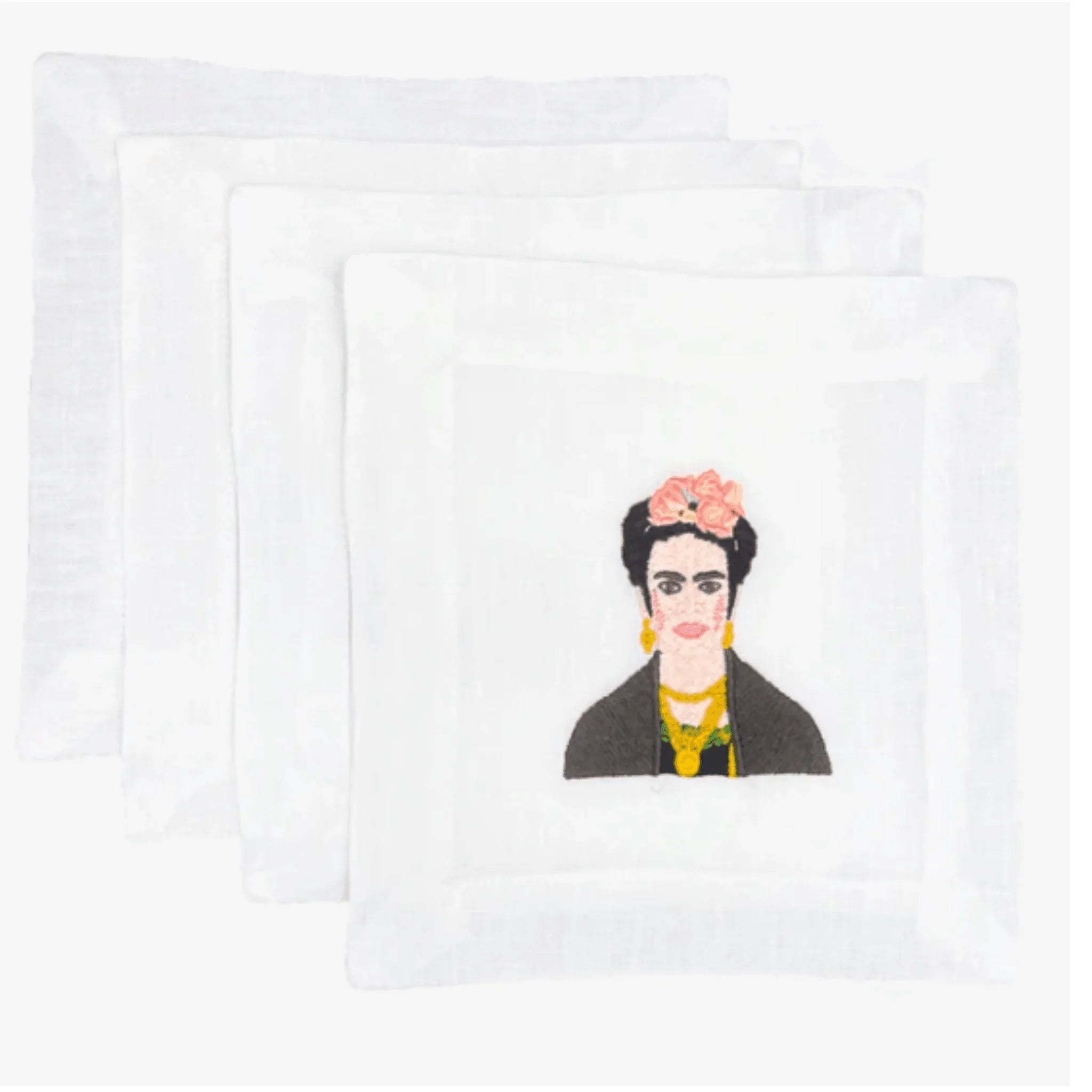 Calling all art enthusiasts! A fun and unique birthday or hostess gift, sure to be a conversation starter at any cocktail party. Set of 4 pure linen cocktail napkins embroidered with our rendition of Frida Kahlo!