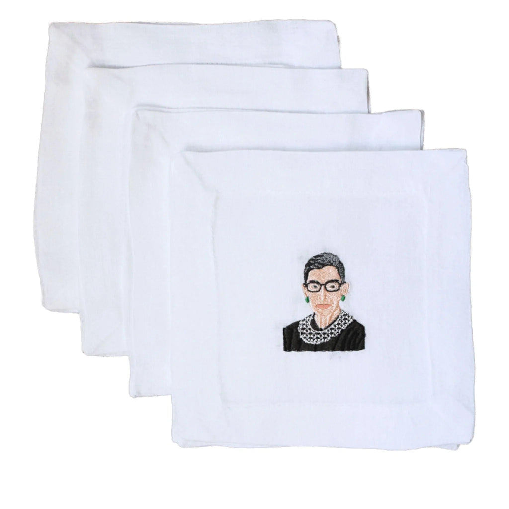 Set of 4 pure linen cocktail napkins embroidered with our rendition of Ruth Bader Ginsburg!