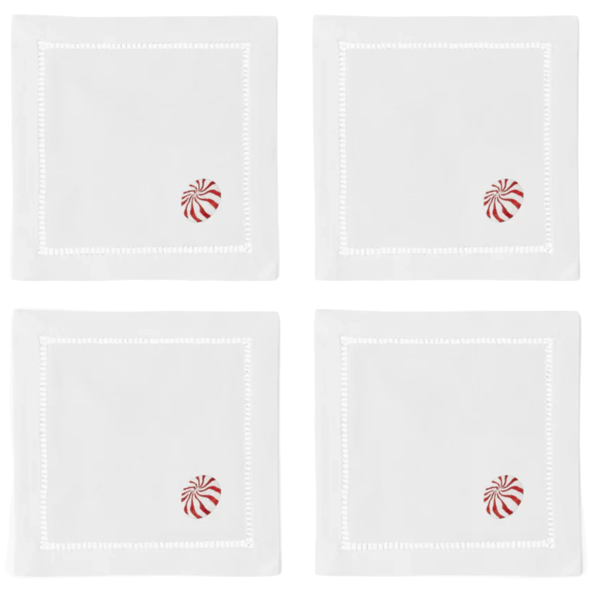 Add festive cheer to your holiday party or surprise your hostess with these lovely Peppermint Candy cocktail napkins. Please note this item is sold in sets of four. Hand-embroidered, finished and hemstitched by hand. Click image for greater detail.
