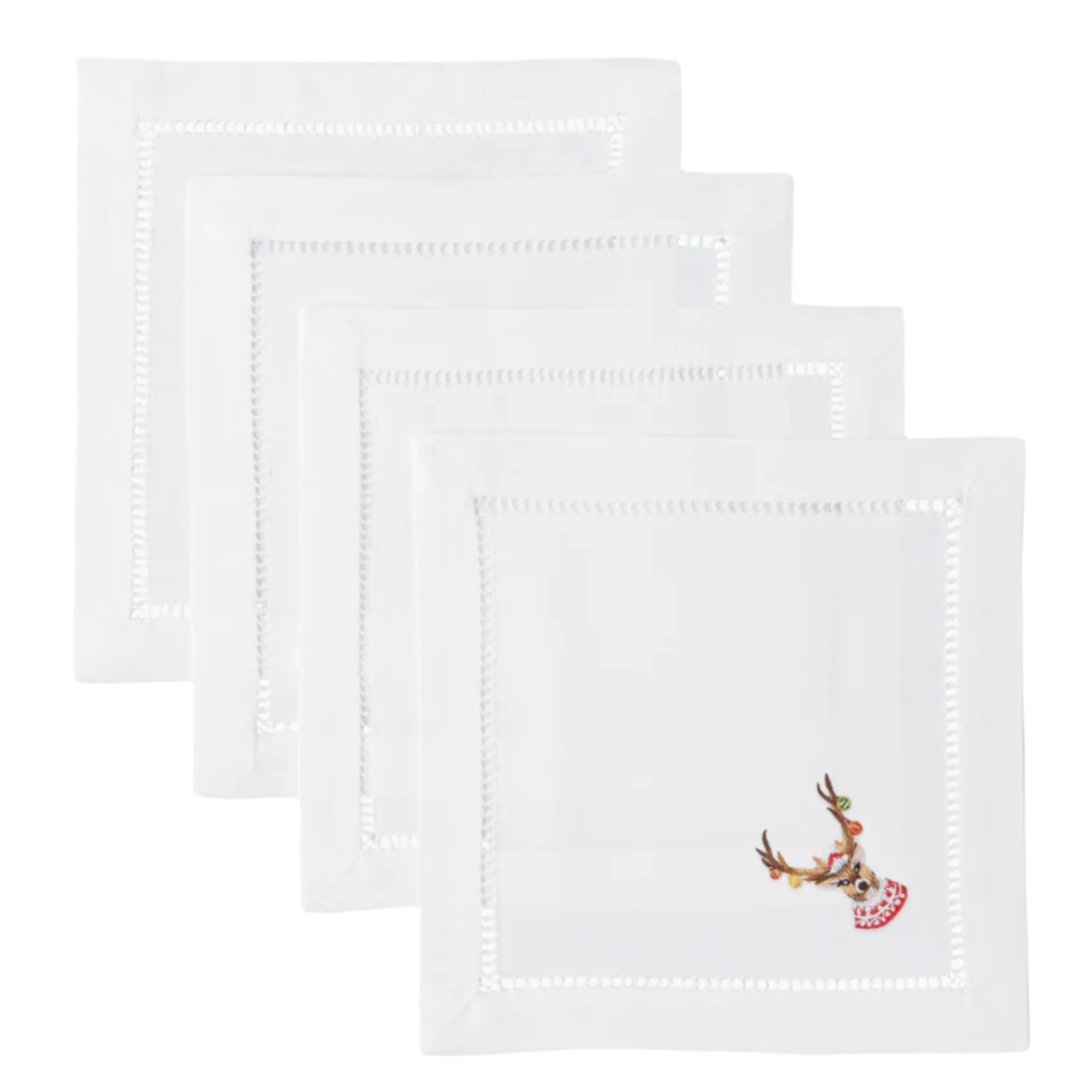 Add festive cheer to your holiday party or surprise your hostess with these lovely Ornament Antler cocktail napkins. Please note this item is sold in sets of four. Hand-embroidered, finished and hemstitched by hand. Click image for greater detail.