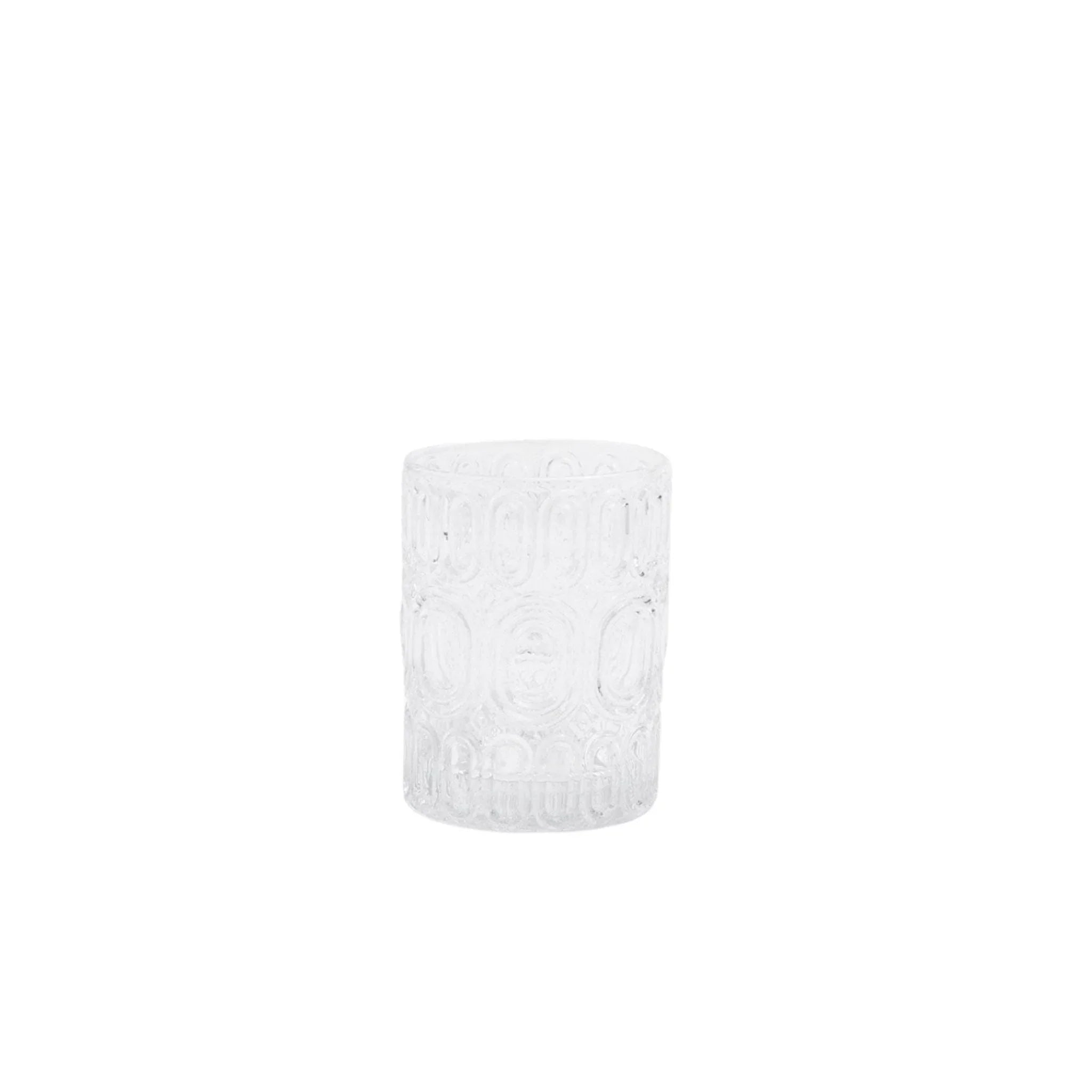 A ’70s-inspired bangle pattern jazzes up this simple set. Use Aaron’s clear collection to serve any beverage you please—it makes everything look good. Dishwasher safe.