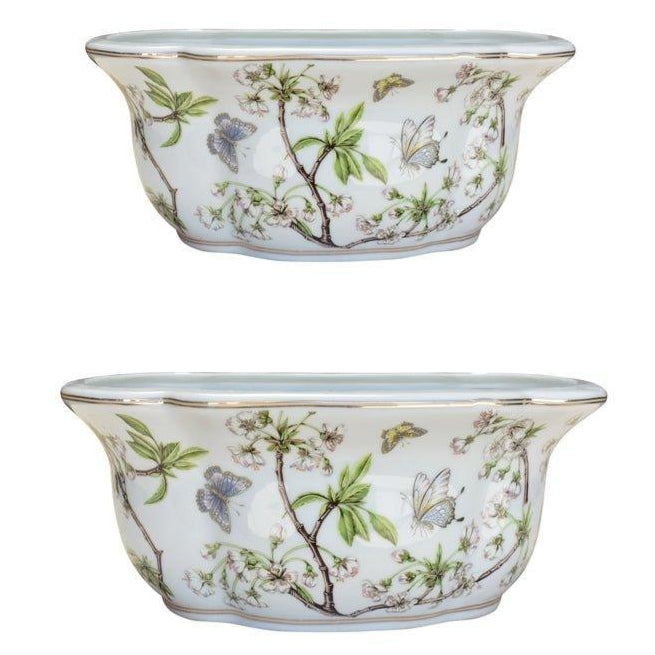 This lovely set of two oval porcelain planters feature a beautiful cherry blossom pattern. The smaller planter measures 13"W X 10.75"D X 5.5"H and the larger planter measures 14.5"W X 12"D X 6"H. The planters can be used indoors or outdoors. Shade and color variations are intrinsic to the beauty of handmade items and are not a product defect. Each product is unique, and the product photo shown represents one, but colors can vary. Click on images for greater detail.