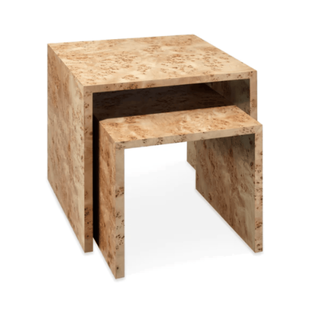 This collection of furniture pieces in burl wood veneer elevates the simple, sophisticated lines of a Parsons silhouette with the natural, organic pattern of burl wood. Finished in a soft natural stain, this set of two nesting tables adds a subtle elegance to any space. The burl wood veneer is hand applied and each piece is uniquely different. Finish may vary. Click images for greater detail.